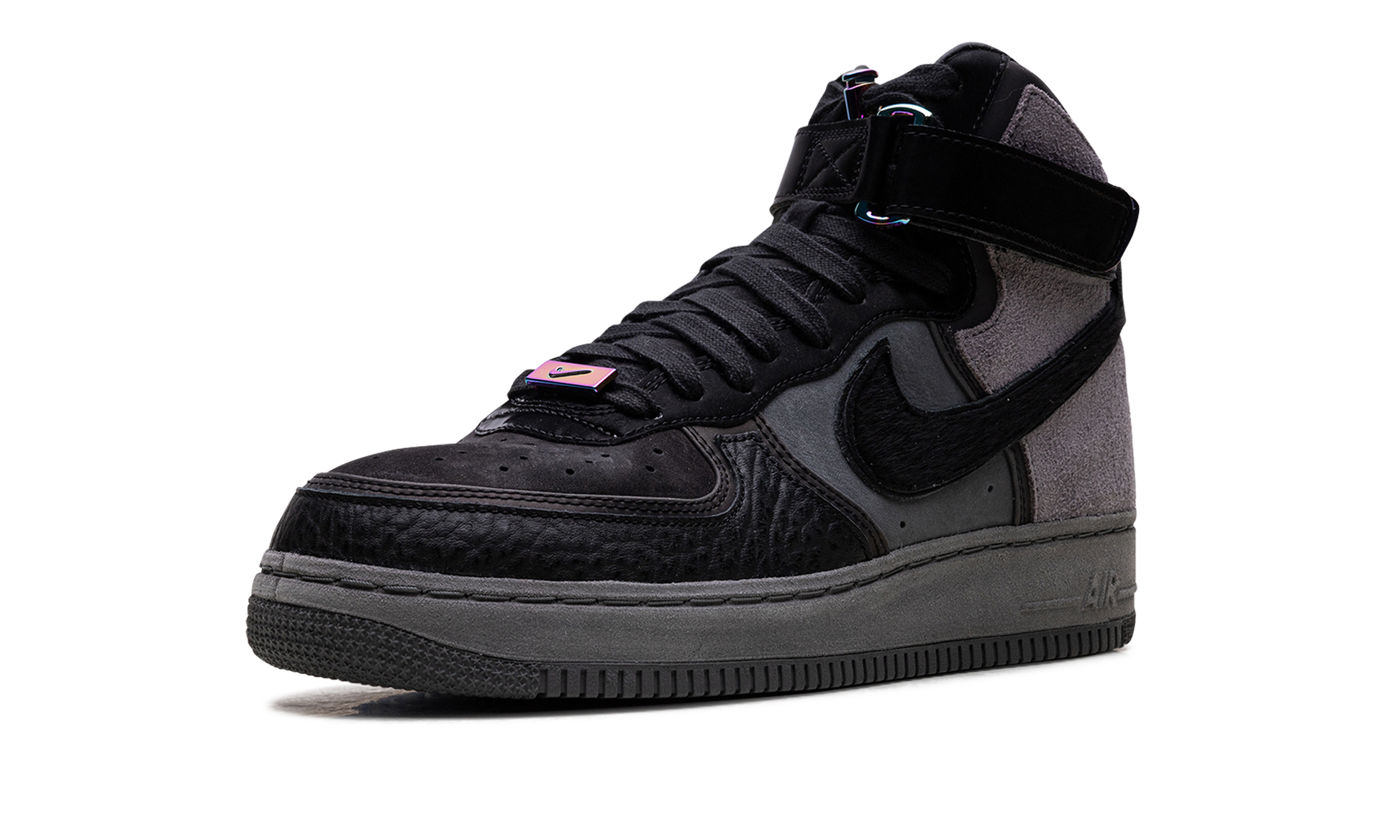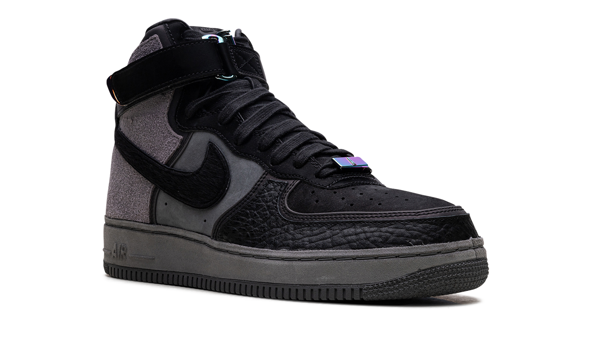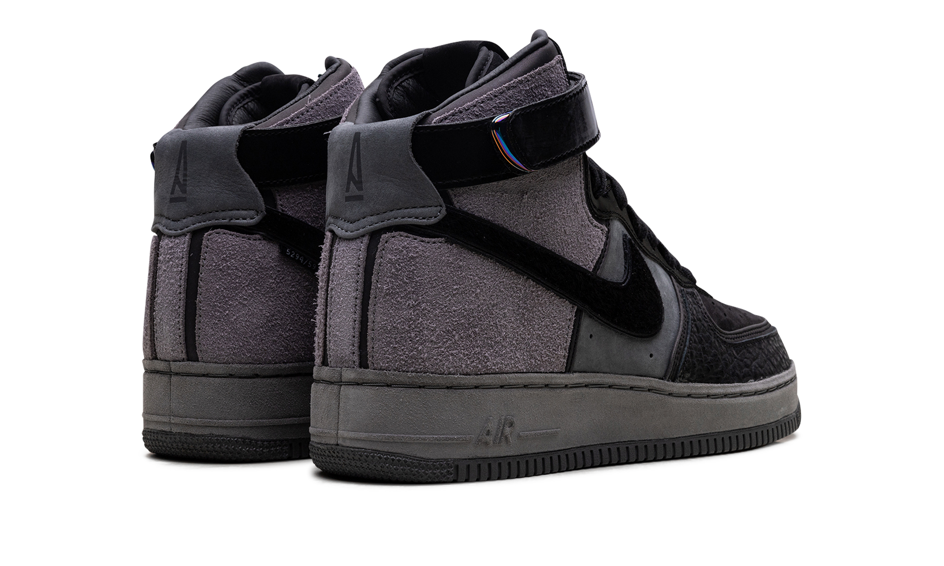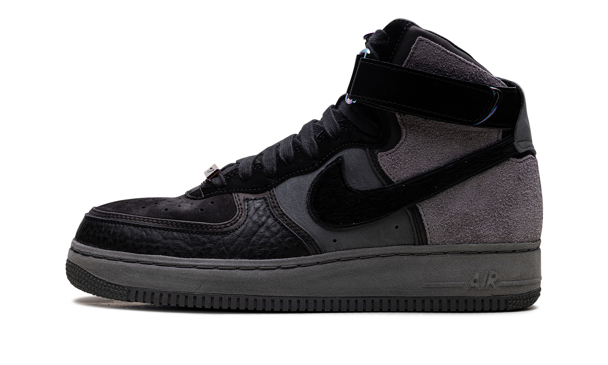 The A Ma Maniére x Nike Air Force 1 High “Hand Wash Cold” is a high fashion-leaning collaboration between the Washington D.C. retailer and Nike on the classic high-top shoe. Dealing with fine goods and materials, the “Hand Wash Cold” colorway is an ode to premium materials and their delicate care. A Ma Maniére presents their collaborative offering with a black leather toe cap and black nubuck perforated toe. A dark grey leather mid-panel features a black leather Swoosh that is contrasted by a grey woolly suede heel. Iridescent Nike lace locks appear at the throat of the shoe with an adjustable black nubuck ankle strap pulling the shadowy look together. The A Ma Maniére x Nike Air Force 1 High “Hand Wash Cold” released in extremely limited quantities on December 7, 2019. A Ma Maniére - Hand wash Cold