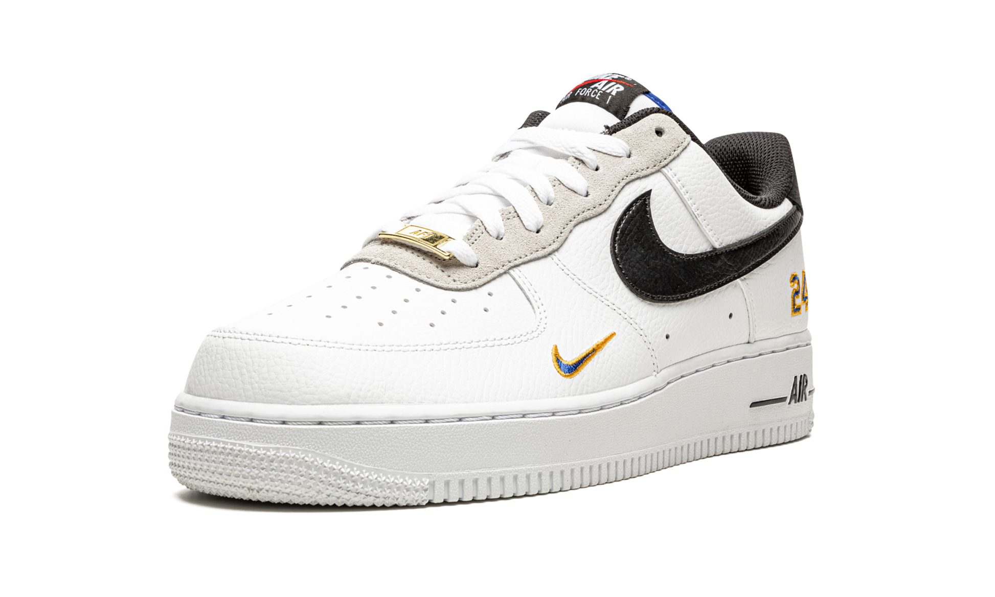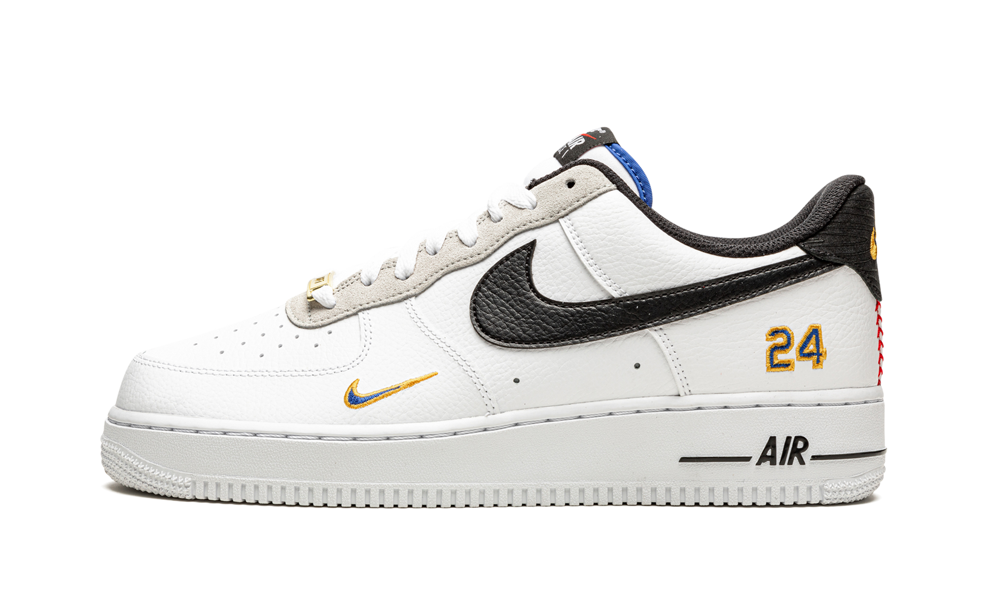 The Nike Air Force 1 Low “Ken Griffey Jr./Sr.” is a colorway of the low-top shoe that honors the baseball legacies of Ken Griffey Jr. and his father, Ken Griffey Sr. Memorably, the father-son duo briefly played together on the Seattle Mariners while the younger Griffey was in the early stages of his illustrious career. This “Ken Griffey Jr.” Air Force 1 pays homage to the era in Mariners history with baseball-inspired branding and graphics. The upper features a white leather construction. A black tumbled leather Swoosh can be found on both sides and “Nike Air Force 1” branding can be found on the black nylon tongue tag. A small teal Swoosh with yellow outlining is embroidered on the forefoot. The design features the Mariners' then-team uniform colors of blue and yellow. “24” and “30” embroidery on the lateral heel of the left and right shoe, respectively, represent the numbers worn by Griffey Jr. and Griffey Sr. with the Mariners. Additionally, “Jr.” and “Sr.” branding appears on the back of the left and right heel tabs that feature the aforementioned numbers. Baseball-inspired red stitching appears on the heel and completes the look. Ken Griffey Jr./Sr.