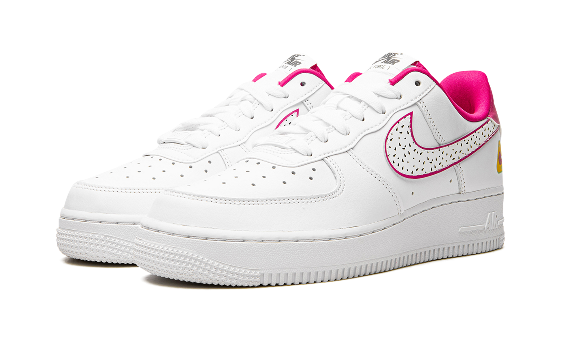The Women’s Nike Air Force 1 Low LX “Dragon Fruit” is the women’s-sizing of the popular shoe in a colorway inspired by the delicious fruit. Nike’s celebration for the Air Force 1’s 40th anniversary includes releasing the shoe in a variety of intriguing colorways, such as the “Dragon Fruit,” which features details inspired by the American fruit. Most notably, the Swoosh logo on either side of the white leather base is complete with seed-like details that mimic the seeds found on the inside of the fruit. Other elements inspired by the Dragon Fruit include a graphic on the lateral heel, and produce-friendly “stickers” on the sockliner. The shoe is packaged in a knit bag that doubles as a shopping bag for produce. Dragon Fruit nutrition facts are found on the underside of the tongue. Dragon Fruit