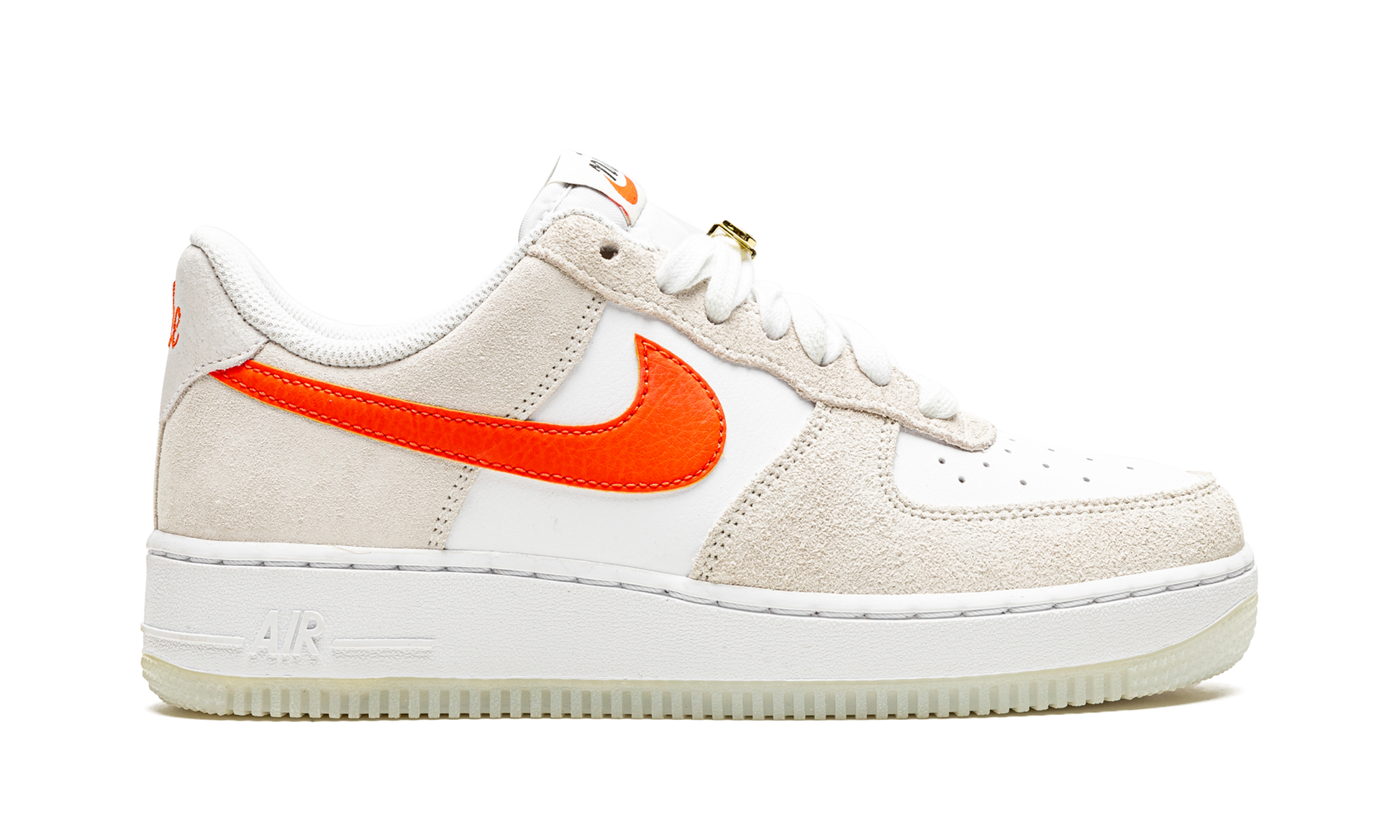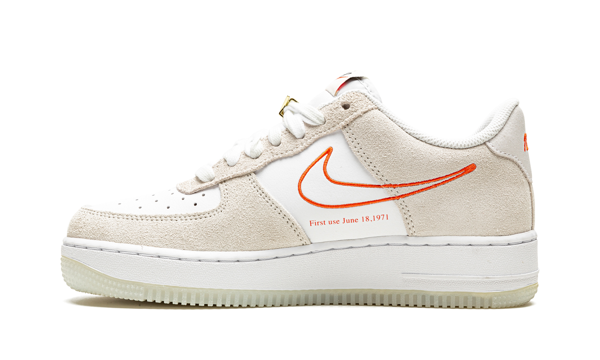 The Women’s Nike Air Force 1 Low SE “First Use” shows respect to the brand’s iconic Swoosh logo with unique, vintage-inspired branding. A June 2021 release by Nike, this women’s edition of the former basketball shoe references the famous Nike logo with special “First Use June 18, 1971” text below a white outline Swoosh on both sides. More “1971” detailing also appears on the insoles and a decidedly retro orange “Nike” logo is embroidered onto the heel. A classic “Nike” insignia with an orange Swoosh is found on the white nylon tongue tag. A gold Swoosh lace dubrae is incorporated in the design of the white shoe laces. Nike situates a blazing orange leather Swoosh on the lateral side of the shoe. White leather can be found on the perforated toe and mid-panel. Contrasting Light Bone suede overlays on the forefoot, eyelets, collar, and heel, complete the look. Release date: June 18, 2021 First Use