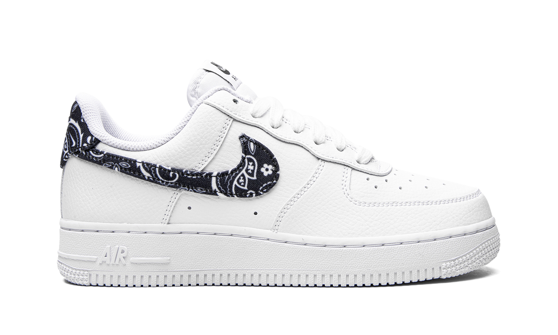 The Women’s Nike Air Force 1 Low “Black Paisley” is a women’s only colorway of the vintage basketball shoe that incorporates a unique paisley pattern on its design. Based on the Air Force 1’s timeless “White on White” colorway, the “Black Paisley” features a mostly monochromatic white leather design, with white leather on the perforated toe, mid-panel, collar, and heel. A contrasting, black-based paisley print appears on the canvas Swoosh and heel with “Nike Air” branding. The white nylon tongue tag in the white nylon tongue sports black “Nike Air Force 1” insignia. A tonal “AF1” lace dubrae is found on the vamp. Underfoot, a solid white rubber sole completes the look. Black Paisley