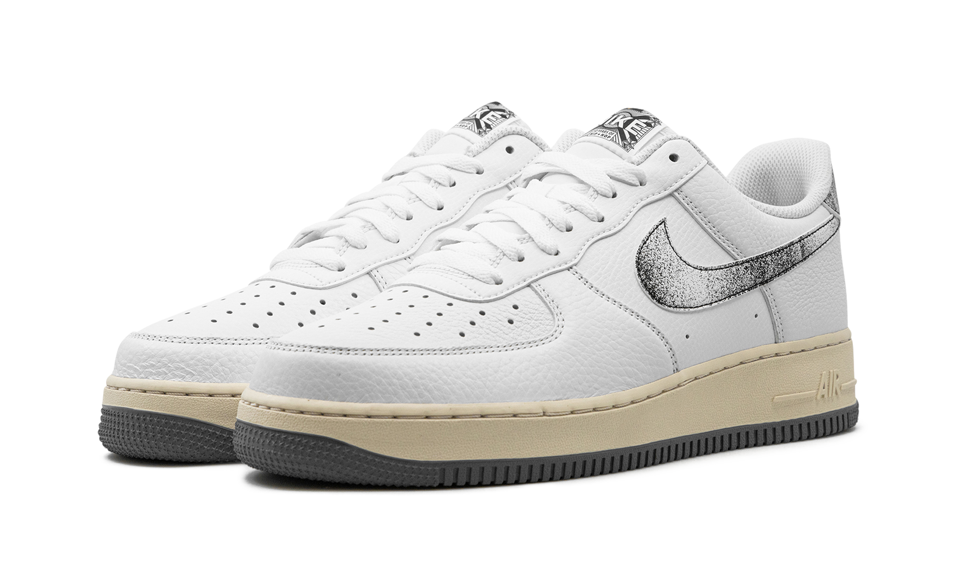 The Nike Air Force 1 Low “Classics” is a colorway of the retro basketball shoe that honors hip-hop’s 50th anniversary. Originating in New York City in the 1970s, hip-hop is one of the most influential music genres of all time. The “Classics,” otherwise known as the “50 Years of Hip-Hop” Air Force 1 Low celebrates hip-hop culture’s legacy with special details inspired by the music genre. The shoe features a white leather base with tonal leather overlays and a black Swoosh with a spray-paint-like effect on the sides. The insoles feature a “Parental Advisory” style graphic while cassette-tape-inspired detailing is found on the tongue tag. An aged midsole gives the shoe a decidedly retro appearance. Release date: May 30, 2023 Classics