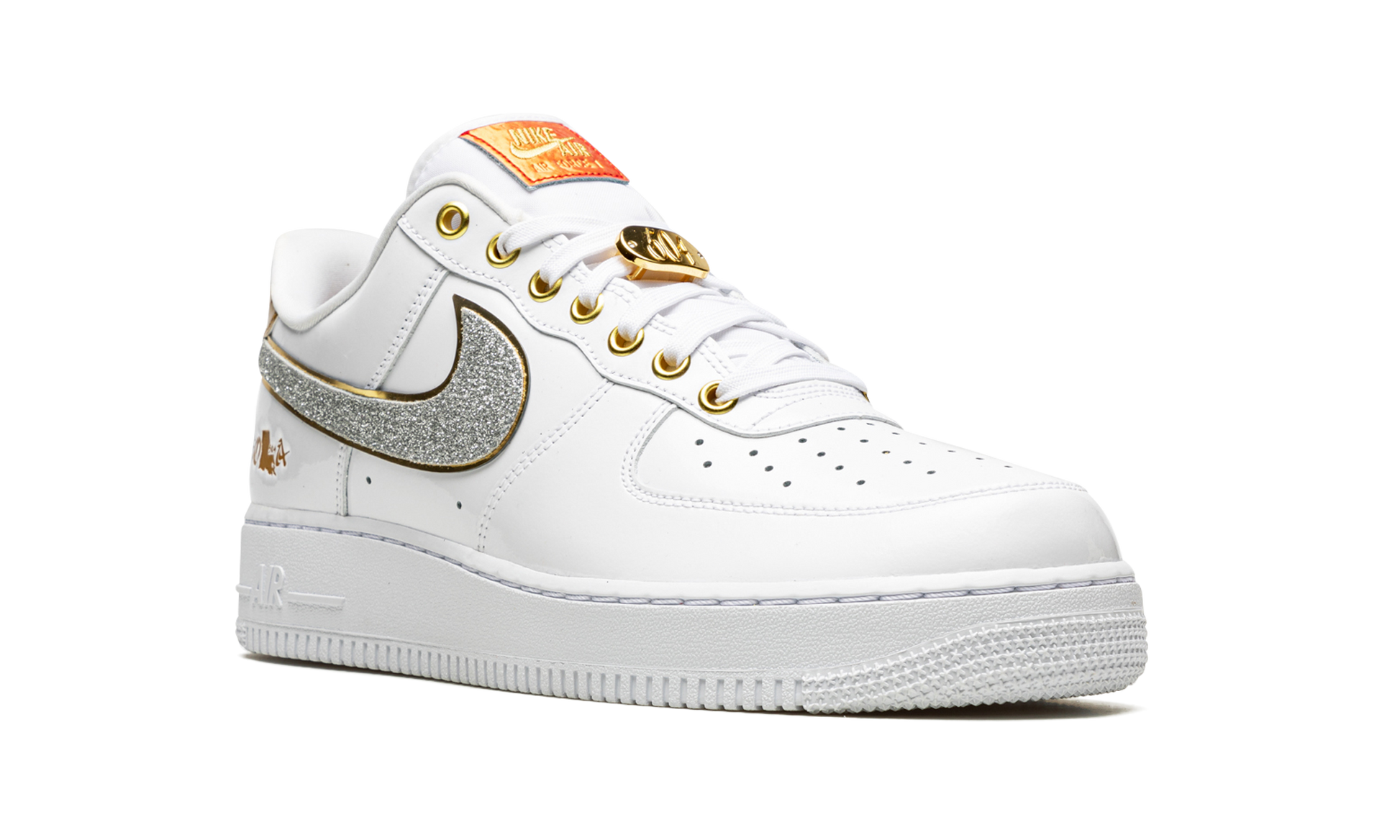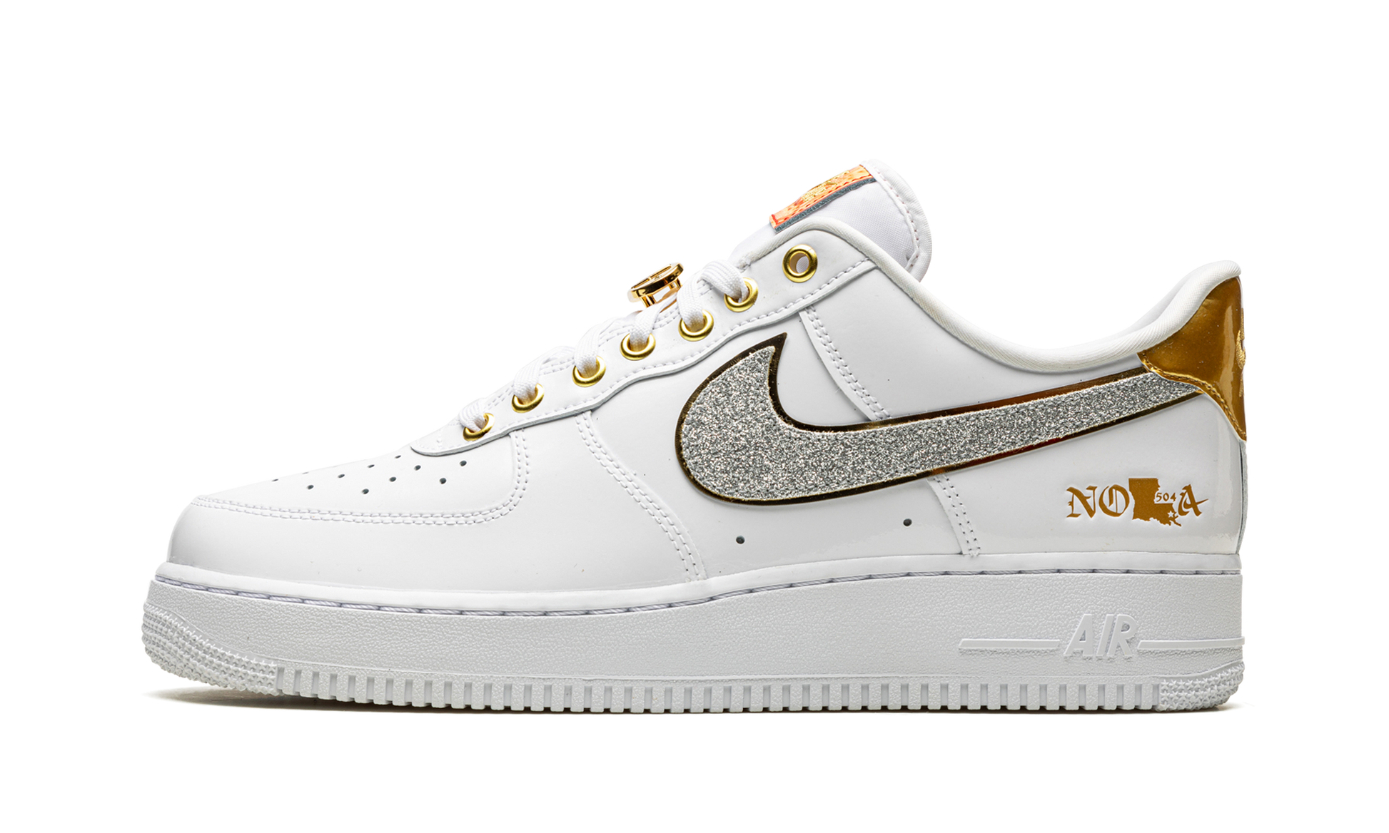 The Nike Air Force 1 Low “NOLA” is a colorway of the popular shoe that celebrates New Orleans’ vibrant culture. Nike celebrated the Air Force 1’s 40th anniversary in 2022 by releasing the shoe in a variety of colorways, including a collection of styles dedicated to cities like Houston and New Orleans. The head-turning design for New Orleans dons a white leather upper with Shimmering Silver Swooshes on the sides that show love to the “Pen & Pixel” style font found on hip-hop album covers by a variety of New Orleans’ rappers. Unique Metallic Gold “NOLA” branding appears on the lateral side of the heel. Additional Metallic Gold accenting is found on the “Nike Air” branded heel tab and “504” lace dubrae. New Orleans is also honored on the tongue tag with a gradient sunrise design. Release date: November 2, 2022 NOLA