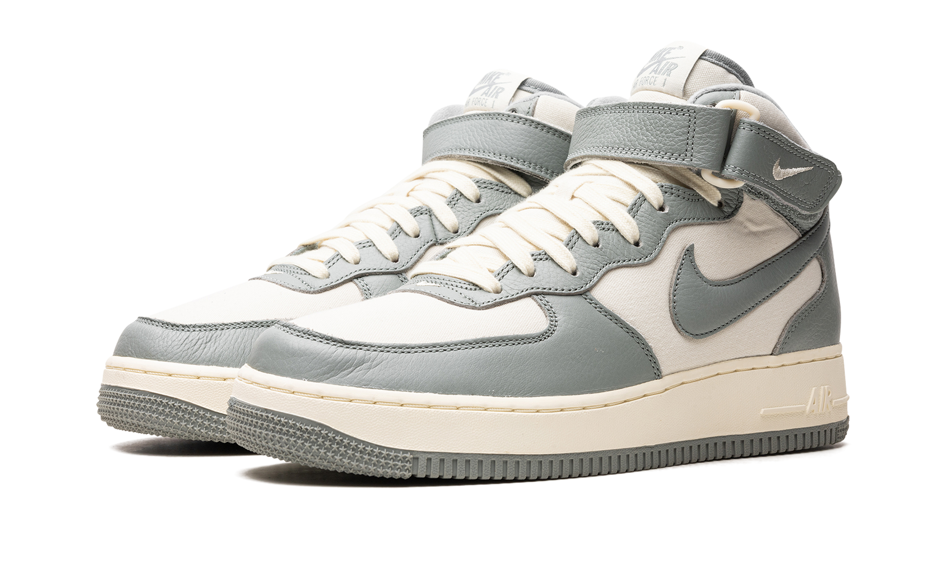 The Nike Air Force 1 Mid "Mica Green" is a clean colorway of the classic lifestyle shoe with vintage-inspired details. The sneaker features a Coconut-Milk-colored canvas base with Mica Green leather overlays and Swoosh branding. Mica Green leather also lands on the adjustable ankle strap. Vintage-inspired Coconut Milk laces match the tongue and Swoosh embroidery on the side of the strap. Green “Nike Air Force 1 Mid” branding appears on the tongue tag. Underfoot, the cream rubber midsole gives this version of the Air Force 1 Mid an old school, aged look. Release date: April 25, 2023 Mica Green