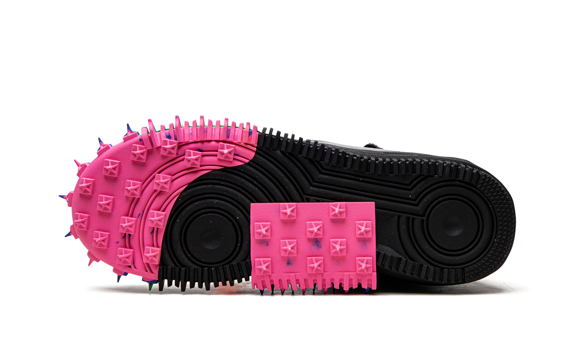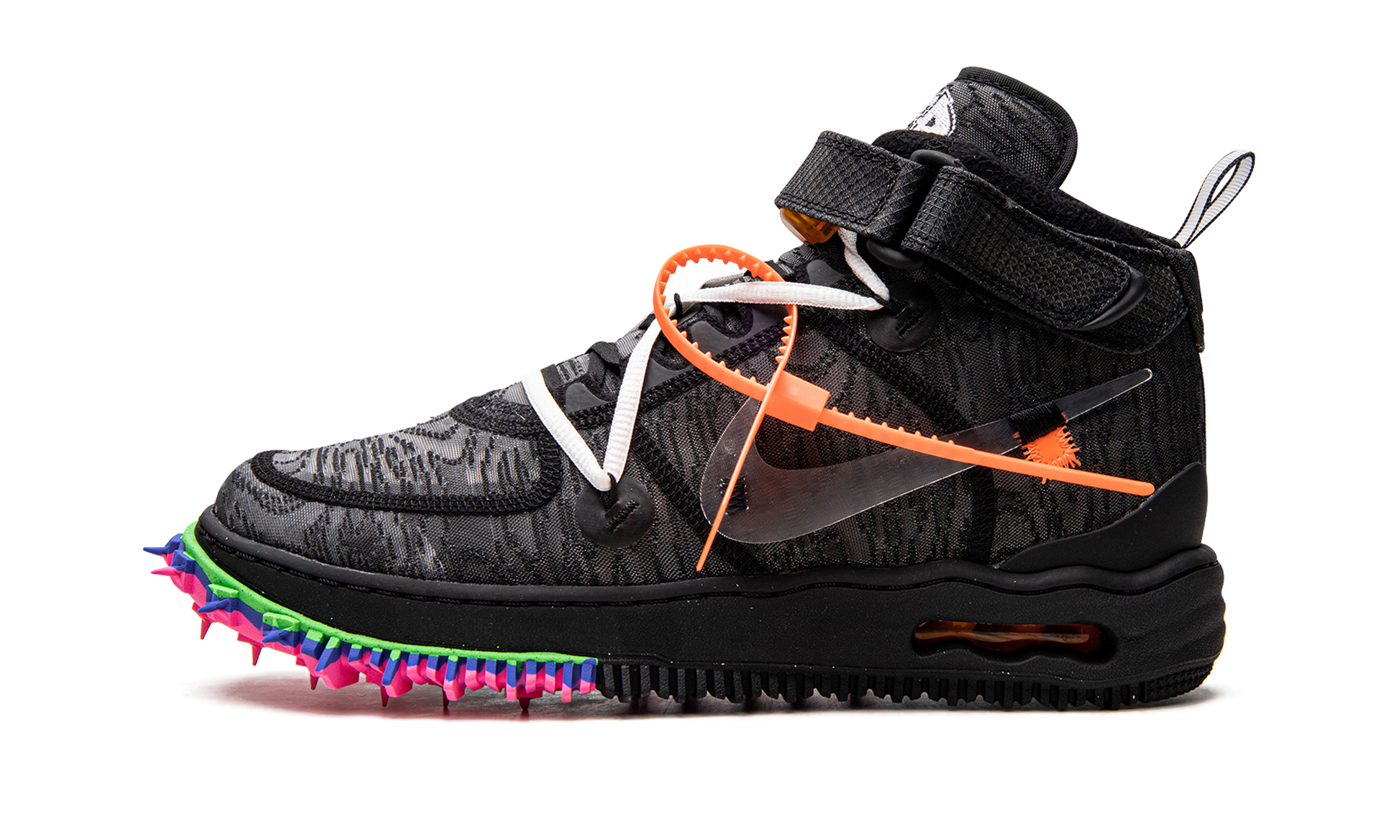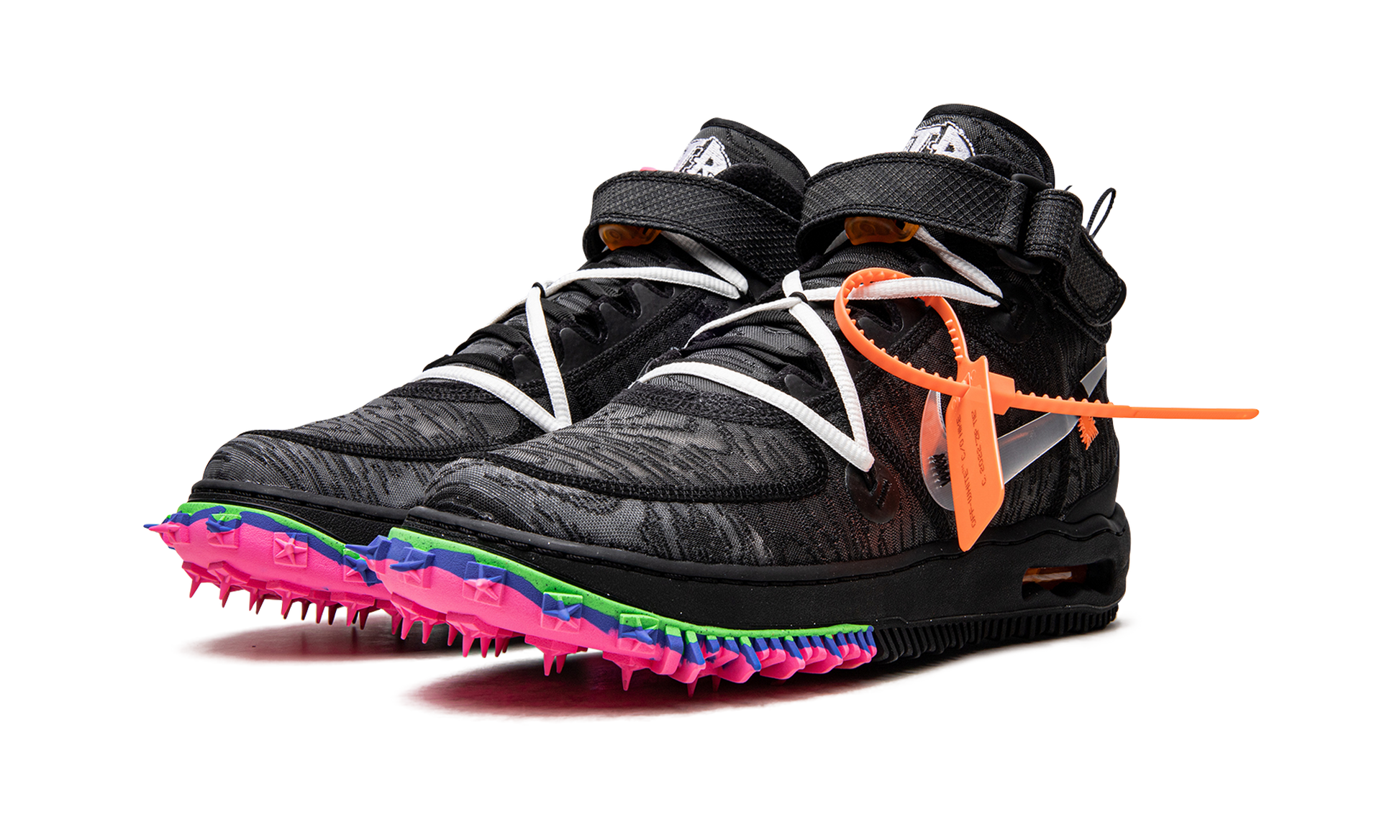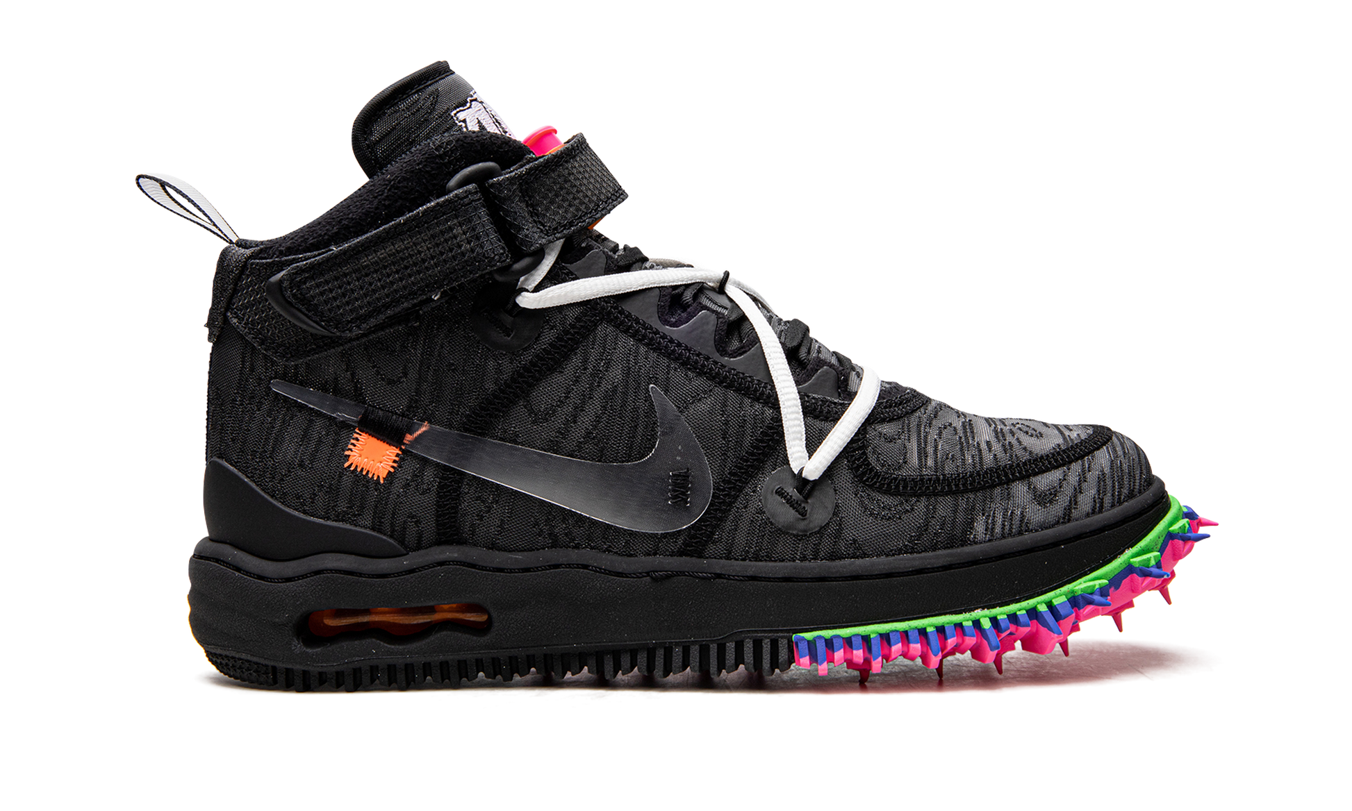The Off-White x Nike Air Force 1 Mid “Black" is a collaboration between Virgil Abloh’s popular clothing brand and Nike on a modernized version of the classic mid-top shoe. The Air Force 1 Mid by Off-White and Nike succeeds the brands’ previous Air Force 1 Low projects that were released from 2017 through 2022. One of two colorways released at the same time, the “Black” makeup features a black woven textile upper with unique patterns incorporated into the fabric. A tonal leather Swoosh resides on either side of the shoe. The black canvas ankle strap is consistent with the look of the strap found on the original Air Force 1 Mid. Off-White’s signature dual lacing system appears on the design. Graffiti-style “AIR” branding is found on the top of the tongue. An additional branding effort includes Off-White’s industrial-style detailing on the medial side of the shoe. Orange tabs, zip-tie tags, and sole units with multicolor spikes complete the look. Release date: June 23, 2022 Off-White - Black