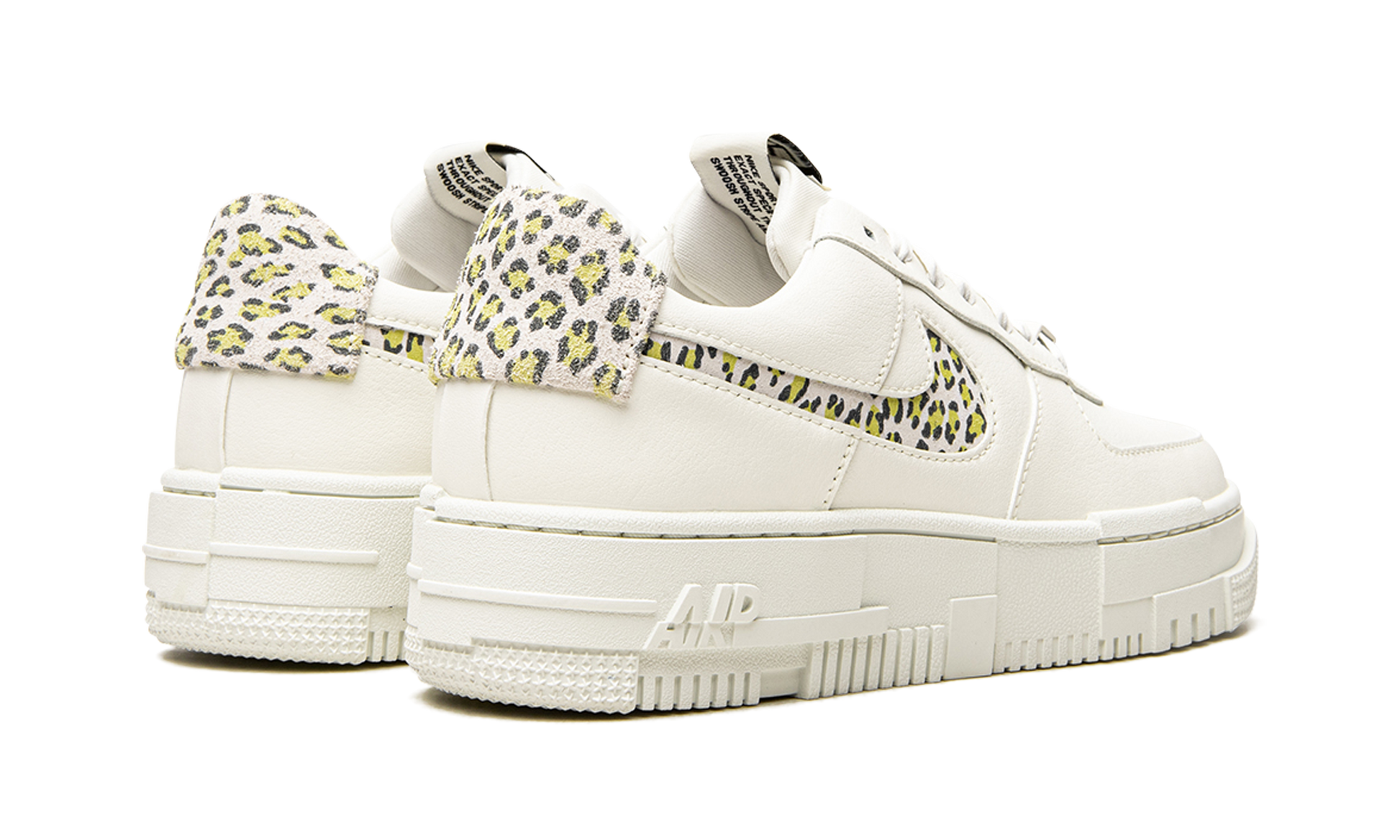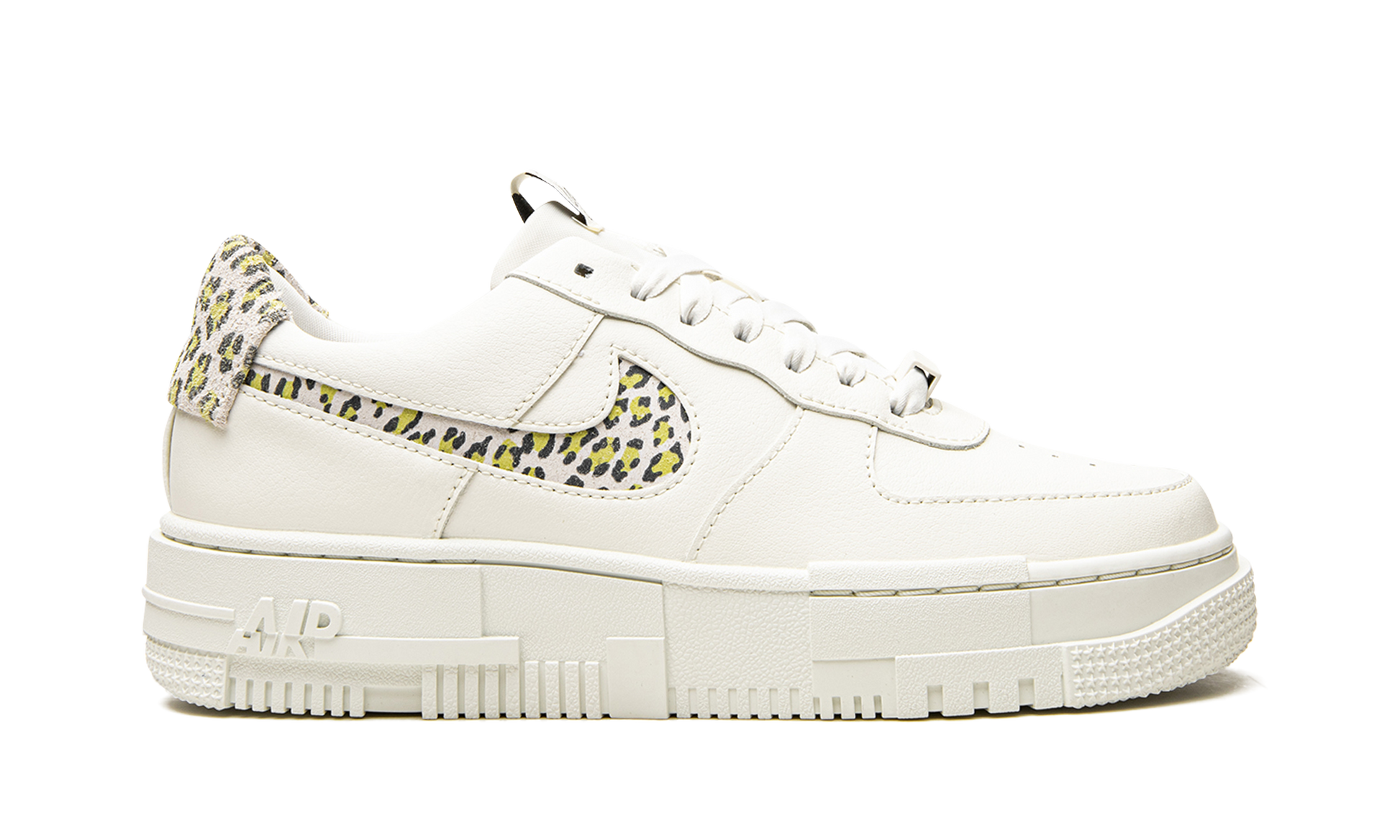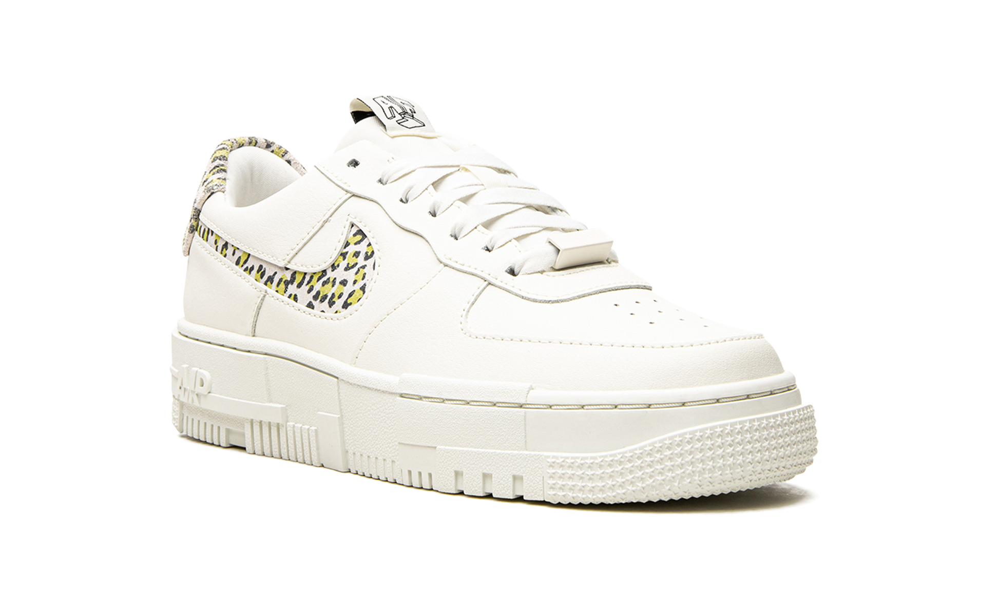 The Nike Air Force 1 Pixel "Leopard" adds to the lineup of women's Air Force 1s with wildlife-inspired and pixelated detailing. The midsole features angular, yet distorted details, and the number of perforations on the toe box have been reduced. This white Nike sneaker is livened up with a yellow, spotted leopard print on the side Swooth and oversized suede heel tab, as well as unique elements that resemble glitches in the iconic design. Leopard