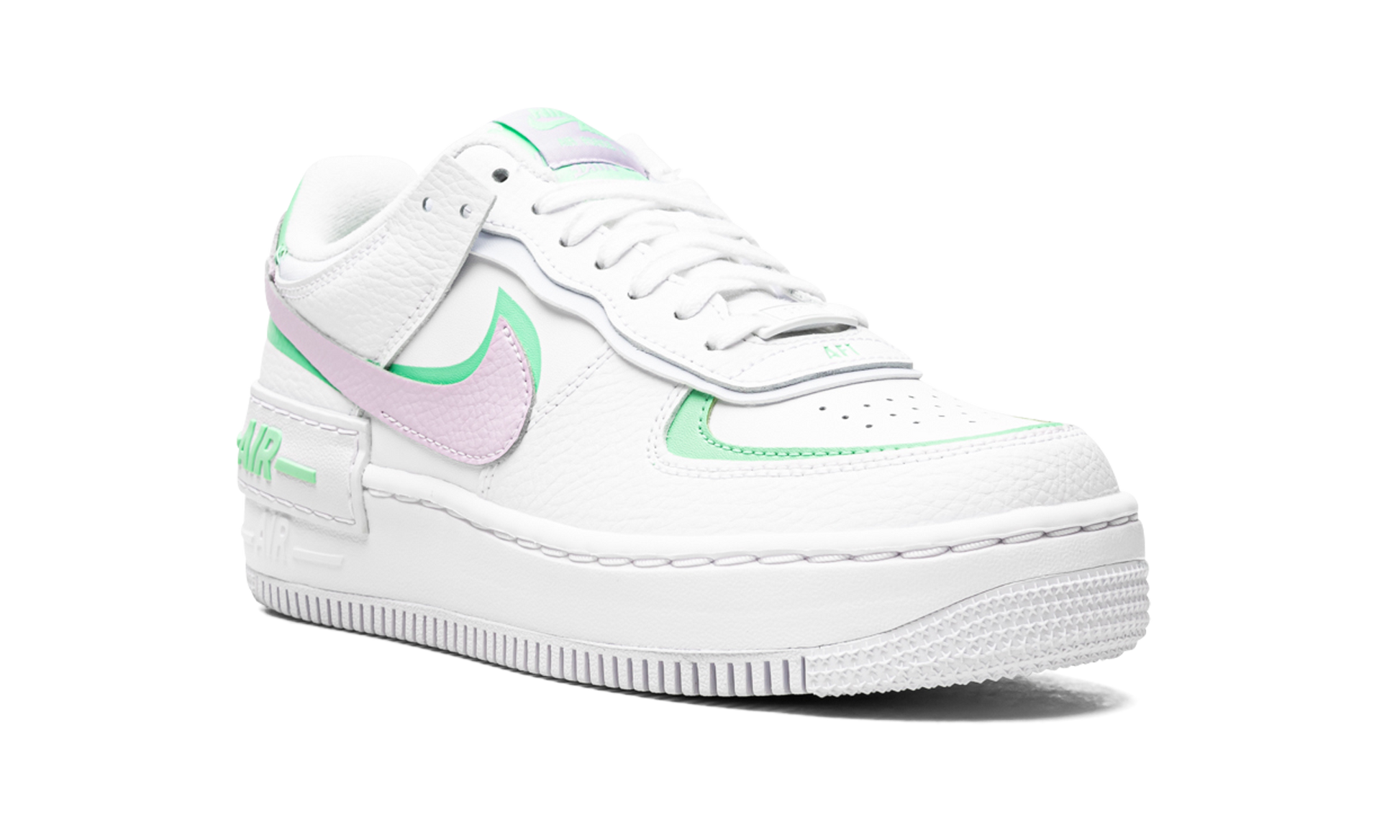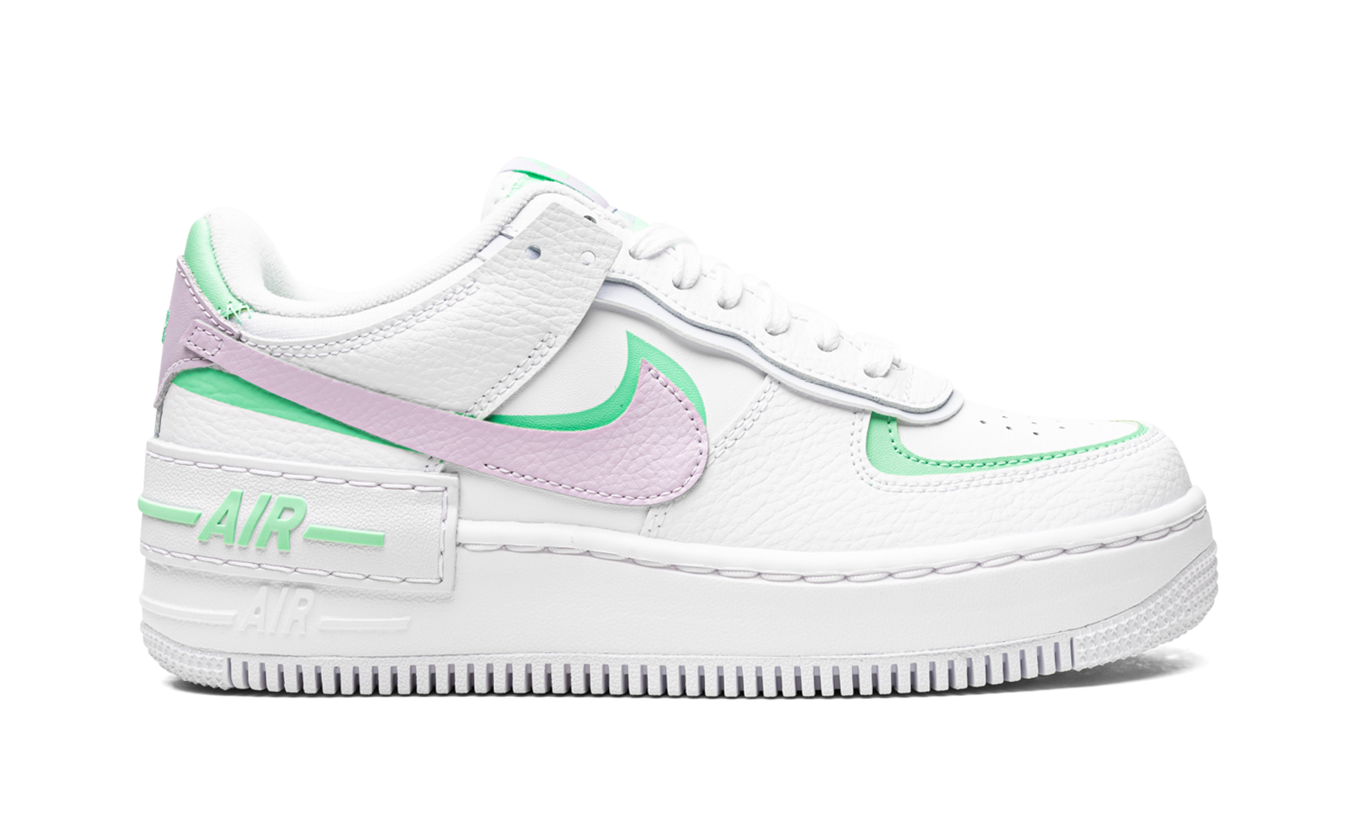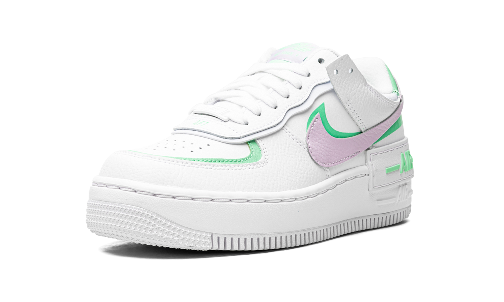 The Women’s Nike Air Force 1 Low Shadow “Infinite Lilac” is a vibrant colorway of the classic sneaker with a contemporary re-design. Looking to the beloved retro basketball shoe for inspiration, the Air Force 1 Low Shadow is a fun interpretation that displays a layered or “double” theme reminiscent of the style popularized by Nike collaborators such as Off-White and sacai. The upper features a white tumbled leather construction with overlapping panels. A Infinite Lilac tumbled leather Swoosh is placed over a green Swoosh on both sides. Additional green accenting borders the perforated toe and appears on the heel tab beneath the lilac leather panel with “Nike” branding. A doubled layered tongue and eyelet panels present a modern, cutting edge look that calls to mind the design of sacai’s numerous Nike collaborations. A white leather overlay with green “Air” detailing is situated above the Air Force 1’s original “Air” detailing on the white rubber midsole. Infinite Lilac
