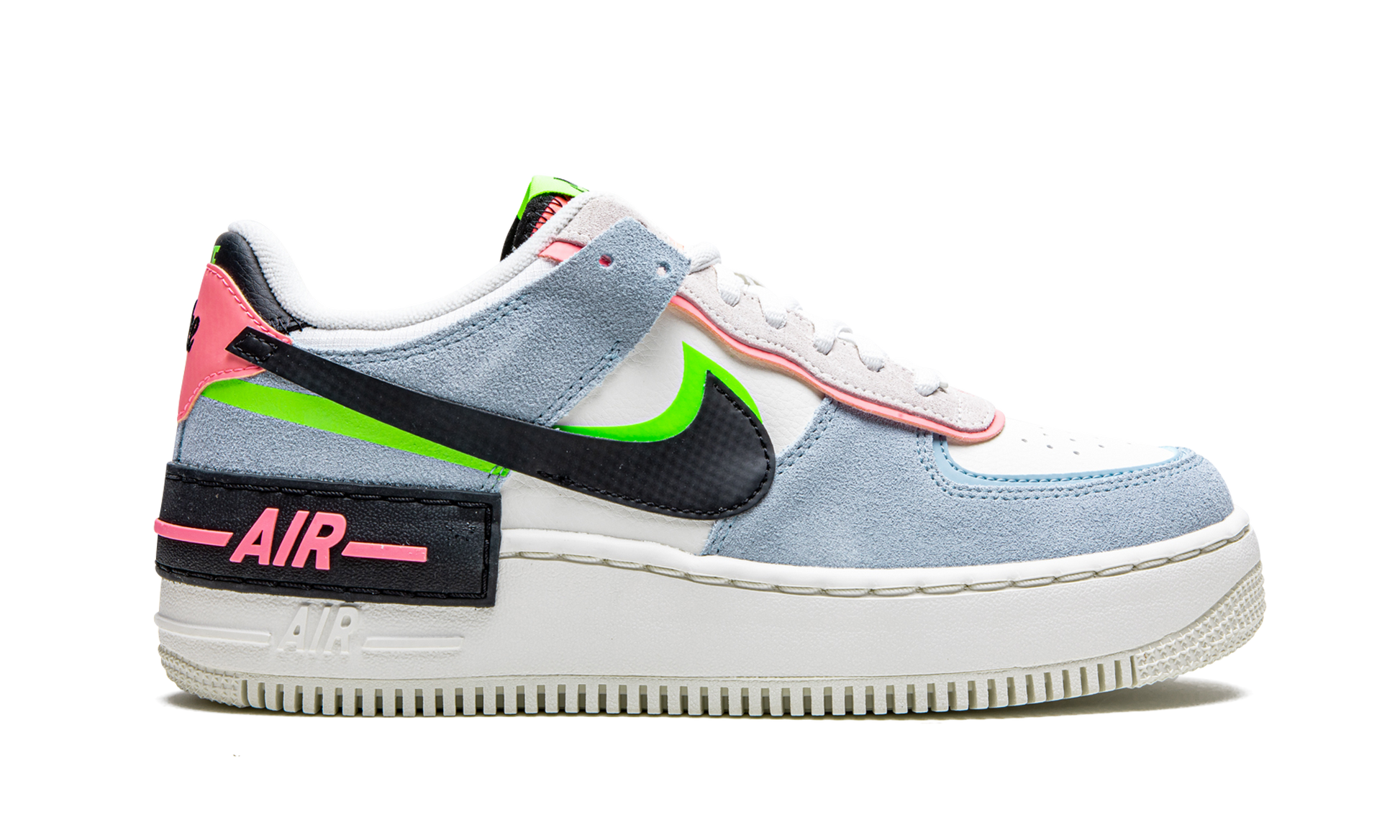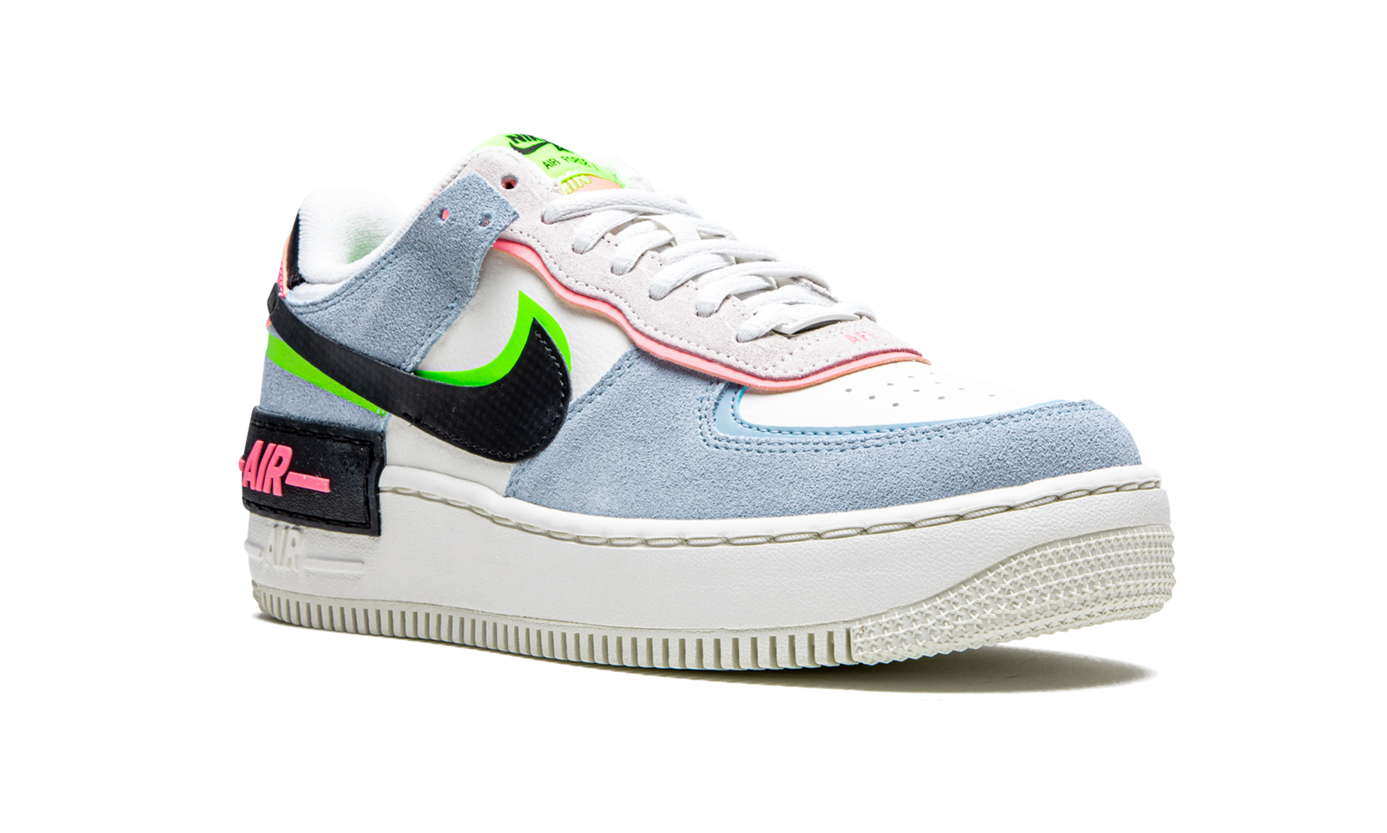 The Women’s Nike Air Force 1 Low Shadow “Sunset Pulse” is a vibrant colorway of the low-top Air Force 1 with a contemporary re-design. Based on the iconic retro basketball shoe, the Air Force 1 Low Shadow is a fun interpretation that features a layered theme similar to the style popularized by Nike collaborators such as Off-White and sacai. Light blue suede panels are placed over tonal leather detailing on the forefoot, collar, and heel. White leather can be found on the perforated toe and mid-panel. A black leather Swoosh is stacked on top of a neon green Swoosh on both sides and classic “Nike” branding is embroidered over the neon pink leather heel tab that appears over a black leather panel with neon green “Nike” insignia on the back of the shoe. Taking a page out of sacai and Nike’s collaborative history, a double layered tongue and eyelet panels presents a modern, cutting edge look. A black leather overlay with pink “Air” detailing is situated above the Air Force 1’s original “Air” branding found on the Sail cream rubber midsole. Sunset Pulse
