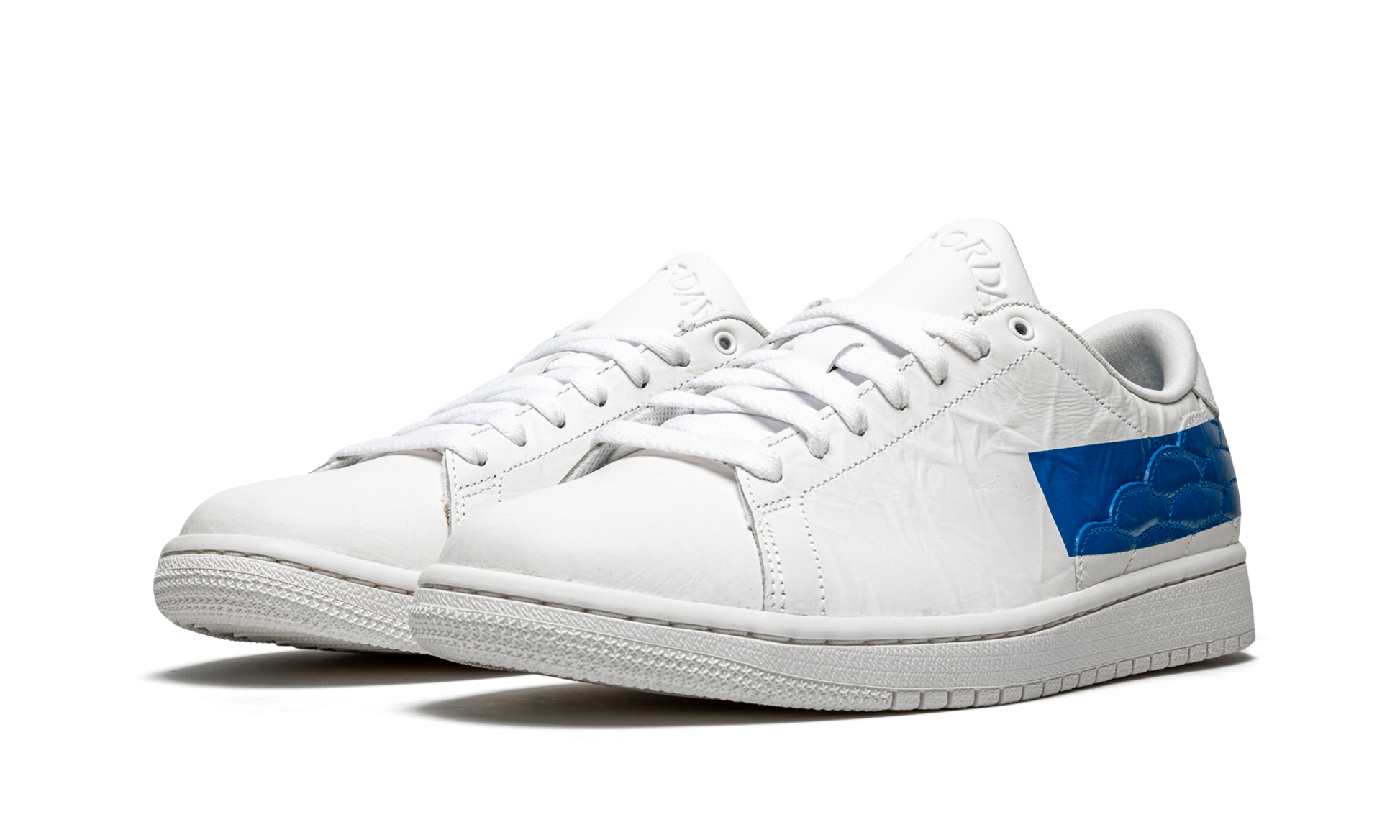 The Air Jordan 1 Centre Court “Military Blue” is a unique colorway of the lifestyle version of Michael Jordan’s first signature shoe that features a bold paint stripe on its design. After appearing on Michael’s feet during segments of the popular “Last Dance” docuseries in Spring 2020, Jordan Brand released the Air Jordan 1 Low Centre Court in late 2020. The shoe, which draws simultaneously from retro tennis and current lifestyle footwear styles, features a sleek, low-profile that excels in versatility. The upper is constructed from soft white leather. An embroidered pattern representing the wings of the original Air Jordan logo can be found on either side and on the back of the shoe beneath the blue painted stripe on the heel. Embossed “Wings” and “Air Jordan” branding appear on the heel tab and tongue, respectively. Release date: April 8, 2021 Military Blue