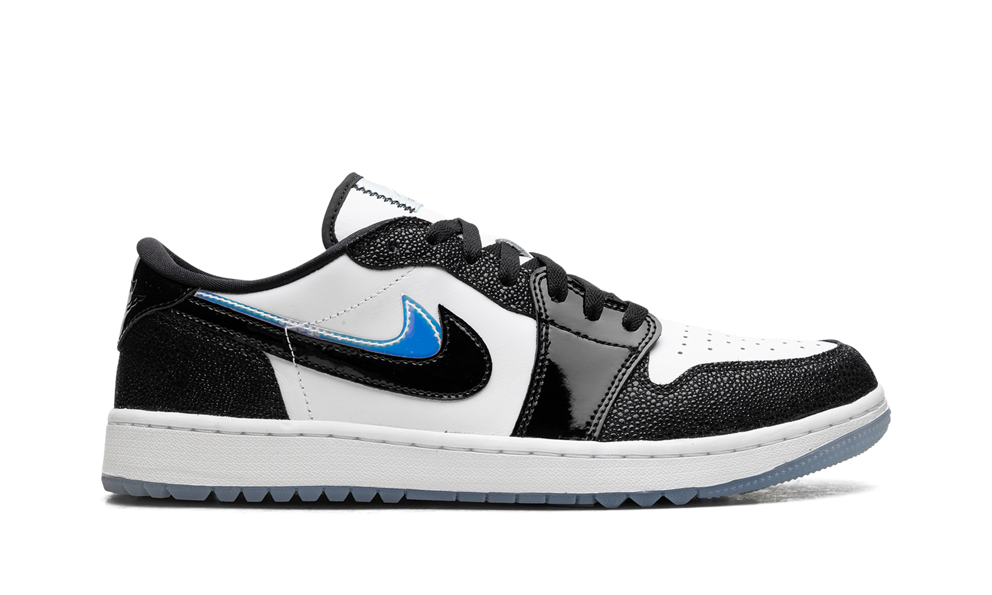 The Air Jordan 1 Low Golf "Endless Pursuit" is a colorway of the golf shoe with unique features. The Jordan 1 Low Golf is designed with modifications specifically tuned for golfing, including nubs on the outsole that provide traction on the fairway. The “Endless Pursuit” colorway is equipped with a white leather upper and black pebbled and patent leather overlays. A black patent leather Swoosh is layered over a smaller iridescent Swoosh on the sides. Additional iridescent detailing accents the tongue tag. “For the Endless Pursuit” is printed next to a Jumpman on the insole. A white rubber midsole and an icy blue translucent outsole finish off the look. Release date: April 12, 2024 Endless Pursuit