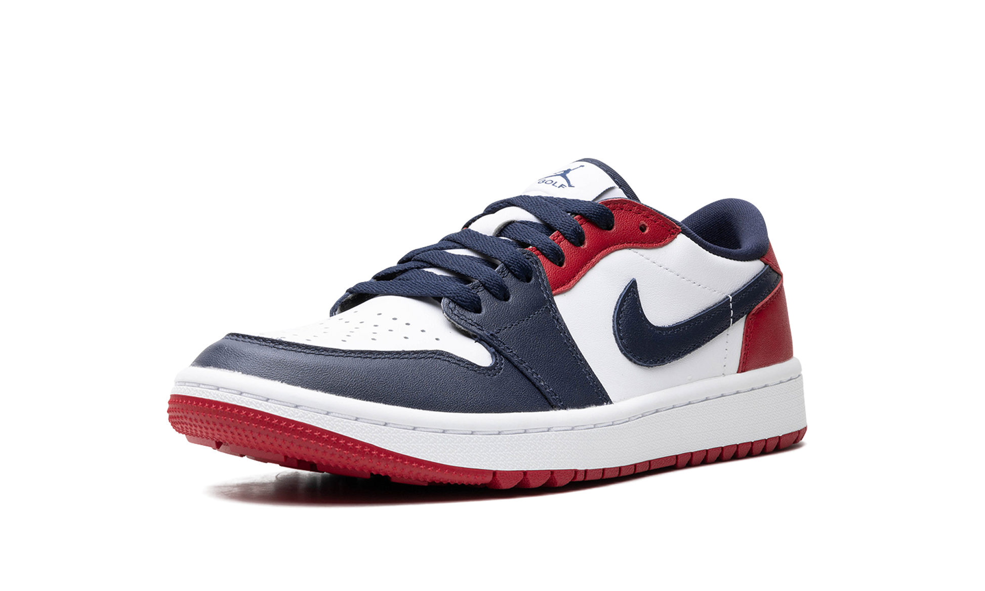 The Air Jordan 1 Low Golf "USA" is a patriotic colorway of the low-top golf shoe by Jordan Brand. Based on the Air Jordan 1 Low, the Jordan 1 Low Golf is essentially the same shoe as the former, but features nubs on the outsole for traction on a golf course. The “USA” colorway features a red, white, and blue color block, with white leather on the base, and Obsidian leather on the toe, forefoot, eyelets, and Swoosh. Varsity Red leather can be found on the middle eyelet panel and heel. A navy “Wings” logo appears on the heel, while Jumpman and “Golf” logos are seen on the tongue tag USA
