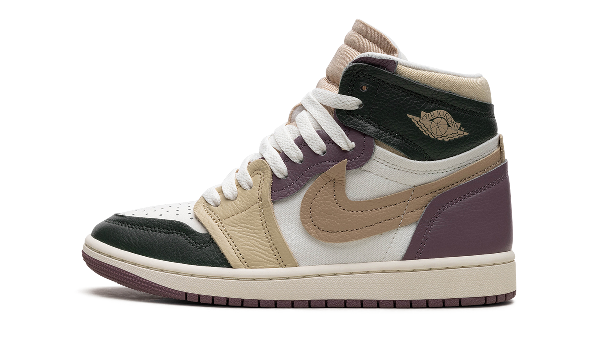 The Women’s Air Jordan 1 High MM "Galactic Jade" is the women’s sizing of the alternate version of the retro basketball shoe with a layered aesthetic. Designed in a unique combination of leather and canvas, the shoe also has layered and raised overlay panels that give the design a head-turning look. The upper features a Sail leather base with a dark green leather toe cap and dark green collar, a tan raised leather forefoot panel, and raised purple eyelet and heel panels. A raised tan leather Swoosh appears on both sides. A “Wings” logo is seen on the collar. Release date: November 2, 2023 Galactic Jade