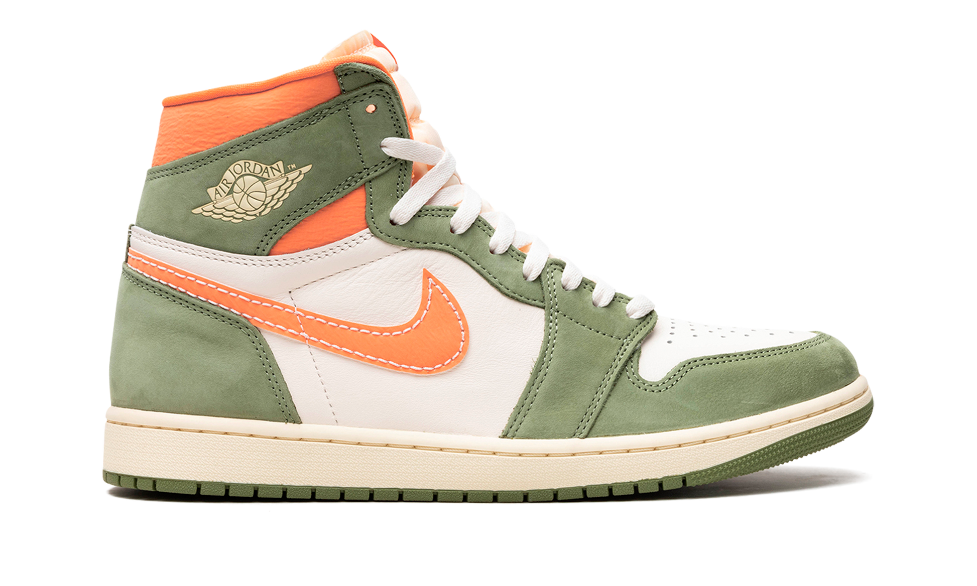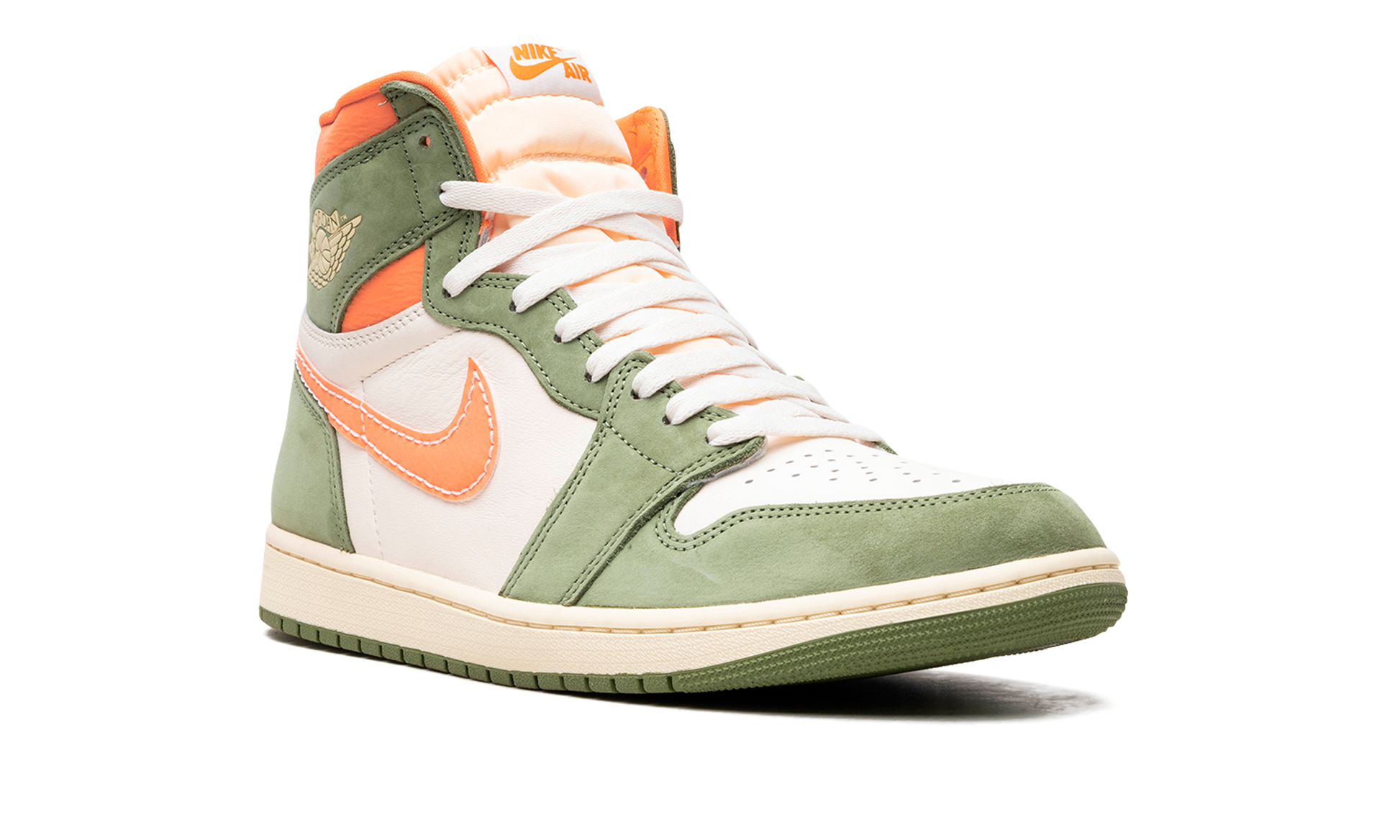 The Air Jordan 1 High OG Craft “Celadon” is a colorway of the classic shoe made with a premium combination of materials that give it a refined, lifestyle-focused design. From a collection of “Craft” sneakers, the Jordan 1 High OG Craft in “Celadon” features a white leather base with olive green suede overlays on the toe, forefoot, eyelets, collar, and heel. A Bright Mandarin leather Swoosh can be seen on either side of the shoe. The fiery orange tone also appears on the padded collar and inner lining. A cream “Wings” logo can be found on the collar and “Nike Air” detailing appears on the tongue tag. An aged finish is applied to the midsole, giving the shoe a vintage look. Release date: December 23, 2023 Celadon