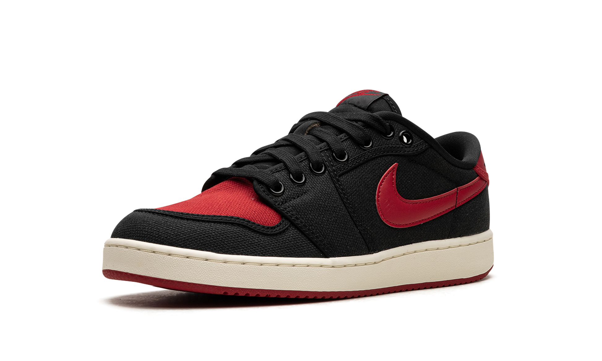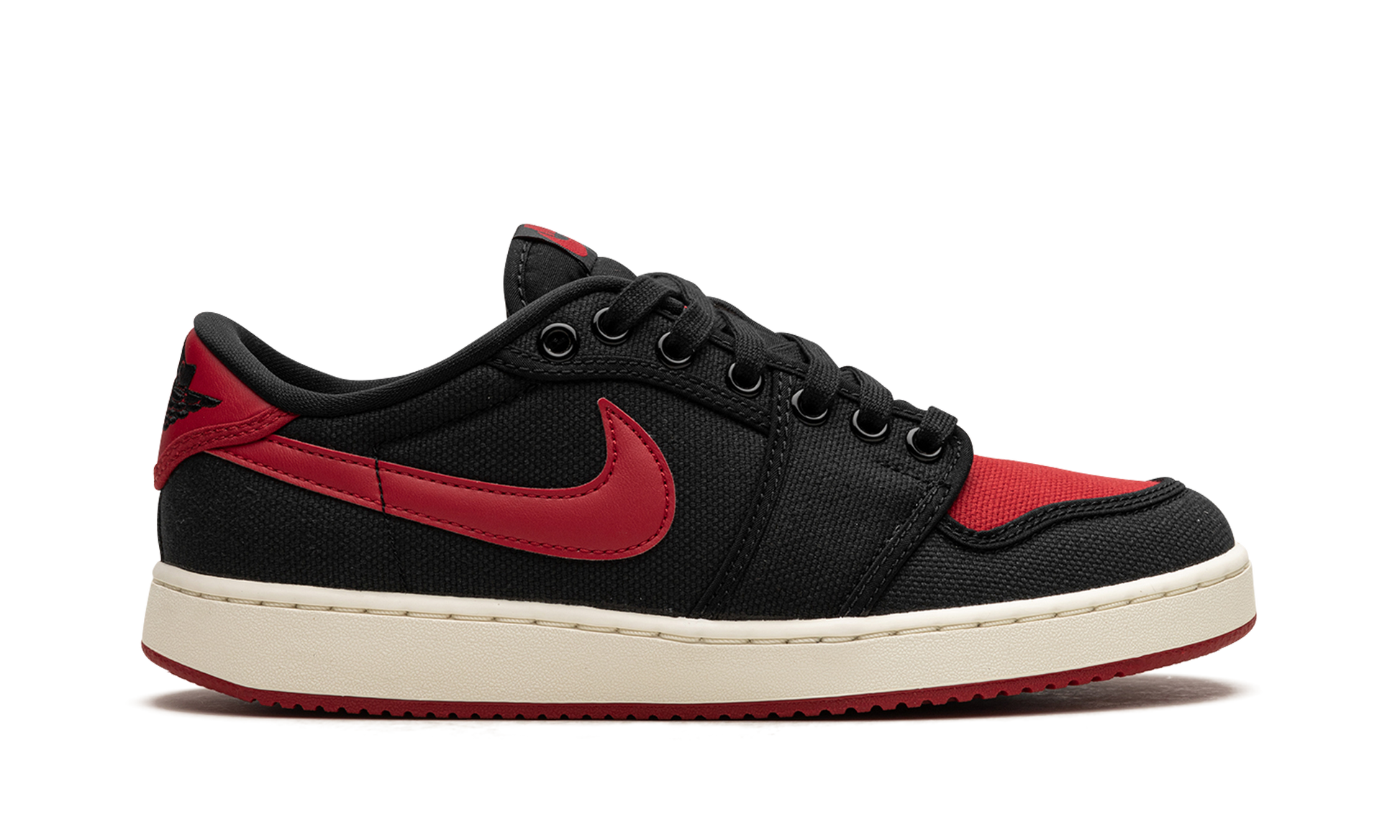 The Air Jordan 1 KO Low “Bred” is a colorway of the low-top version of the retro basketball shoe that is inspired by an iconic Air Jordan style. The shoe we’re referring to is the Air Jordan 1’s original “Bred” colorway that was worn by Michael Jordan with the Chicago Bulls. In addition to appearing on the Jordan 1, the “Bred” theme was also released on the original version of the Air Jordan 1 KO in 1986. Here, the style returns to the silhouette, but on the low-top model. The shoe has a mostly black canvas construction save for the Varsity Red canvas toe and the Varsity Red leather Swoosh. A black “Wings” style “AJKO” logo appears on the heel and a red “Nike” logo is found on the tongue. The Jordan 1 KO Low has the same midsole as the Nike Vandal, and is designed in a vintage-inspired cream hue here. Release date: August 23, 2023 Bred