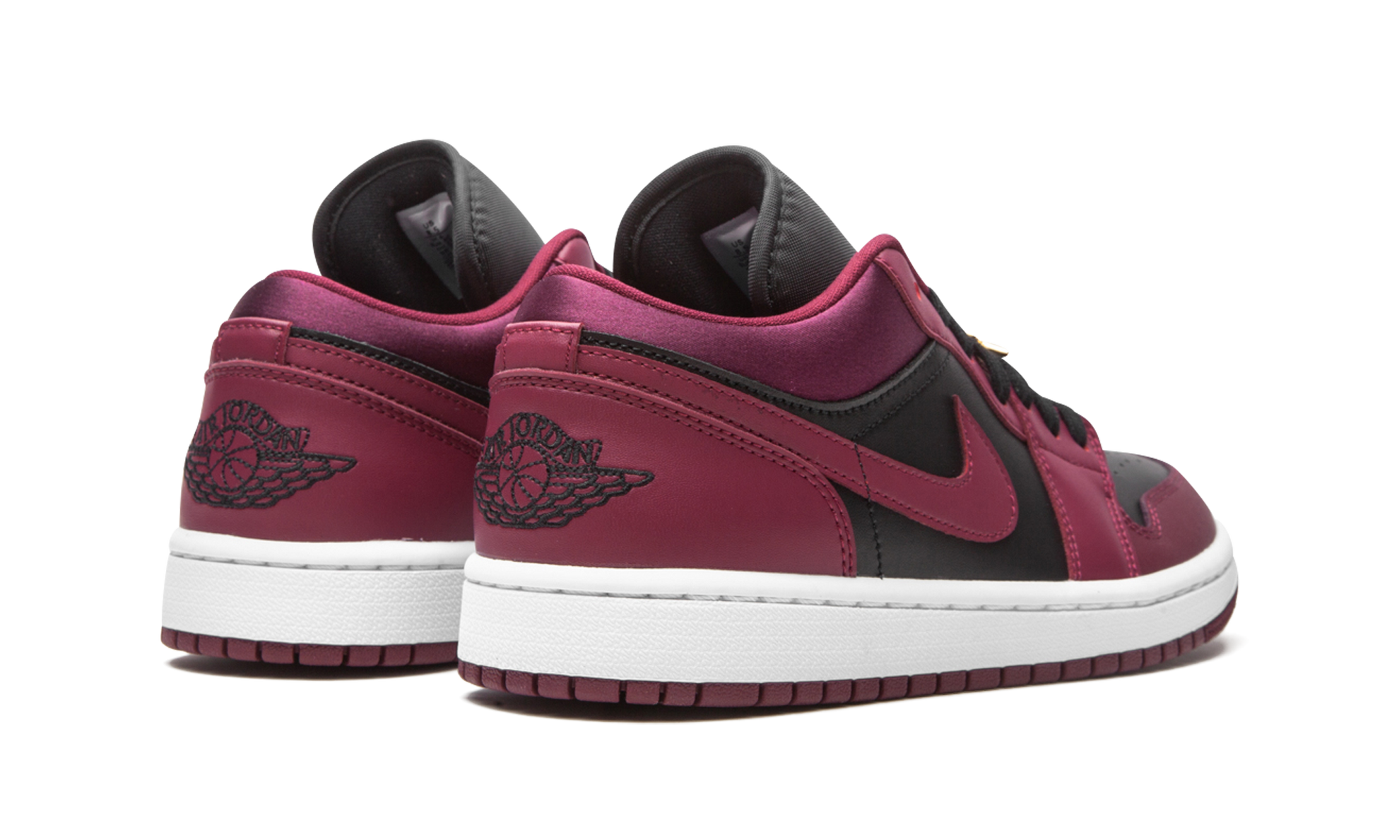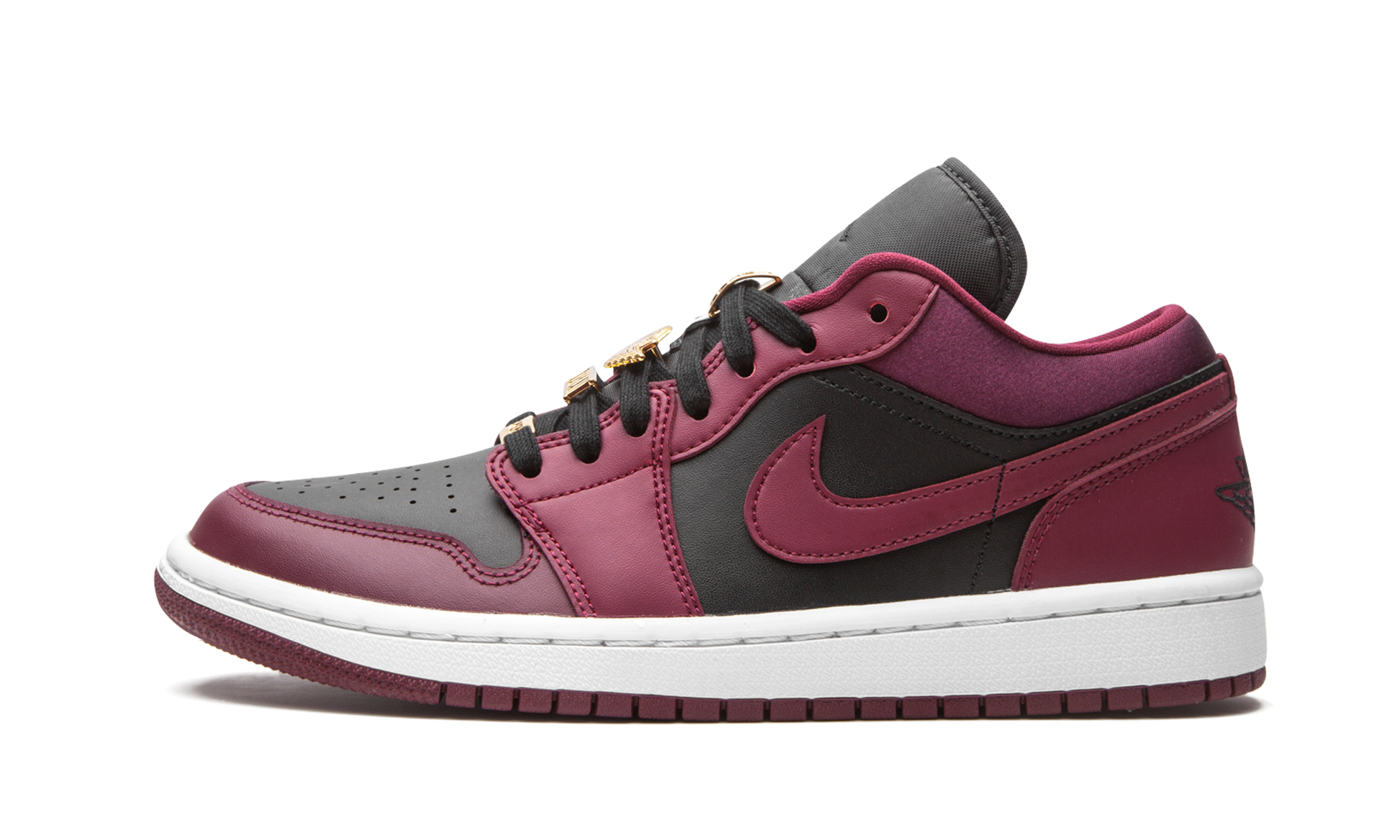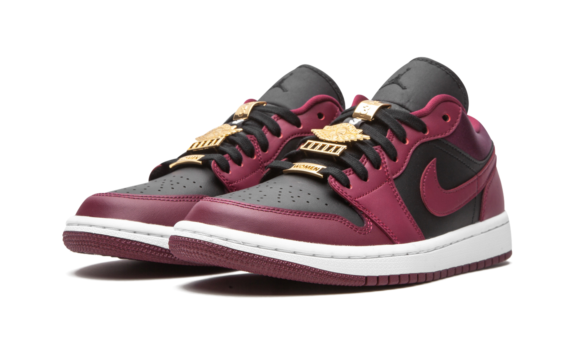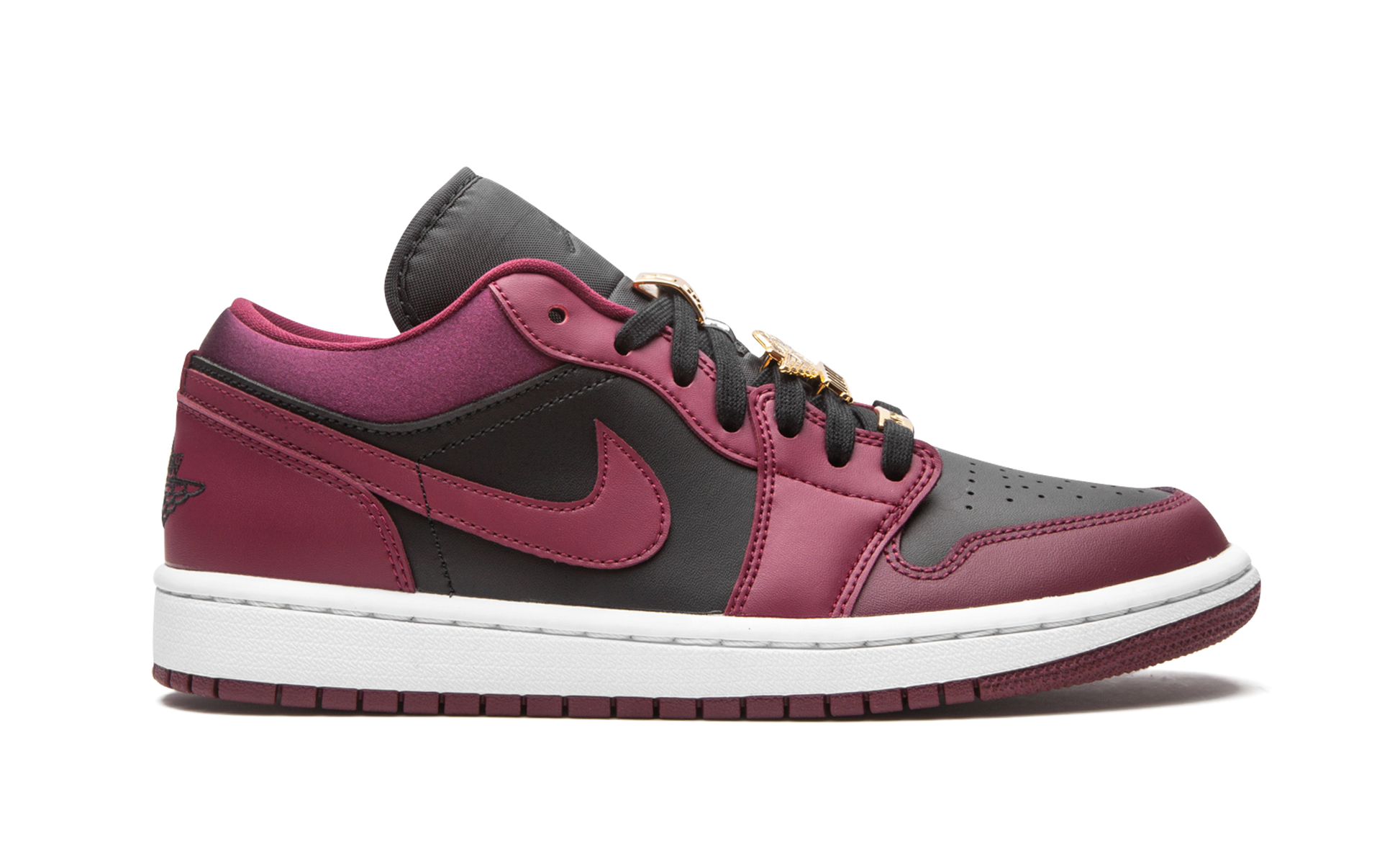 The Women’s Air Jordan 1 Low “Beetroot” is the women’s sizing of Michael Jordan’s first signature shoe in a luxurious colorway that incorporates jewels into its design. Adding “bling” to an Air Jordan 1 is hardly new—Melody Ehsani’s collaborative Jordan 1 High from 2018 helped popularize the look, and the “Beetroot” continues the flashy theme. The upper displays Beetroot leather overlays on the forefoot, eyelets, collar, and heel that are contrasted by black leather detailing on the perforated toe and mid-panel. The same shade of deep maroon also appears on the Swoosh branding on either side. Additional logo detailing appears on the Jumpman embroidery on the black nylon tongue and “Wings” emblem on the heel. Gold pendants that read “WOMEN,” “JORDAN,” and “23” are incorporated into the laces. Release date: November 29, 2020. Beetroot