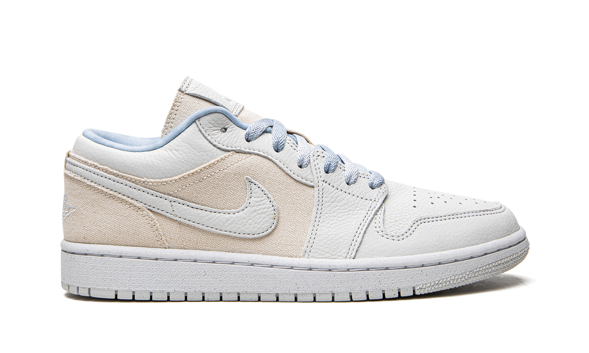 The Women’s Air Jordan 1 Low SE “Canvas” is a women’s-exclusive, summer-inspired colorway of Michael Jordan’s first signature shoe in low-top form. A release from Jordan Brand’s Summer 2022 collection, the “Canvas” features a combination of materials and neutral colors on its design. Specifically, the perforated toe, forefoot, eyelets, and collar are constructed in white leather. The mid-panel, heel, and tongue are arranged in a natural canvas textile. A full-grain white leather Swoosh is located on the sides, and a white “Wings” logo is embroidered on the heel. Tonal Jumpman and “Air” detailing appear on the white leather tongue tag. The light blue laces and inner lining add another element to the shoe’s summer-ready appearance. Grey cream