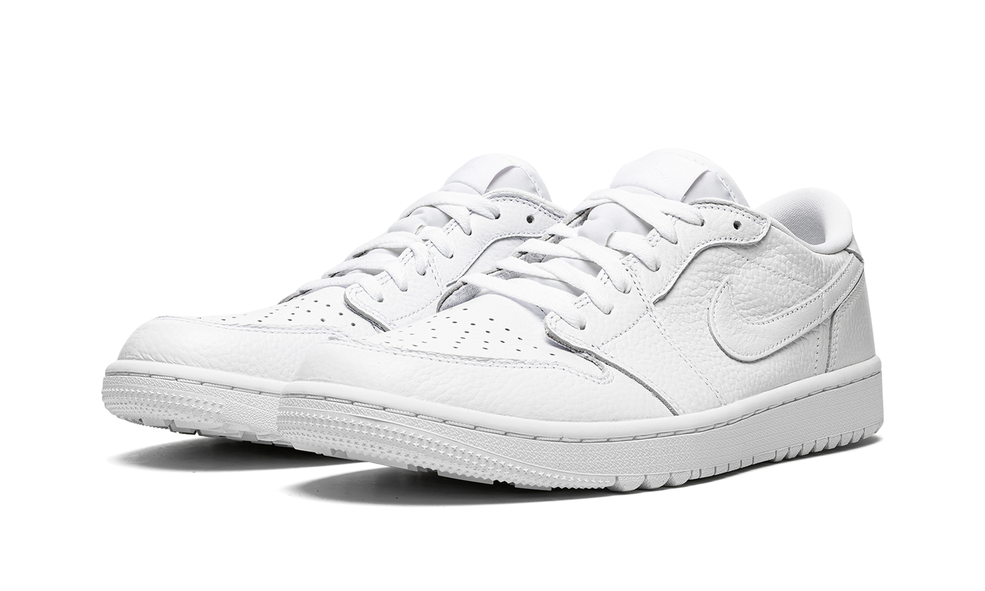The Air Jordan 1 Low Golf “Triple White” is a monochromatic white colorway of the version of the vintage basketball shoe designed for golf. The “Triple White” is one of multiple Jordan 1 Low Golf styles released by Jordan Brand in 2022. Designed for the fairway, style elements include an all-white leather construction with a white leather Swoosh on the sides. Tonal “Wings” branding is found on the heel. Additional branding appears on the tongue tag, where a Jumpman and “Golf” detailing are found in white. Small nubs on the outsole provide traction on a golf course. Release date: March 5, 2022 Triple White