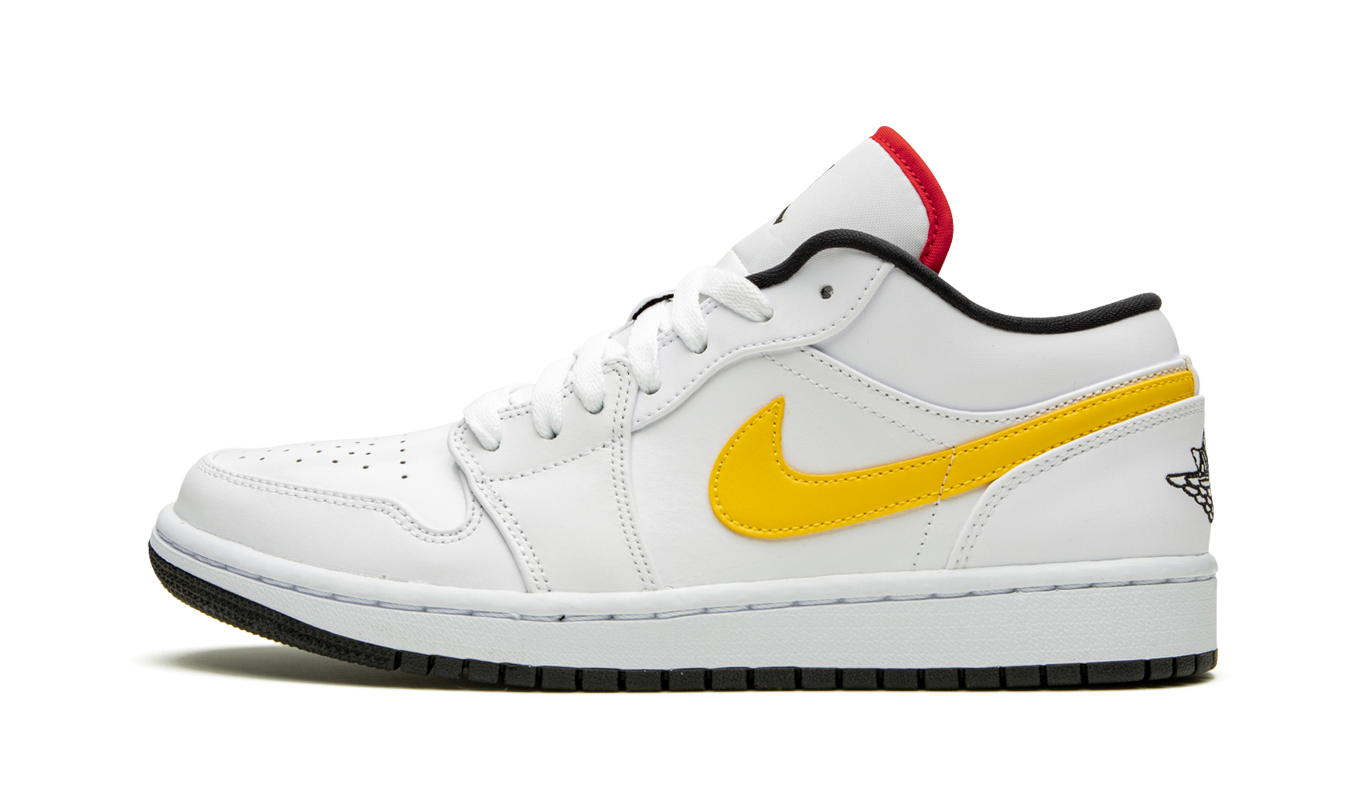 The Nike Air Jordan 1 Low offers a vibrant colorway that hit the shelves in early 2020. The upper features a white leather construction accented with the classic Air Jordan branding in black on the tongue and heel and a red and pink lining on each tongue. The multicolored Swooshes on each side are the main focus of this design as the left shoe is embellished with a yellow and purple Swoosh and the right includes touches of red and blue on the Nike insignias. Multicolor