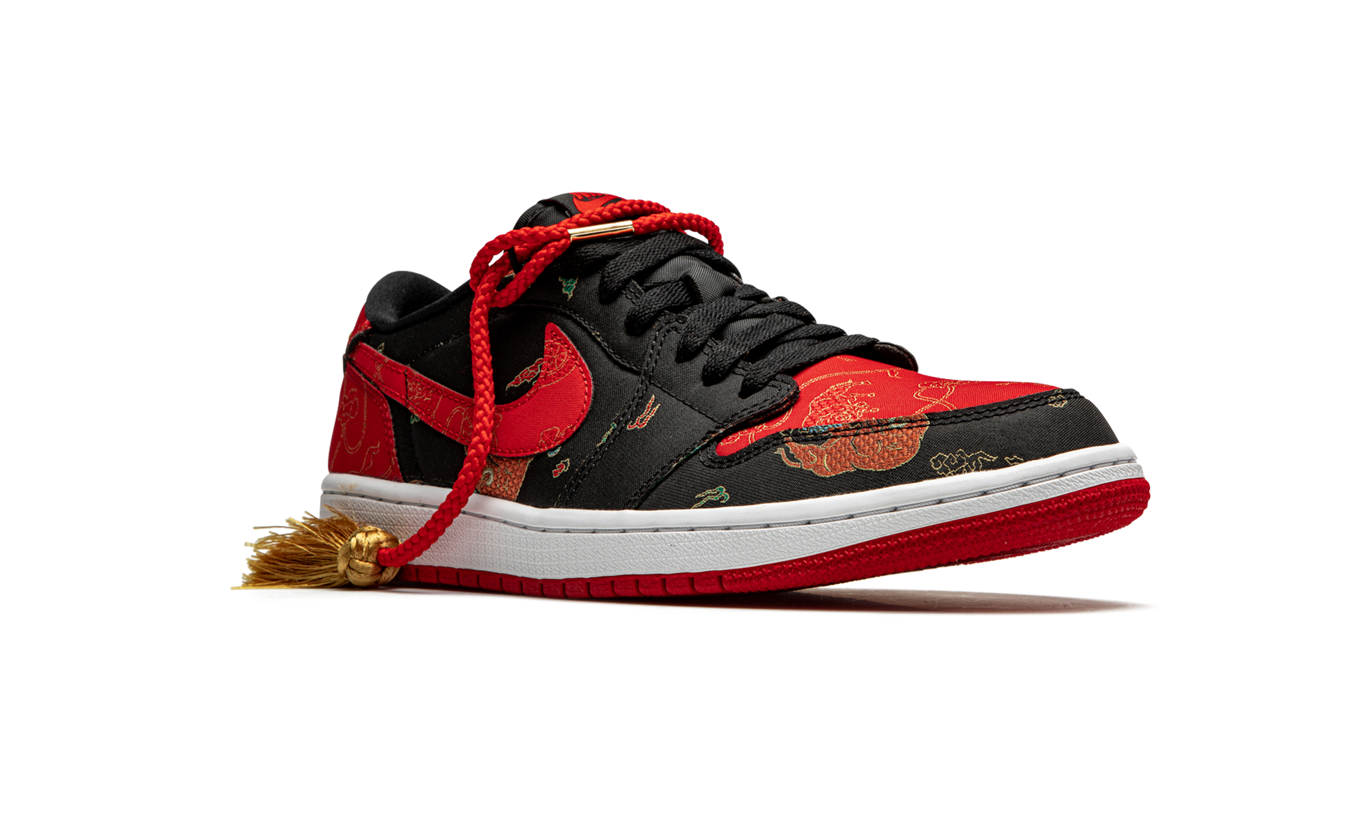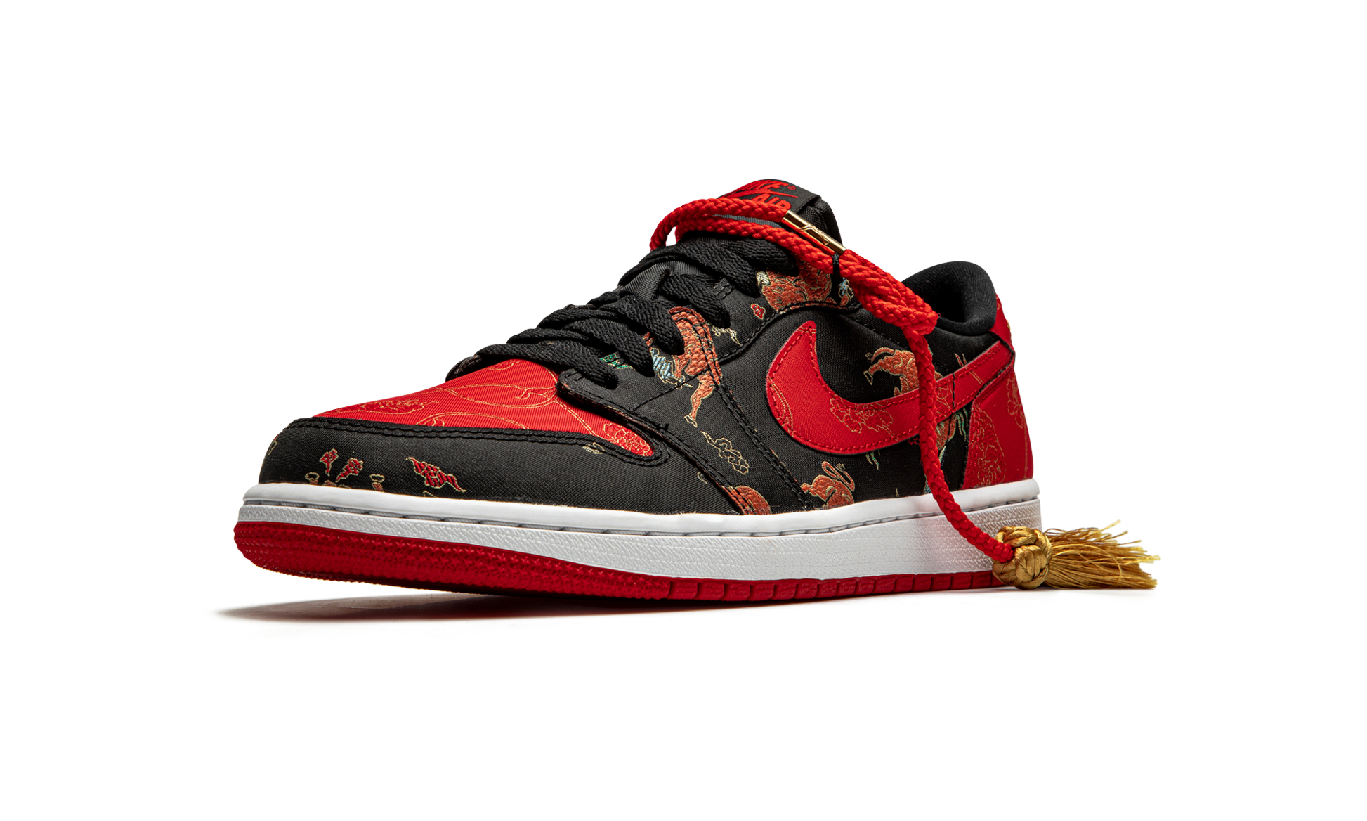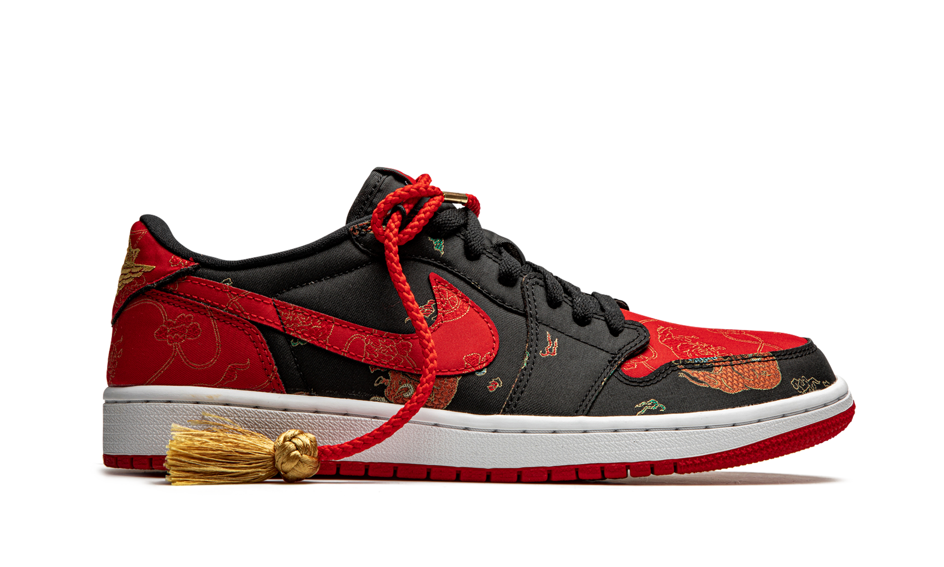 The Air Jordan 1 Low OG “Chinese New Year” is a limited edition colorway of Michael Jordan’s first signature shoe that celebrates the traditional Chinese holiday. Limited to 8500 units, the “Chinese New Year” Jordan 1 Low is a desirable shoe that also shows love to the classic “Bred” colorway by employing black and red panels into its design. Various floral designs are embroidered into the black and red canvas panels found on the forefoot, mid-panel, eyelets, and heel, respectively. A University Red canvas Swoosh logo appears on either side of the shoe. Jordan Brand places a gold “Wings” emblem on the back of the shoe and “Nike Air” branding can be found on the tag of the black nylon tongue. No ordinary Air Jordan 1 Low, the “Chinese New Year” comes packaged inside of a commemorative shoe box with traditional Chinese decorations. A red rope with a gold tassel wraps around the ankle to finish off the look. Release date: January 31, 2021. Chinese New Year 2021