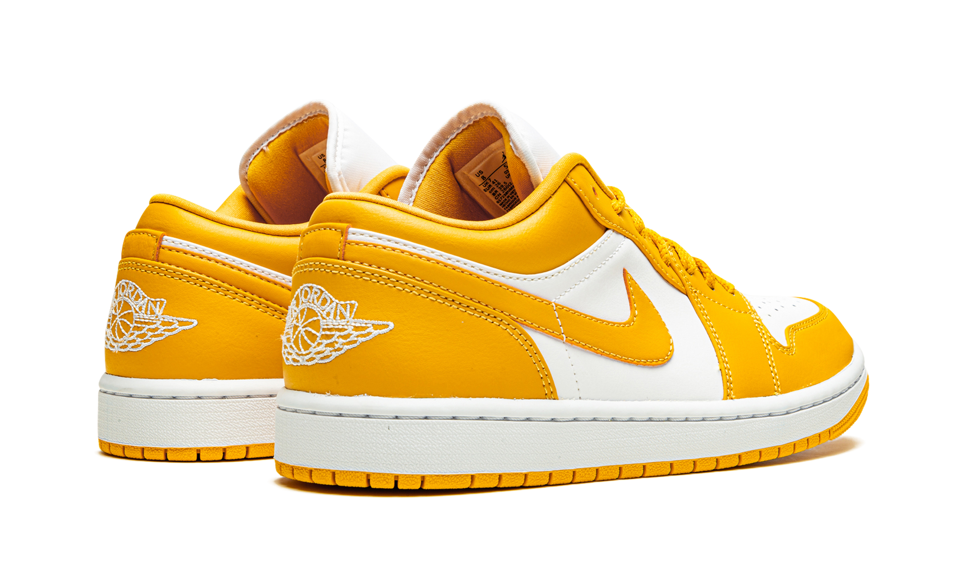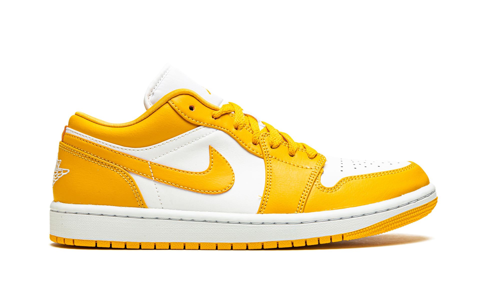 The Air Jordan 1 Low “Pollen” is a scorching hot colorway of Michael Jordan’s first signature shoe in the popular low-top silhouette. Released by Jordan Brand in 2021, this “Pollen” colorway features white leather on the perforated toe and mid-panel. The forefoot, eyelets, collar, heel, and Swoosh are designed in Pollen yellow leather. A white “Wings” logo is embroidered on the back and a Pollen-colored Jumpman appears on the white nylon tongue. White “23” embroidery is stitched onto the lace overlay to complete the look. Pollen