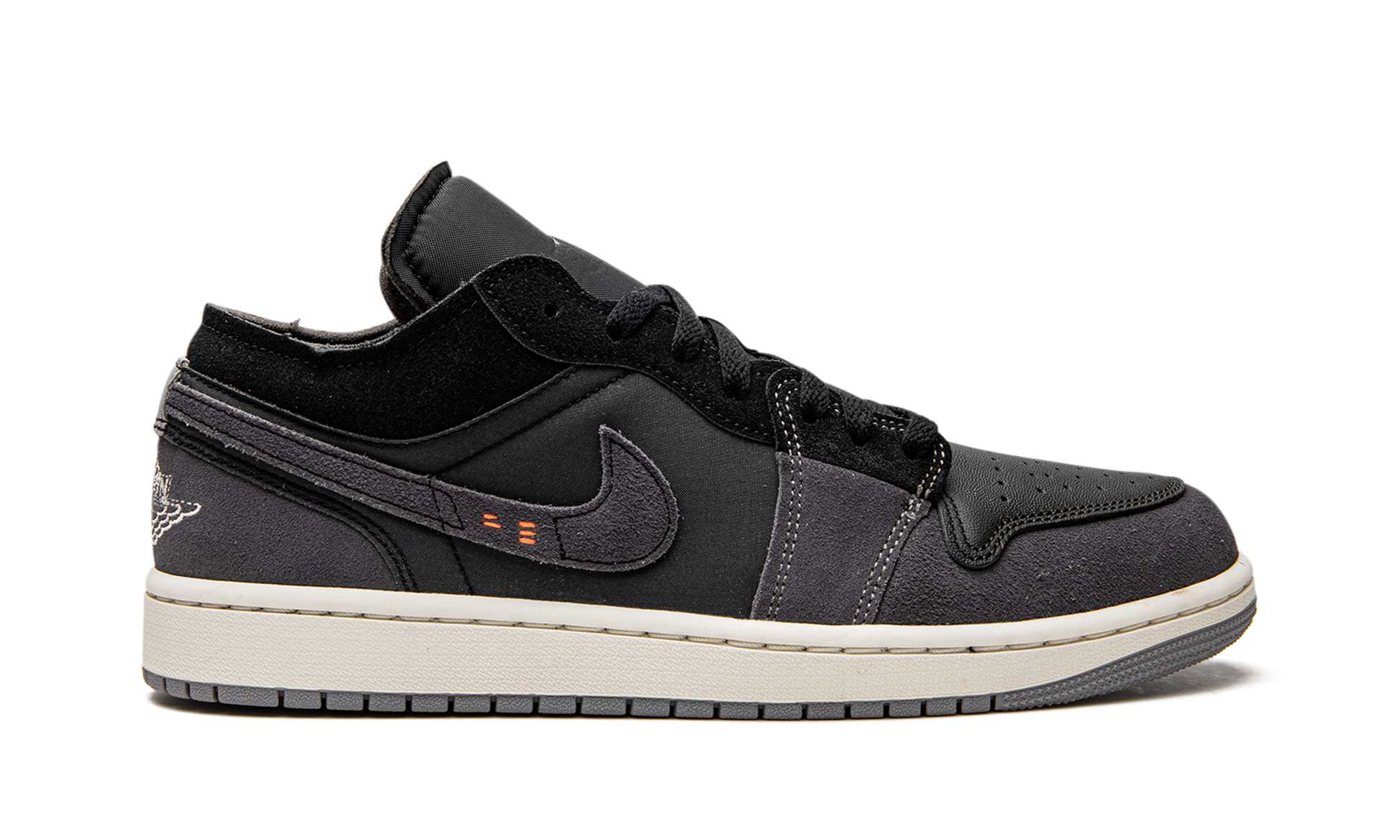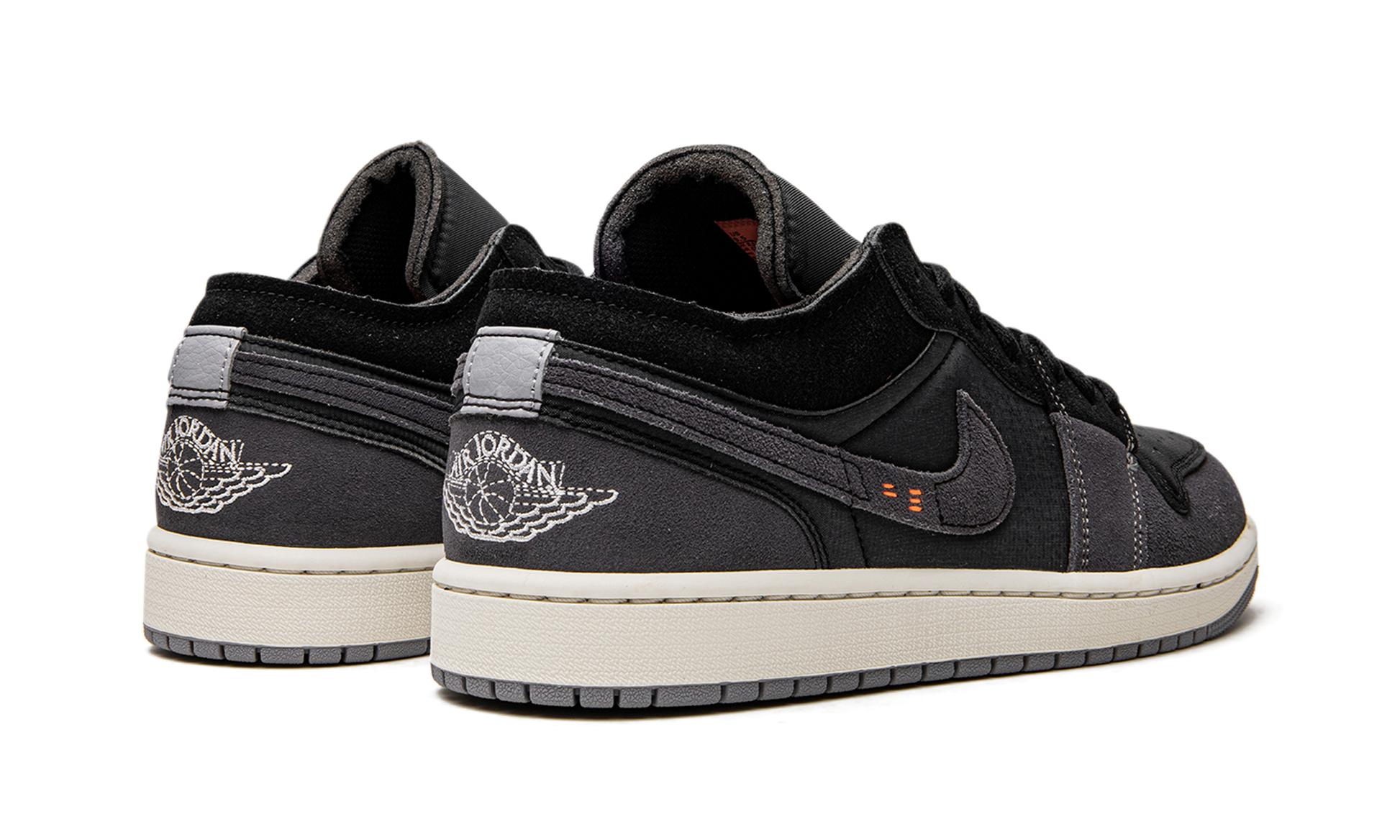 The Air Jordan 1 Low Craft “Inside Out” is a colorway of the retro basketball shoe with a unique construction. The “Inside Out,” as its name implies, “reverses” the construction of the popular Air Jordan 1 Low by featuring foam padding on the outside of its design to appear as if the inside of the shoe is on the outside. Specifically, the perforated toe is designed in black leather while grey foam padding is found on the toe, forefoot, mid-panel, and heel. The material also appears on the Swoosh. A white “Wings” logo is embroidered on the back of the shoe and a white Jumpman is found on the black nylon tongue. Inside Out - Black