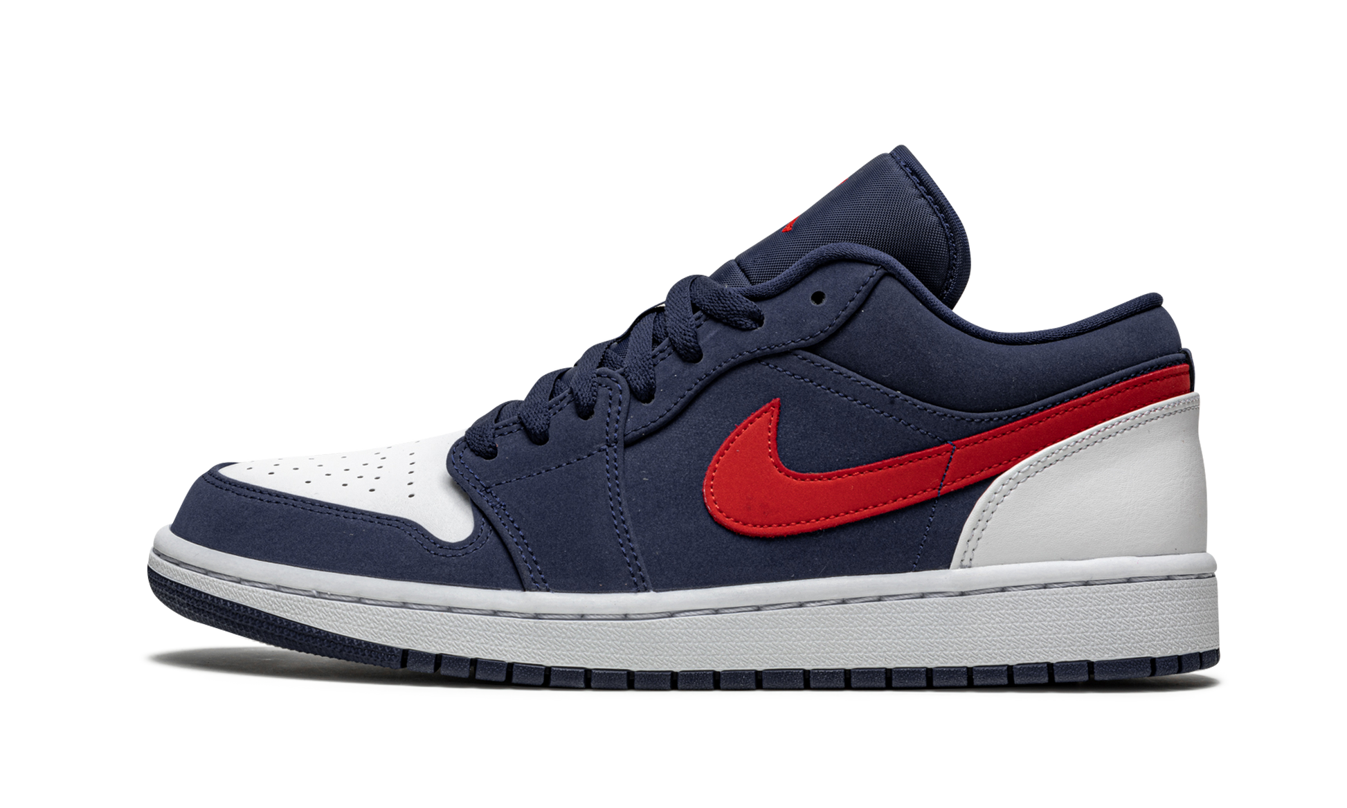 The Air Jordan 1 Low SE “USA” is a patriotic colorway of Michael Jordan’s first signature shoe in the popular low-top style. Jordan Brand’s dedication to elevating the Jordan 1 Low into the upper echelons of sneaker culture has seen the brand use the model in collaborations with Dior and Travis Scott since 2019. Here, the “USA” adds to the impressive assortment of Jordan 1 Lows by featuring the red, white, and blue color scheme of the American flag. A Midnight Navy suede material appears on the forefoot, mid-panel, collar, and eyelets. The University Red leather Swoosh logo on either side of the shoe breaks up the look. White leather can be found on the perforated toe and on the heel. A red embroidered Jumpman is stitched onto the navy blue nylon tongue. Finishing touches include a white rubber midsole and Midnight Navy outsole. USA