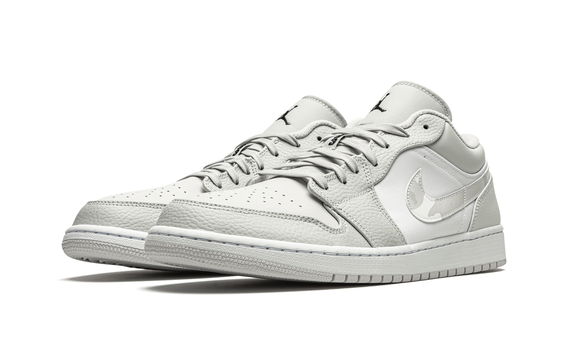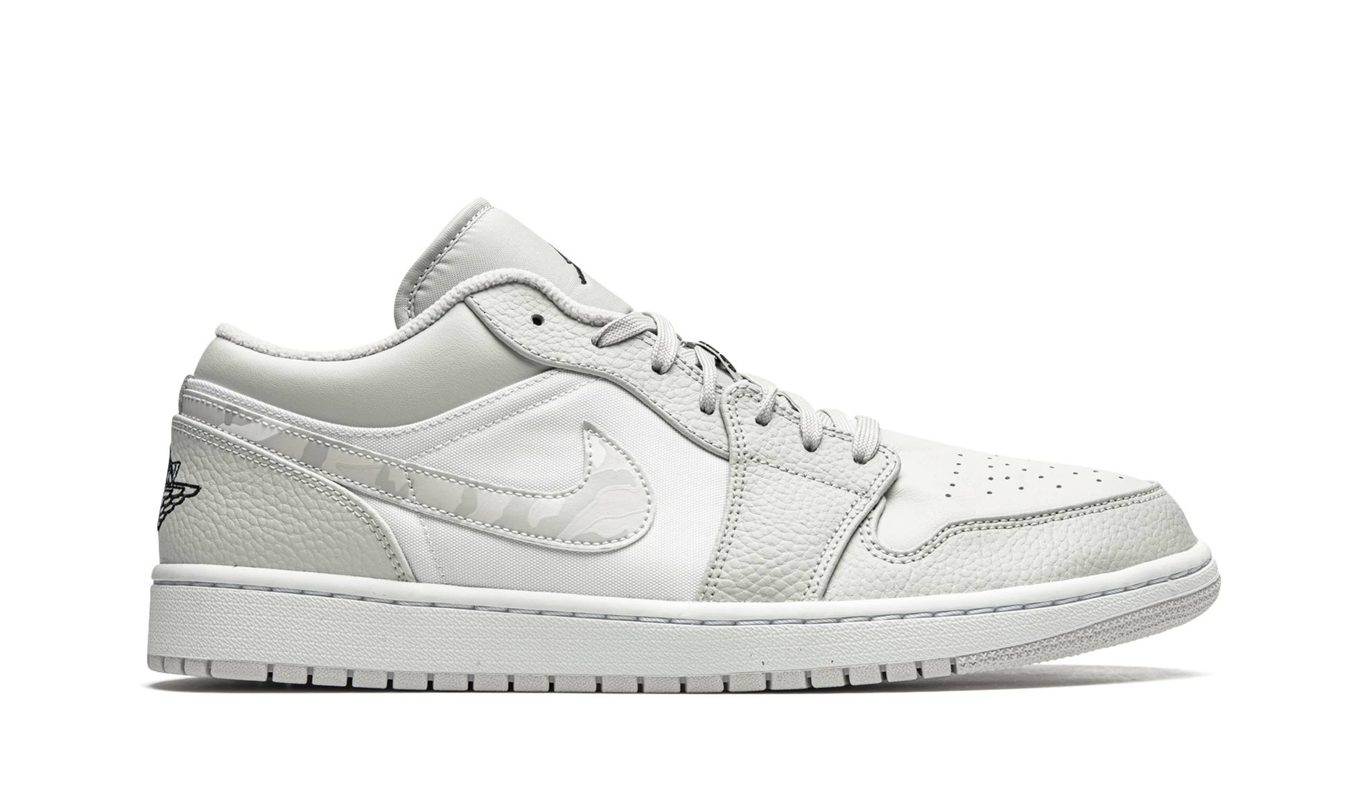The Air Jordan 1 Low “White Camo” is a versatile and desirable low-top version of Michael Jordan’s signature shoe with a subtle camouflage pattern. This refined look for the Jordan 1 Low features light grey tumbled leather overlays on the forefoot and eyelets. Contrasting white perforated leather appears on the toe and a smooth variant of the material covers the mid-panel. Branding, like the “White Camo” leather Swoosh located on either side, as well as the mini black Jumpman embroidery the tongue and “Wings” emblem on the heel, add classic styling to the Air Jordan 1. White Camo