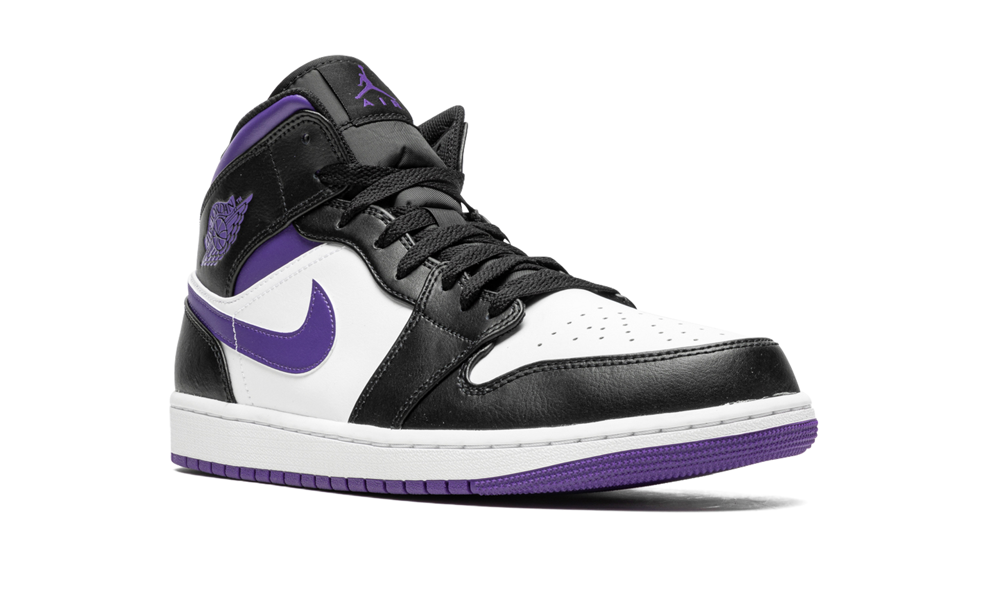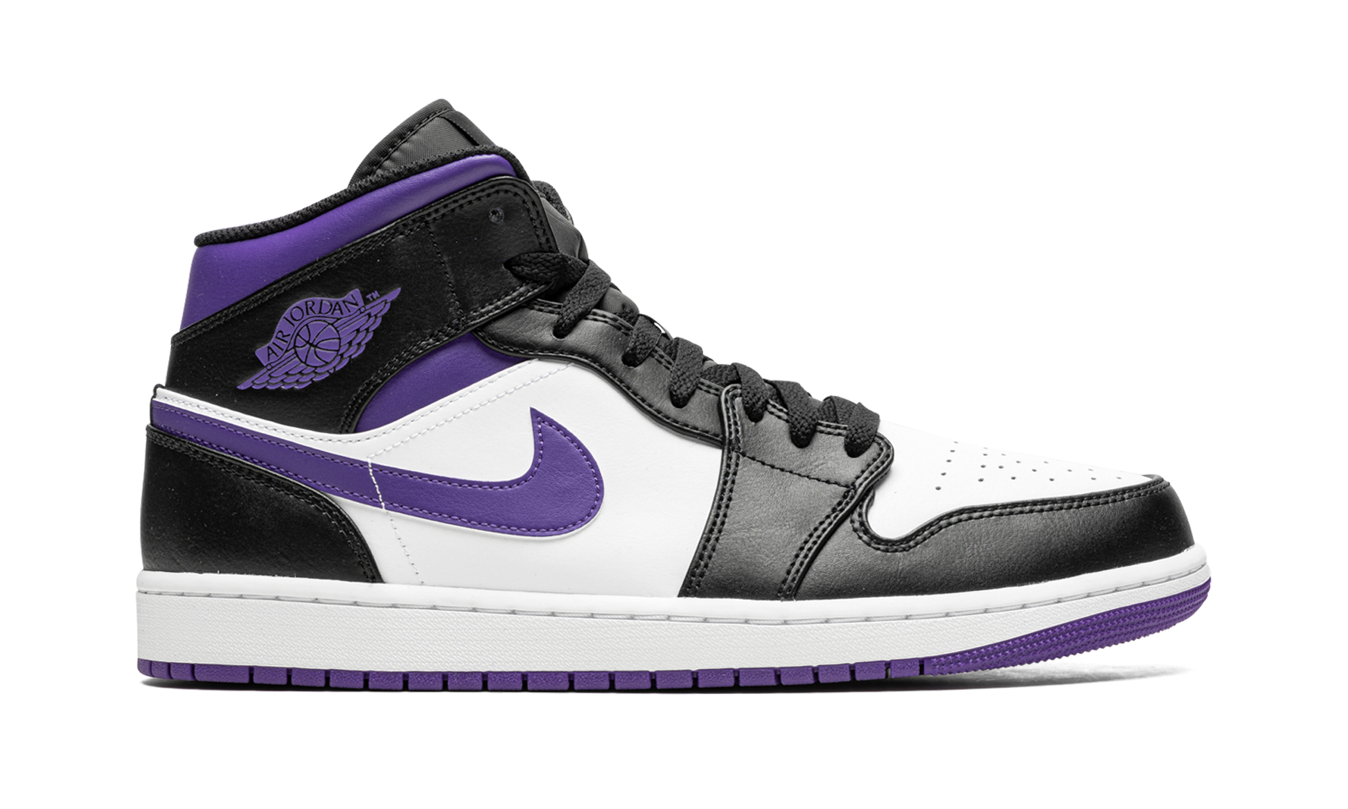 The Air Jordan 1 Mid “Dark Iris” is a colorway of the mid-top version of Michael Jordan’s first signature shoe that unofficially shows love to the Sacramento Kings. Dressed in the basketball team’s black, white, and purple team uniform colors, the “Dark Iris” is in no way affiliated with the Kings, but brings to mind all of the great Player Exclusive Air Jordan colorways worn by former Kings players and Team Jordan members Mike Bibby and Mitch Richmond. The shoe features a white perforated leather toe and mid-panel. Contrasting black leather overlays appear on the forefoot, eyelets, collar, and heel. A Dark Iris leather Swoosh is found on the sides. The purple hue also appears on the “Wings” logo, on the collar, and on the Jumpman and “Air” branding on the tongue tag. Dark Iris