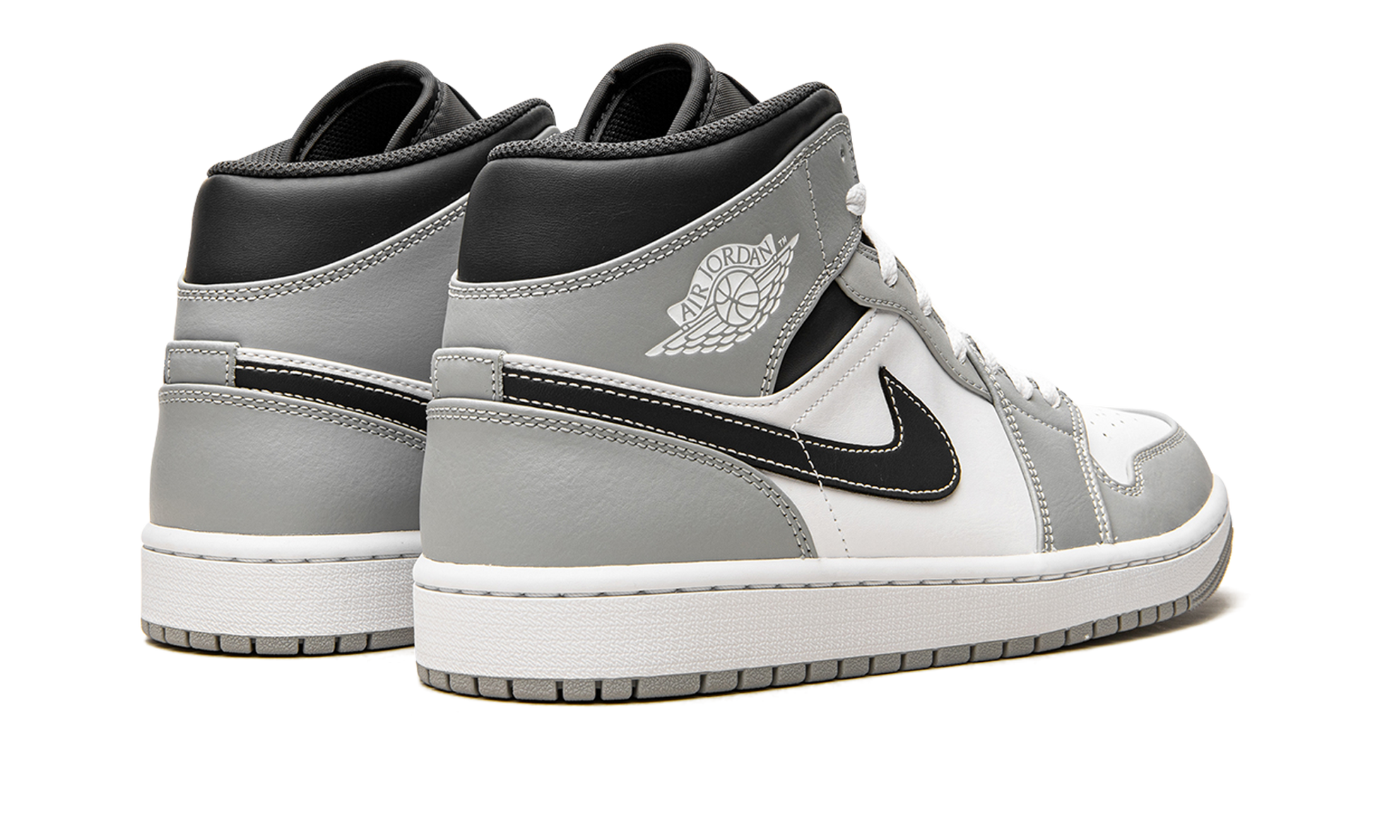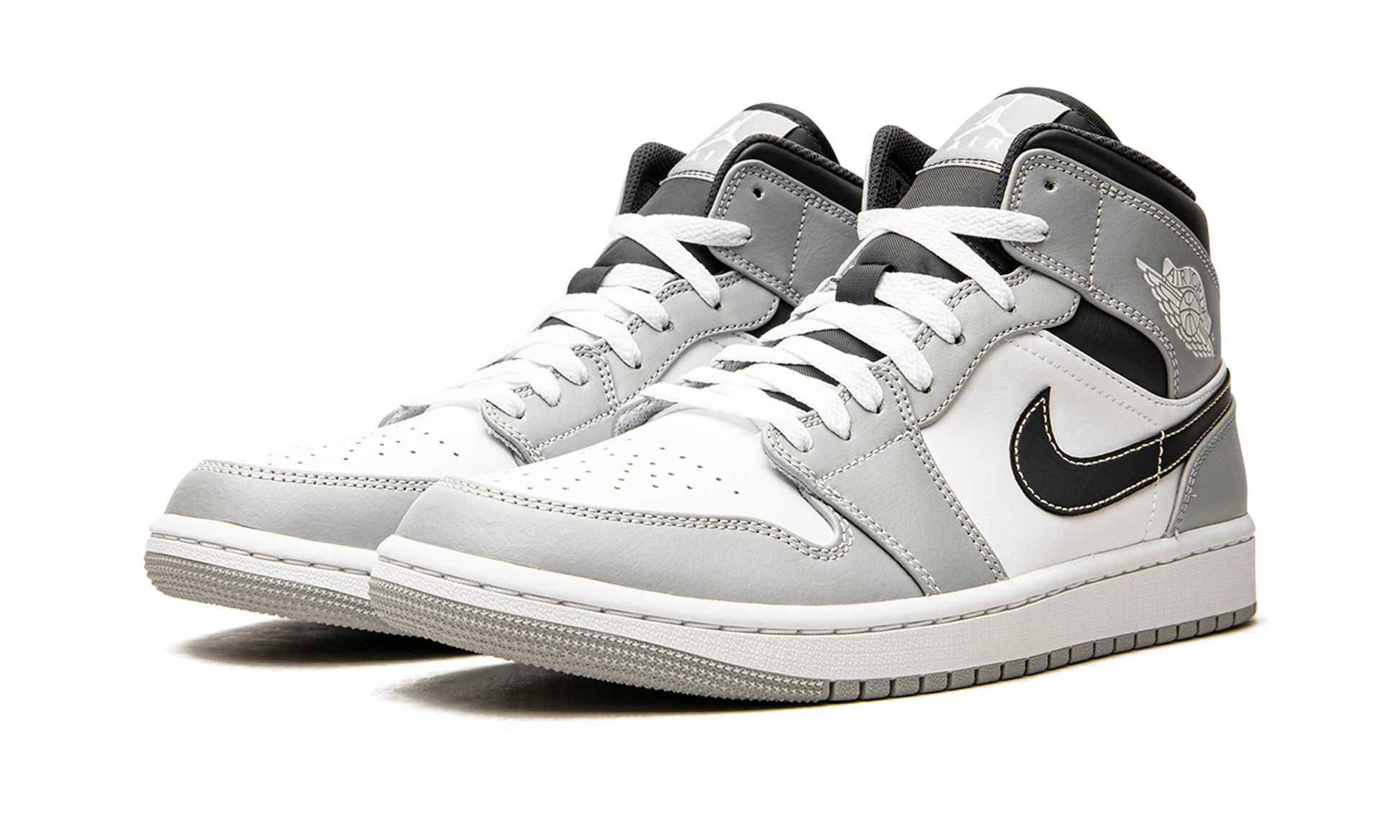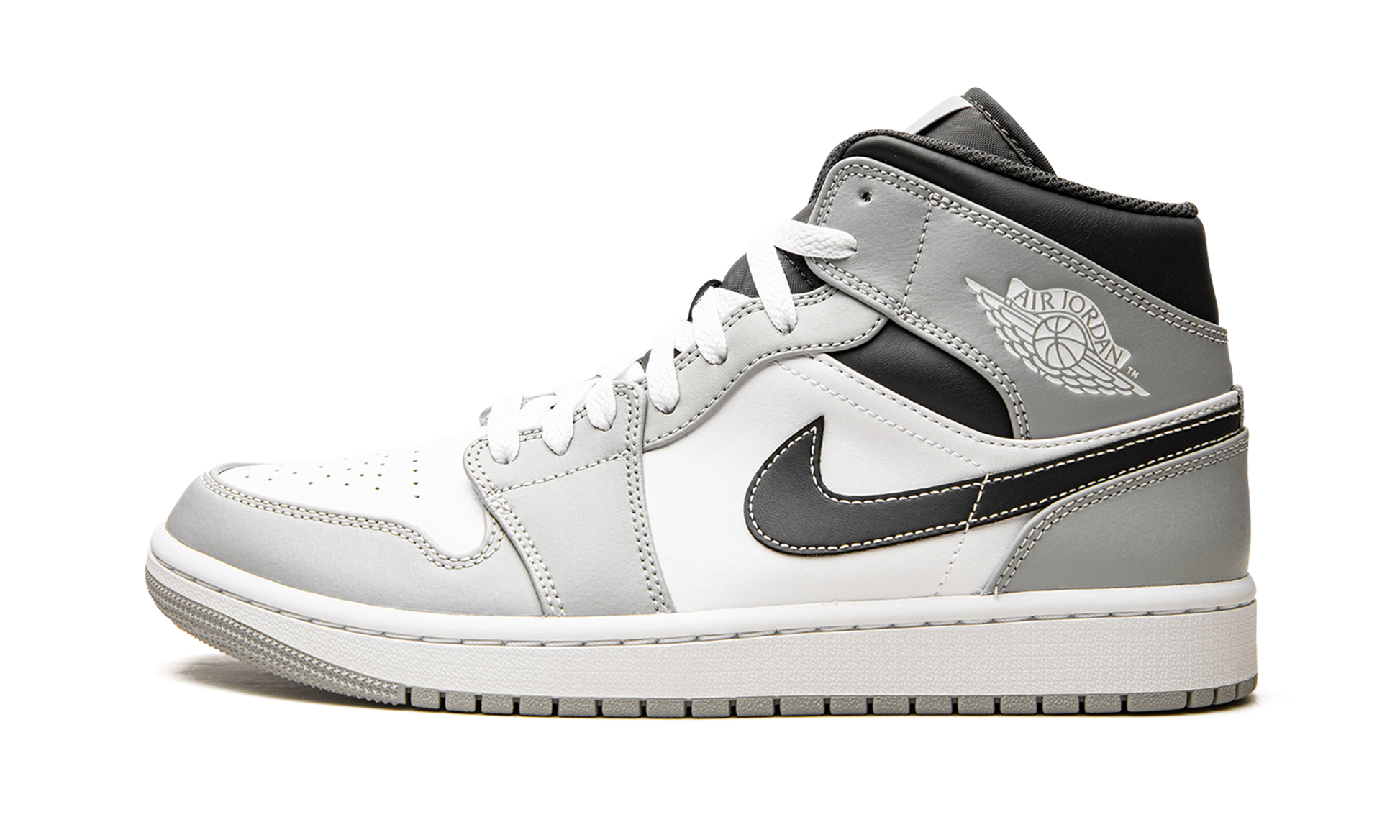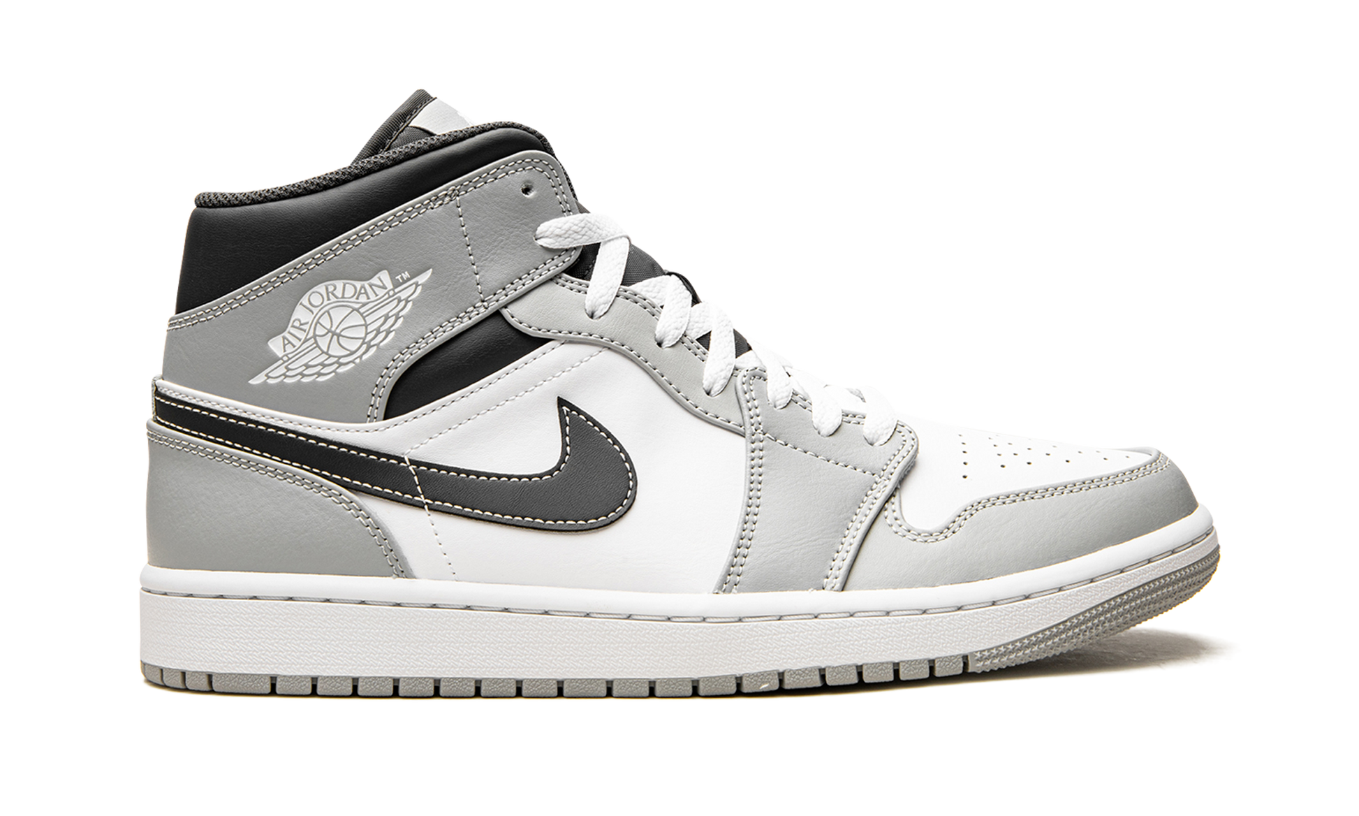 The Air Jordan 1 Mid “Light Smoke Grey 2.0” is a versatile, neutral-based colorway of the lifestyle shoe that can be worn with anything. The “Light Smoke Grey 2.0” features a white leather design with Light Smoke Grey leather overlays on the toe, forefoot, and eyelets and Anthracite-colored leather panels on the collar and heel. A black leather Swoosh appears on the sides and a white “Wings” logo is found on the collar. Grey Jumpman branding lands on the tongue tag. Light Smoke Grey 2.0