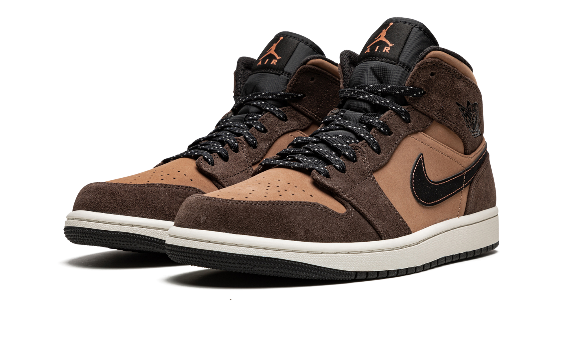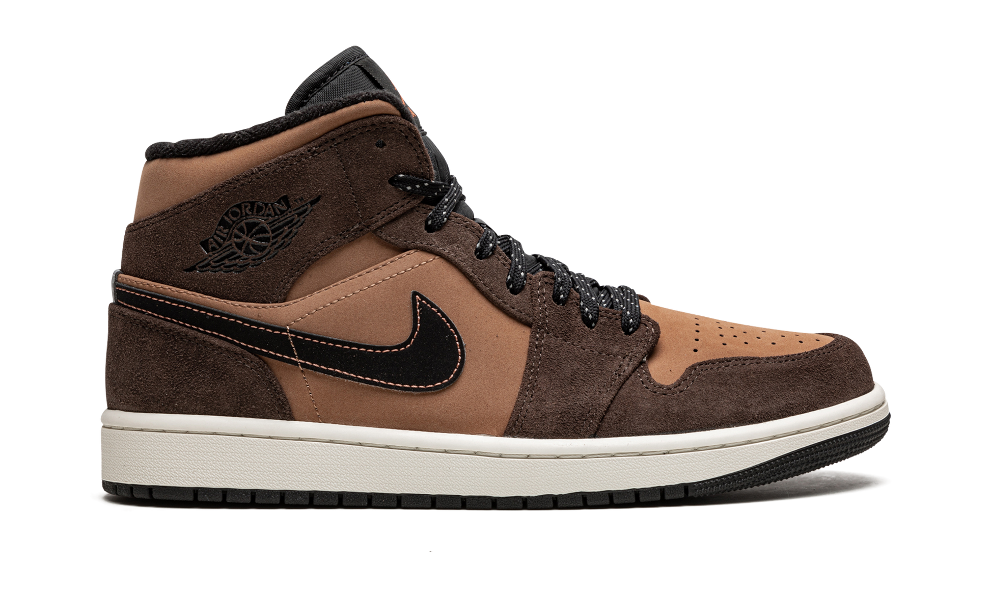 The Air Jordan 1 Mid SE “Earth Tone” is a rugged update to Michael Jordan’s first signature shoe in the popular mid-top style that features earth tones on its design. Living up to its nickname, the “Earth Tone” colorway of the retro basketball shoe is assembled in neutral, earth tones like brown and tan for an autumnal look. Dark Chocolate-colored suede appears on the overlays. The perforated toe, mid-panel, and collar appear in a lighter brown shade of synthetic nubuck. A black Swoosh with brown contrast stitching appears on both sides of the shoe and a black “Wings” logo is located on the collar. Classic Jumpman and “Air” branding in tan contrast the look of the black nylon tongue tag found on the black nylon tongue. Black laces with white speckles complete the design. Earth Tone