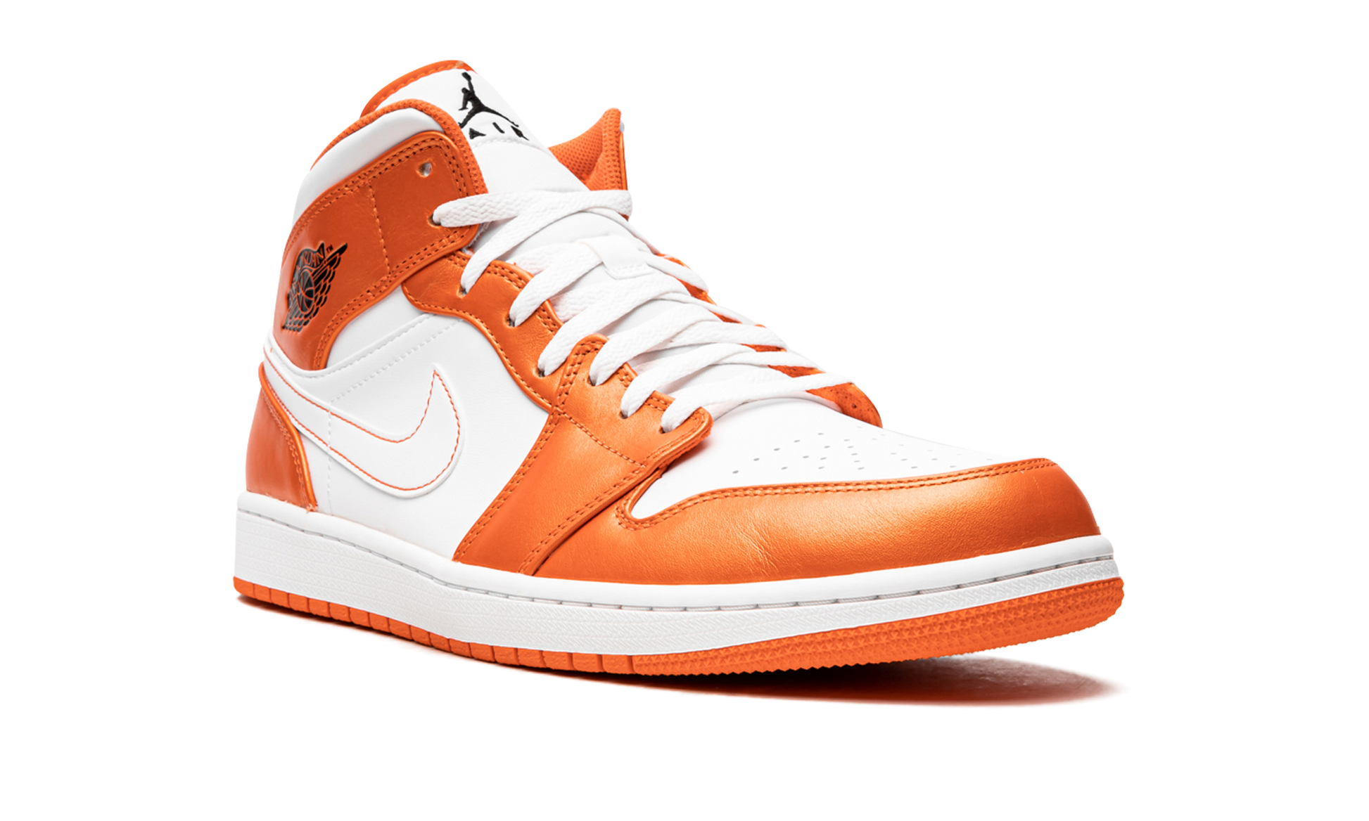 The Air Jordan 1 Mid SE “Electro Orange” is a bold colorway of the mid-top version of Michael Jordan’s first signature shoe. Despite never appearing on Michael’s feet during his time in the NBA (the Air Jordan 1 Mid debuted in the mid-2000s after he had retired from basketball), the mid-top silhouette is one of the more popular Air Jordans in Jordan’s collection, and it’s easy to see why on the “Electro Orange.” The white-and-orange color block brings to mind the classic Nike Dunk “Syracuse” from the “Be True to Your School” pack from 1985. On the “Electro Orange,” white leather appears on the perforated toe, mid-panel, collar, and Swoosh. Contrasting glossy Electro Orange leather can be found on the various overlays on the upper. A black “Wings” logo resides on the collar and a black Jumpman with “Air” branding appears on the white nylon tongue tag on the white nylon tongue. The two-tone theme continues underneath the shoe with a white rubber midsole and Electro Orange-colored outsole completing the look. Electro Orange