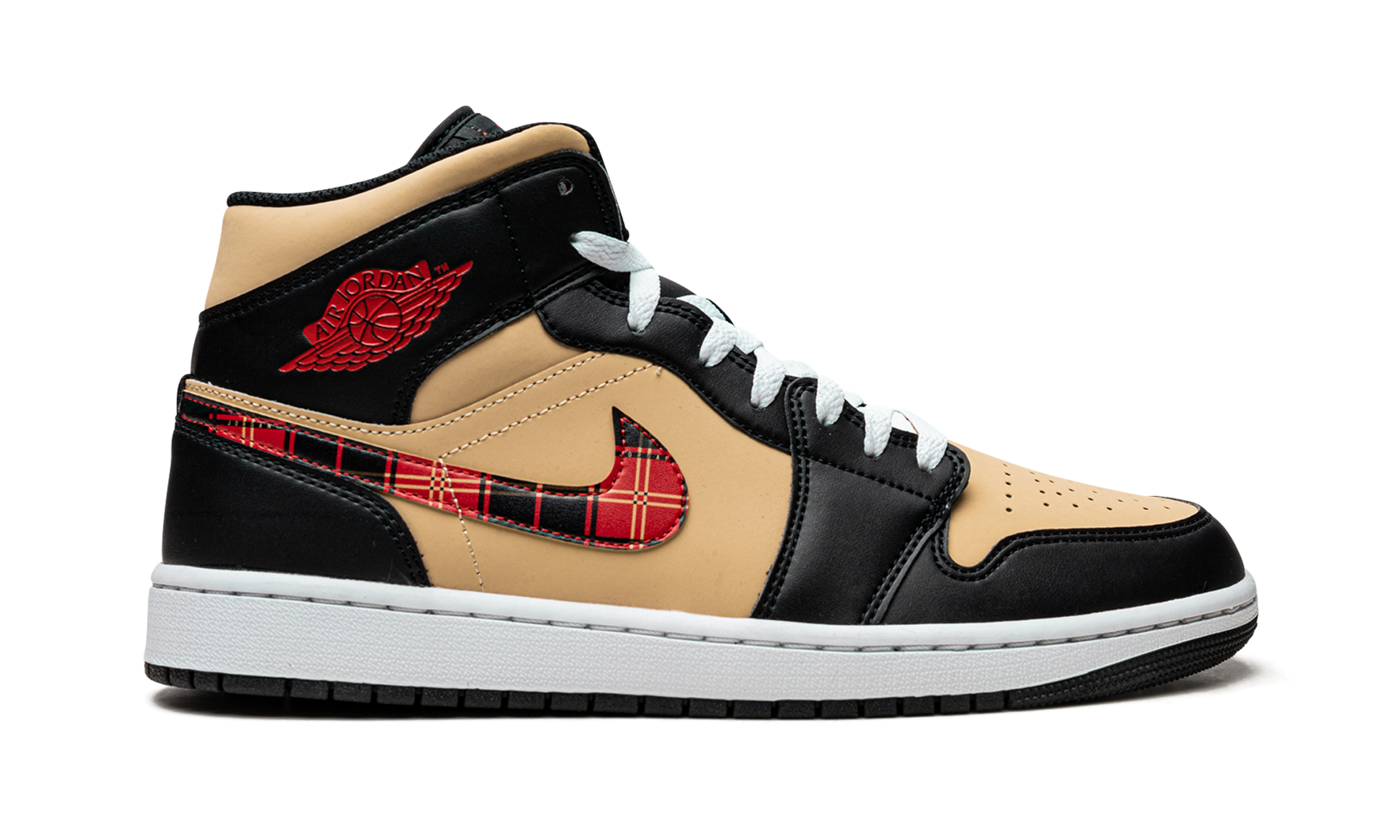 The Air Jordan 1 Mid “Tartan Swoosh” is a unique colorway of the popular lifestyle shoe with a tartan plaid Swoosh. Like its name suggests, the “Tartan Swoosh” updates the Jordan 1 Mid with a plaid Swoosh that gives the shoe a decidedly casual look. The upper features a Sesame-colored leather base with black leather overlays. A red “Wings” logo appears on the collar and a white Jumpman logo is found on the tartan tongue tag. The white rubber midsole is paired with a black outsole. Tartan Swoosh