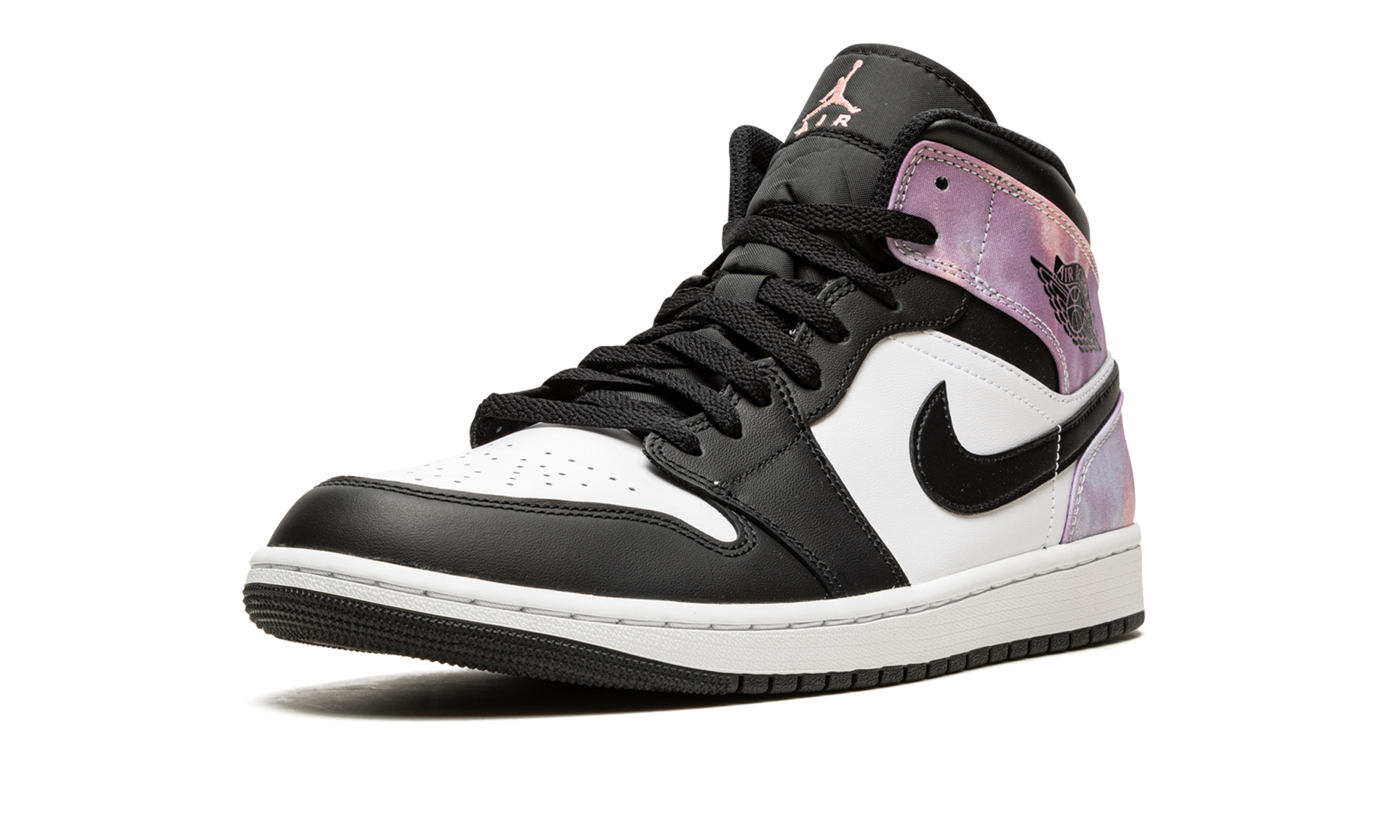 The Air Jordan 1 Mid SE “Tie-Dye” is a clean look for the mid-top sneaker that calls to mind warm weather style. The aptly named “Tie-Dye” features a purple based tie-dye pattern on the collar and heel overlays. The perforated toe and mid-panel are designed in white leather. Contrasting black leather overlays and Swoosh branding balance the look. A black “Wings” logo is found on the collar and a pink Jumpman with “Air” detailing can be found on the black nylon tongue tag. Tie-Dye