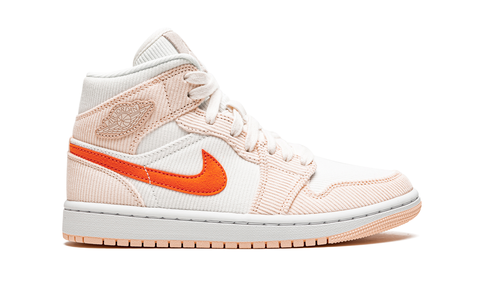 The Women’s Air Jordan 1 Mid SE “Corduroy” is a redesigned look for the women’s version of the mid-top shoe that replaces the model’s original leather design with plush corduroy. A fresh look for the summer months and beyond, the “Corduroy” updates the look of the popular Jordan 1 Mid with a soft-to-the-touch Sail-colored corduroy material on the toe, mid-panel, and collar. Orange Quartz corduroy panels contrast the look and a bright orange suede Swoosh is found on either side. Additional branding efforts include a tonal “Wings” patch on the collar and embossed Jumpman and “Air” insignias on the suede tongue tag. Sail laces sit on a corduroy tongue to round out the look. Corduroy