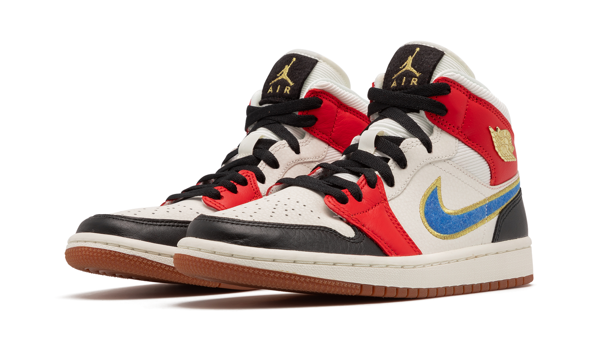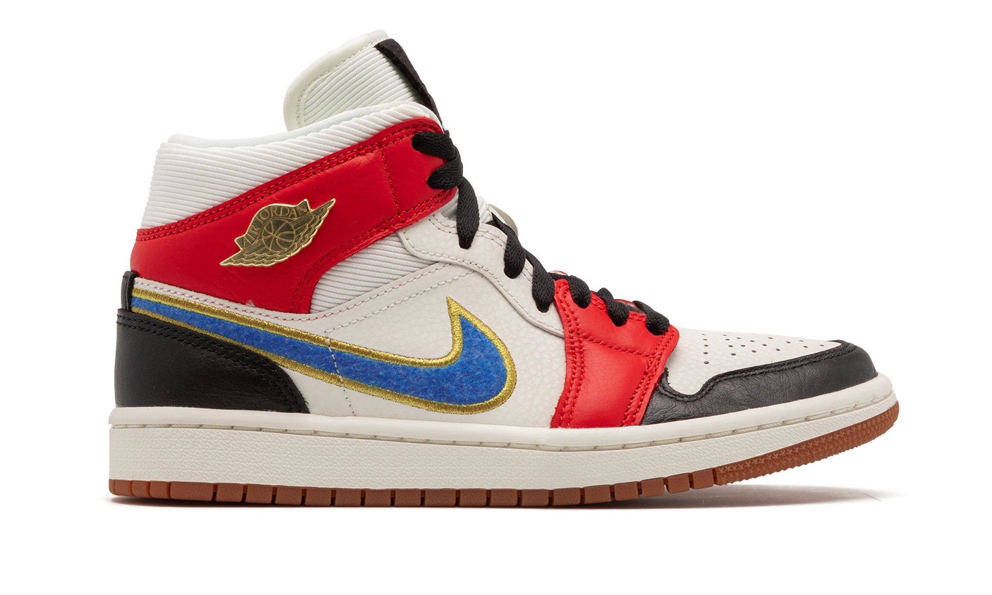 The Women’s Air Jordan 1 Mid SE “Let(Her)man” is a women’s exclusive release of Michael Jordan’s first signature shoe in a colorway inspired by the Jordan Wings scholarship program. Moreover, the “Let(Her)man” is a play on the word “letterman” and its design is influenced by the varsity jackets worn across college campuses. Details include Sail leather on the perforated toe, mid-panel, and middle eyelet overlay. The same hue of cream is applied to the corduroy detailing on the collar and tongue. Both the toe cap and heel feature black leather overlays. Contrasting fiery Chile Red leather overlays can be found on the forefoot and collar. Branding appears in the form of a light blue felt Swoosh with gold outlining on the mid-panel and gold “Wings” emblem on the collar. The same fuzzy material used on the side Swoosh appears on the black tongue tag with gold Jumpman detailing. A cream colored midsole provides an infusion of nostalgic vibes. Release date: November 20, 2020. Let(Her)Man