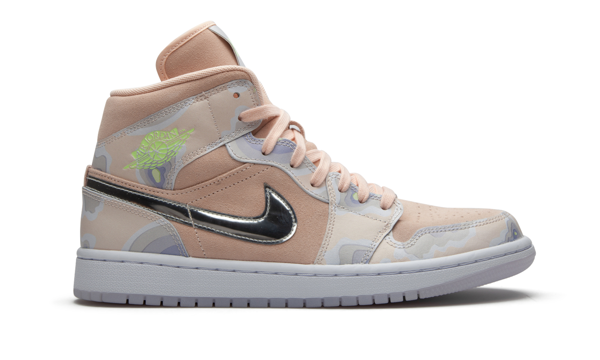 The Women’s Air Jordan 1 Mid “P(Her)spective” is a unique colorway of Michael Jordan’s first signature shoe in mid-top form. This unique P(Her)spective design features pastel hues for an off-the-court appeal. Washed Coral suede forms the base of the upper, appearing on the perforated toe, mid-panel, and collar. Contrasting nubuck overlays on the forefoot, collar, and heel display soothing hues of green and blue. Branding appears in the form of Silver Metallic Swooshes on the mid-panel, neon green “Wings” detailing on the collar, and chrome “Nike Air” patches on the tongue. The Women’s Air Jordan 1 Mid “P(Her)spective” was released on June 20, 2020. P(Her)spective