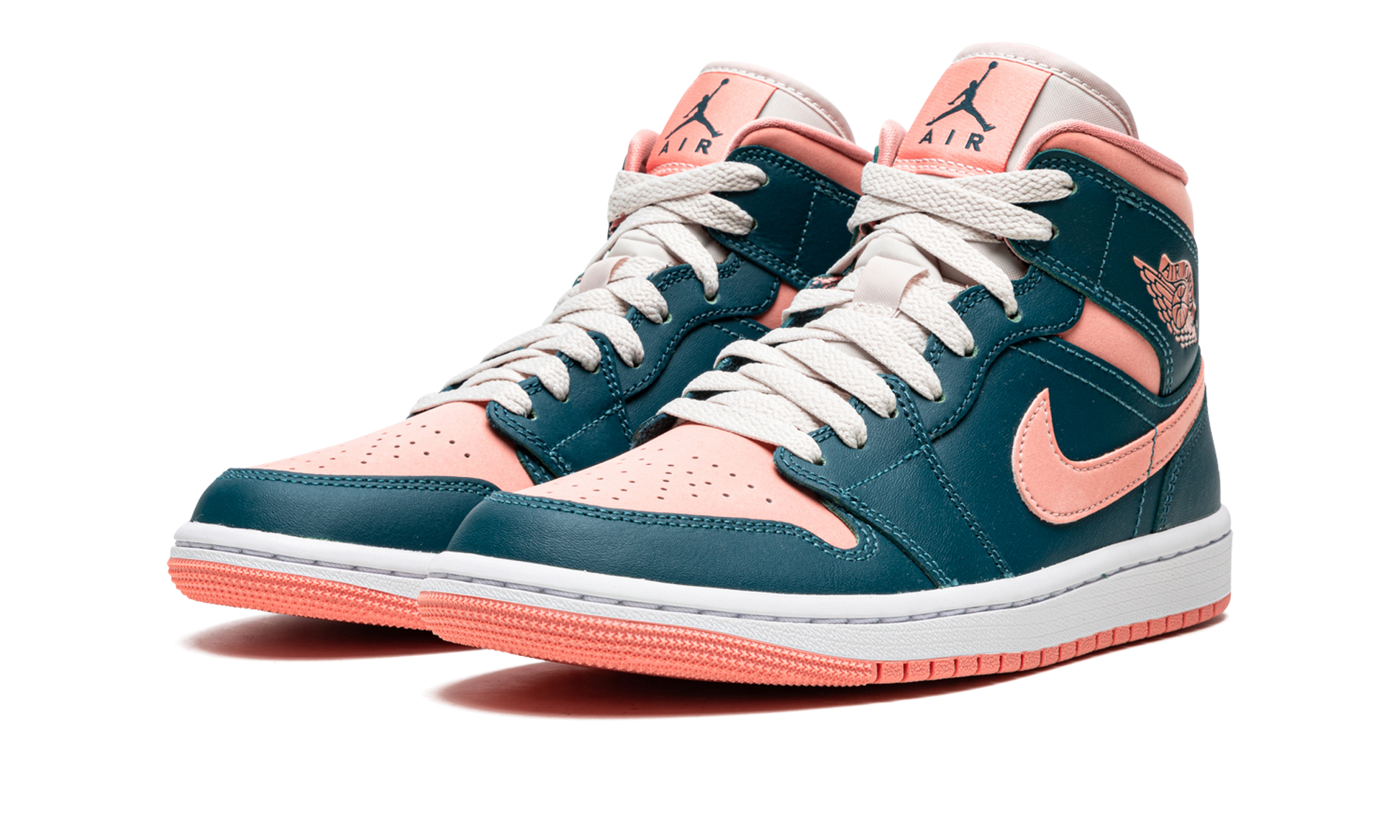 The Women’s Air Jordan 1 Mid “Dark Teal Green” is a women’s-exclusive colorway of the mid-top version of Michael Jordan’s classic basketball shoe that’s primed for warm weather wear. The “Dark Teal Green” elicits a spring and summer vibe with its use of bold colors, specifically with the dark teal leather that appears on the toe cap, forefoot, eyelets, mid-panel, collar, and heel. The perforated toe, collar, Swoosh, and “Wings” logo are featured in pink. Elsewhere, vintage inspired cream laces are layered over the cream nylon tongue. Dark Teal Green