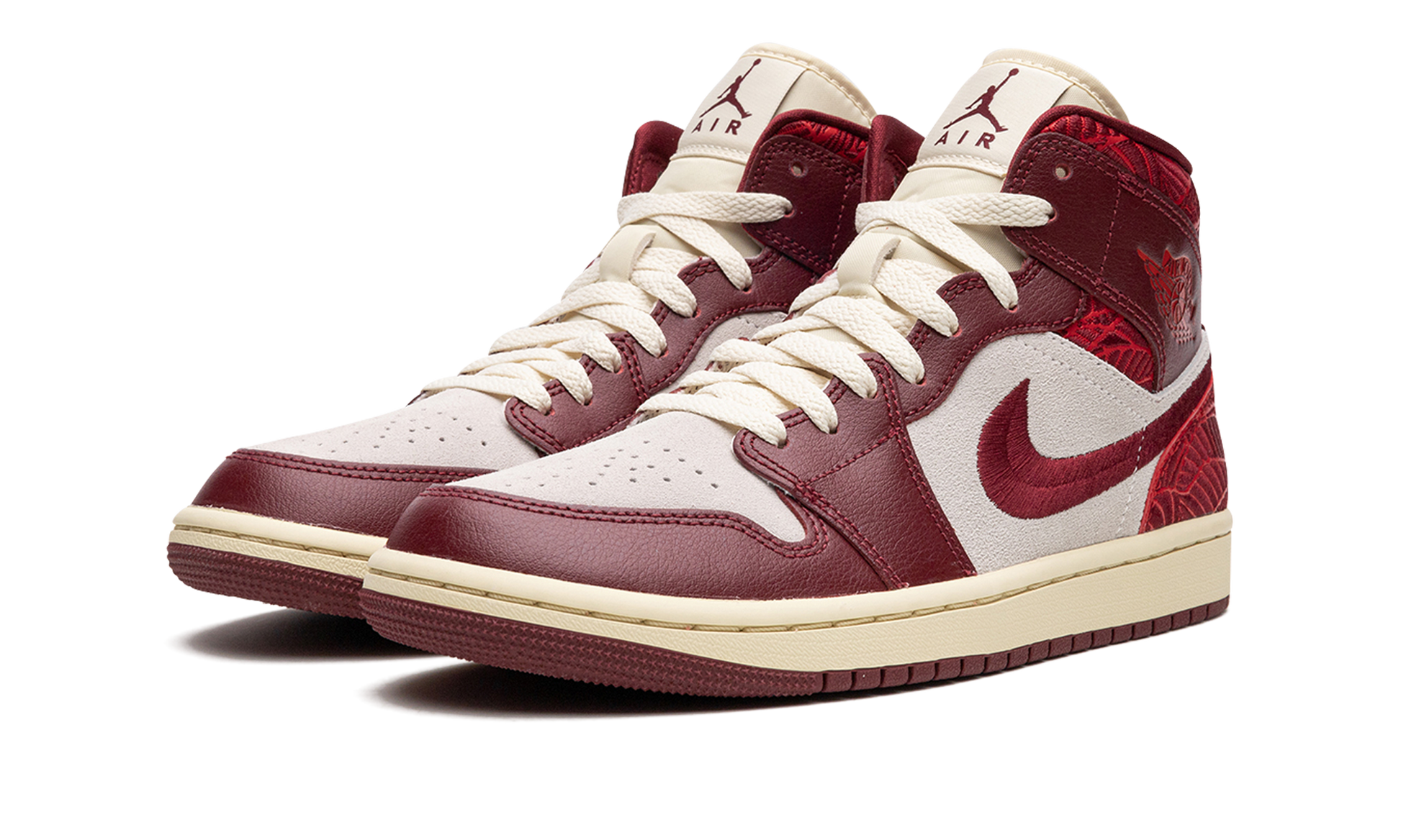 The Women’s Air Jordan 1 Mid “Tiki Leaf” is a women’s-exclusive colorway of the lifestyle shoe with tropical-inspired detailing. The always popular Jordan 1 Mid receives a warm weather inspired design on the “Tiki Leaf” colorway. The shoe features a Sail suede base with contrasting red leather overlays. A red Swoosh is embroidered on the sides and a red “Wings” logo can be found on the collar. Additional red branding appears in the form of Jumpman and “Air” logos on the tongue tag. The red leather overlays on the collar and heel are treated with a tonal tiki leaf pattern. Release date: March 1, 2023 Tiki Leaf