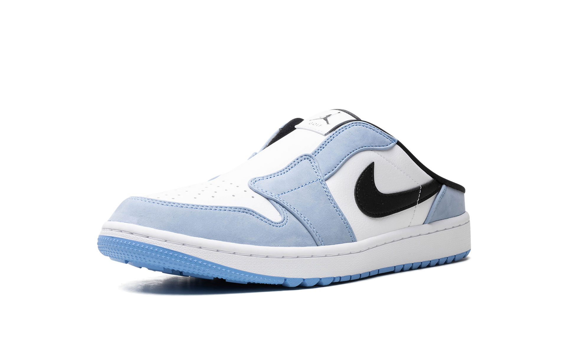 The Air Jordan Mule Golf “University Blue” is a mule-style golf shoe inspired by the Air Jordan 1 Low in a “UNC” inspired colorway. An evolution of the Air Jordan 1 Low Golf, the Jordan Mule Golf debuted in 2024 and is an ideal option for post-activity wear or for the golf course. The shoe features a white leather base with University Blue suede overlays and a black leather Swoosh on the sides. The shoe’s mule-style construction allows for easy slip-on entry and exit. Underfoot, ridges on the outsole ensure traction on or off the fairway. Release date: March 21, 2024 University Blue