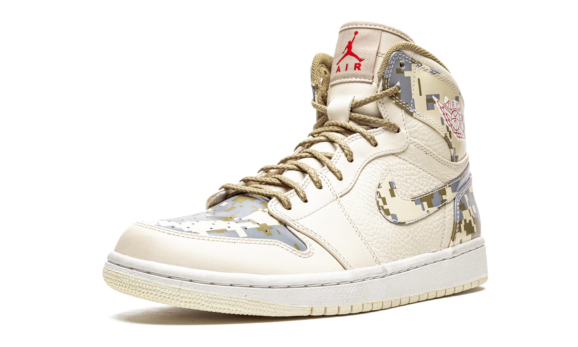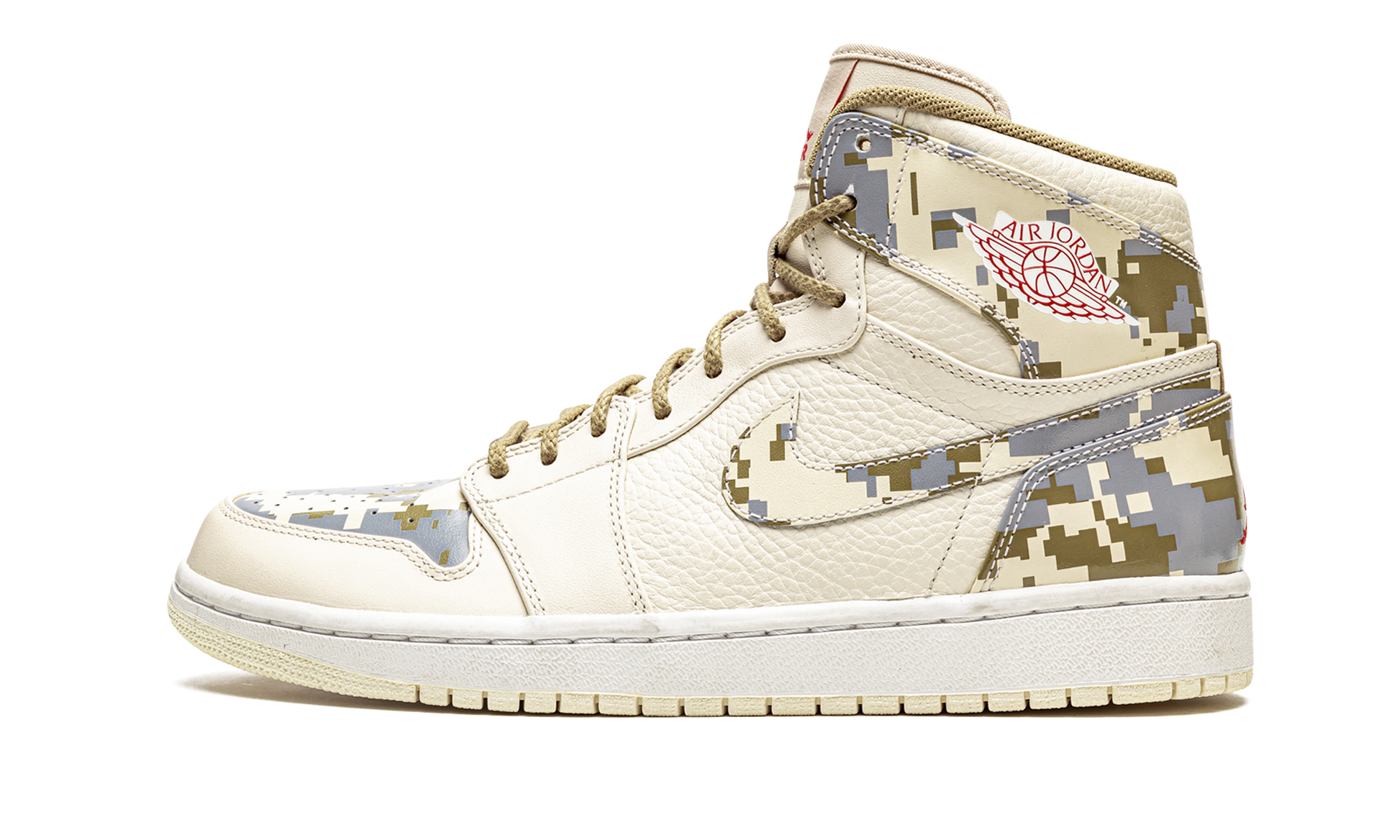 The Air Jordan 1 High OG Sample “Digi-Camo” is an unreleased sample version of Michael Jordan’s first signature shoe in a military-influenced colorway. The rugged appearance of this sneaker is highlighted by its brown rope laces and earth tone leather design with contrasting digital camo details. Specifically, the perforated toe, collar, heel, and Swoosh feature a brown, green, and beige digi camo pattern that contrasts with the tan leather that appears on the forefoot, mid-panel, and eyelets. A red Jumpman logo is found on the tongue tag on the tan nylon tongue. This limited “Digi-Camo” look features a white midsole and beige outsole. Please note: this item’s box and product label are damaged. Digi-Camo