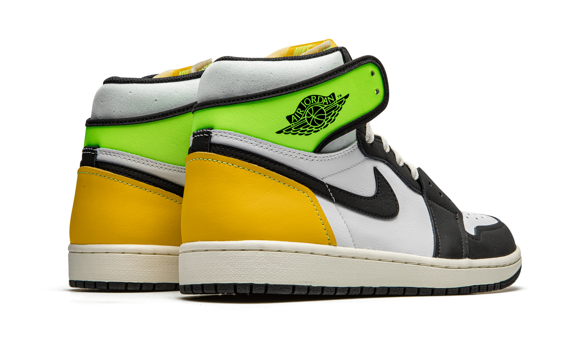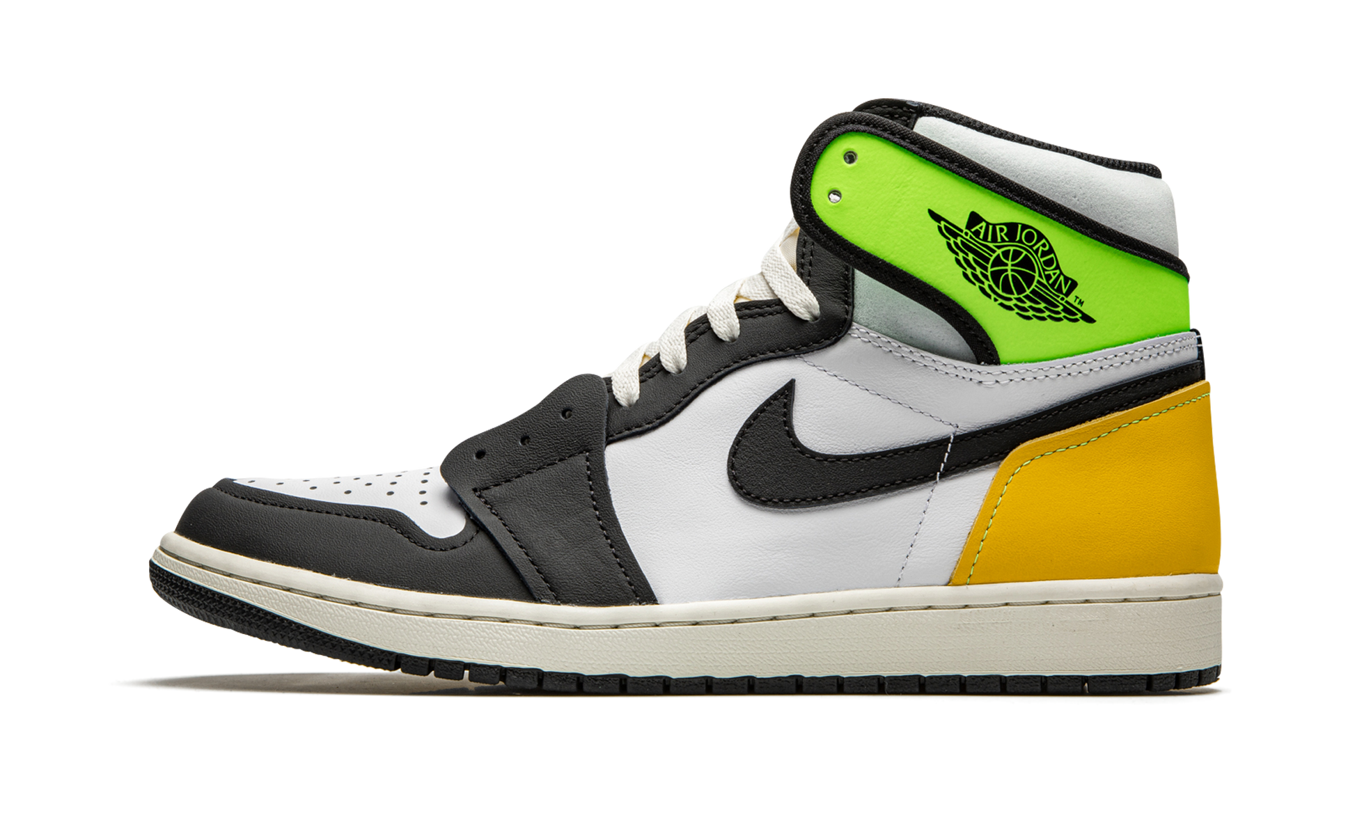The Air Jordan 1 High “Volt Gold” is a “do-it-yourself” inspired colorway of Michael Jordan’s first signature shoe that was released by Jordan Brand in early 2021. Crafted in the spirit of Off-White and Virgil Abloh’s deconstructed Air Jordan 1s from the coveted “The 10” collection, the “Volt Gold” features contrasting hues of neon yellow and gold on its design, as well as "overcut" leather panels that extend past the stitching. White leather can be found on the perforated toe and mid-panel. Contrasting black leather appears on the forefoot, toe cap, and eyelets. A black “Wings” logo can be found on the Volt collar overlay and a black Swoosh appears on either side of the shoe. Additional details include a gold leather panel on the heel, cream shoe laces, and a vintage-inspired cream midsole. An inverted orange-tinted translucent “Nike Air” tongue tag appears on the cream nylon tongue. Release date: January 9, 2021. Volt Gold