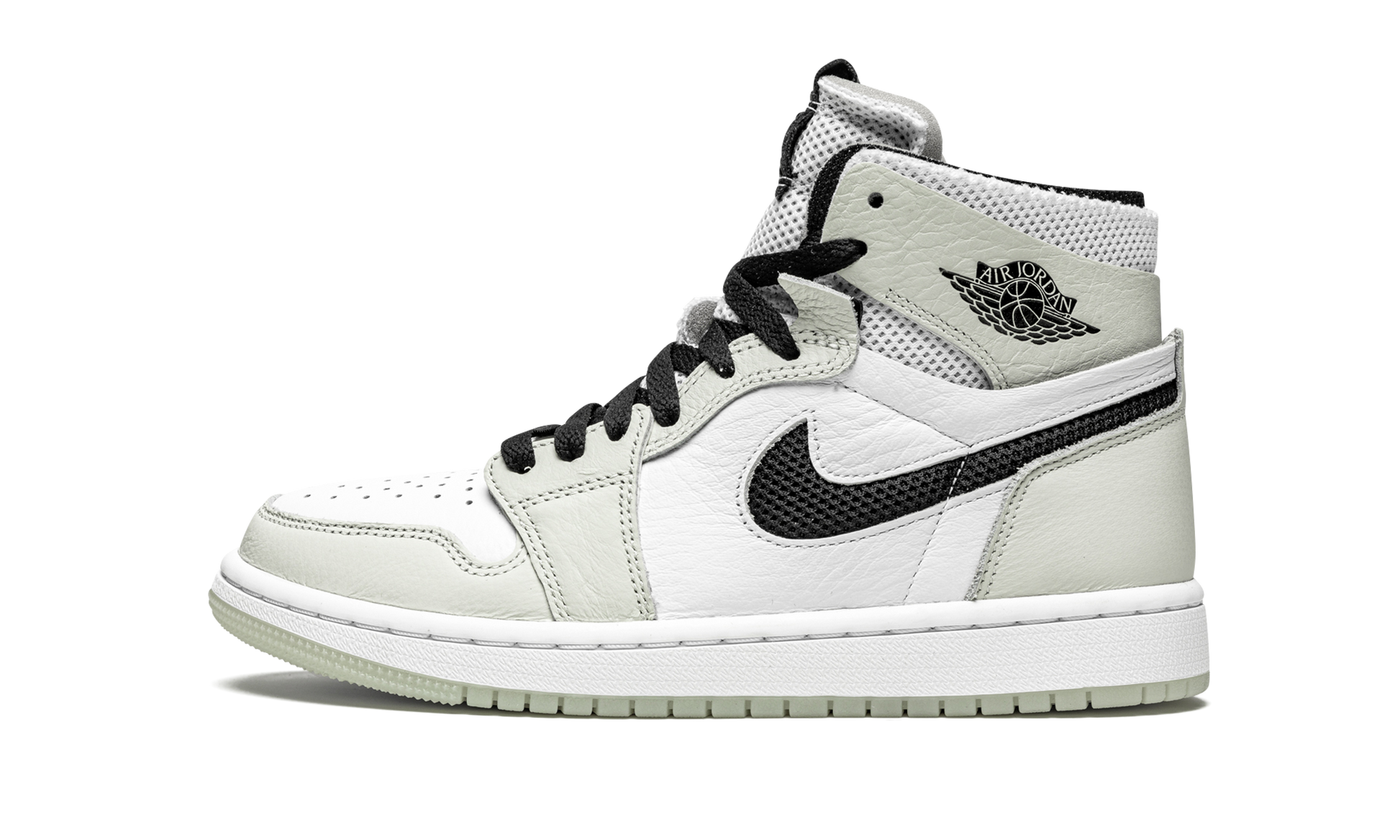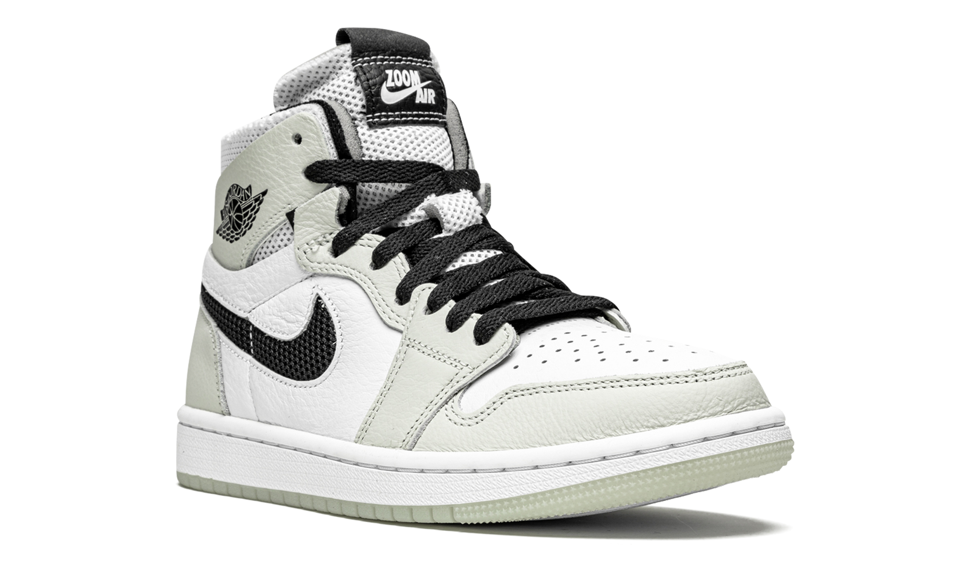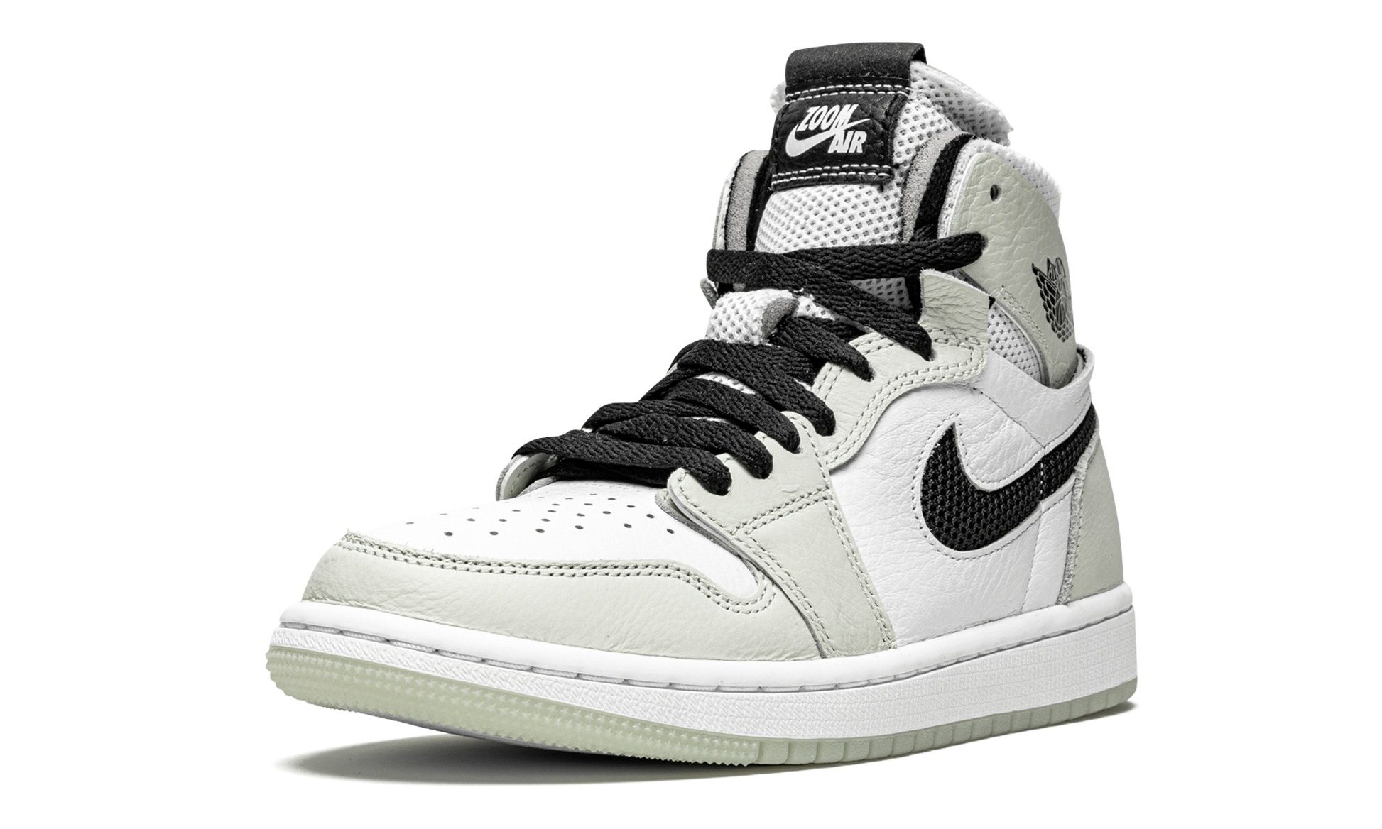 The Women’s Air Jordan 1 High Zoom CMFT “Light Bone” is a women’s exclusive colorway of the modern interpretation of Michael Jordan’s first signature shoe by Jordan Brand. Introduced in 2020, the Air Jordan 1 Zoom Comfort presents a new vision of the iconic retro basketball and lifestyle shoe that includes even more padding around the collar, Zoom Air technology in the sole, and a modern “do-it-yourself” design that includes exposed foam padding and rough-cut overlays. White tumbled leather graces the perforated toe and mid-panel. A low-contrast of White Bone leather appears on the forefoot, eyelets, collar, and heel. Black mesh resides in the cut-out negative space of the Swoosh on either side. Both the collar and tongue are constructed from white mesh for excellent breathability. White “Zoom Air” branding is printed on the black leather tongue tag to signify the model’s updated cushioning system underfoot. The new technology replaces the standard Air unit found in the original Air Jordan 1 High OG model. Light Bone