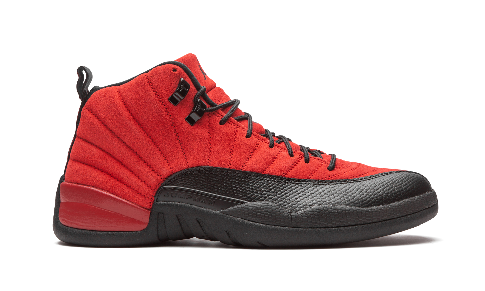 The Air Jordan 12 “Reverse Flu Game” rearranges the color block of an original colorway of Michael Jordan’s twelfth signature shoe. The “Reverse Flu Game” inverts the classic black leather upper and red pattern leather mudguard of the original Jordan 12 worn by Michael most famously during his epic “Flu Game” performance of Game 5 of the '97 NBA Finals. Whereas the original "Flu Game" featured a leather upper, the "Reverse Flu Game" displays a plush Varsity Red suede construction. The mudguard features a contrasting cut of black pebbled leather. The black rope laces sit on top a red suede tongue. A nod to the original design of the Air Jordan 12, the tongue displays a black embroidered Jumpman on the top and black "Two 3" branding beneath the laces. Additional design elements include a carbon fiber midfoot plate, two traction pods on the black outsole, and a red Jumpman on the toe. Release date: December 26, 2020. Reverse Flu Game