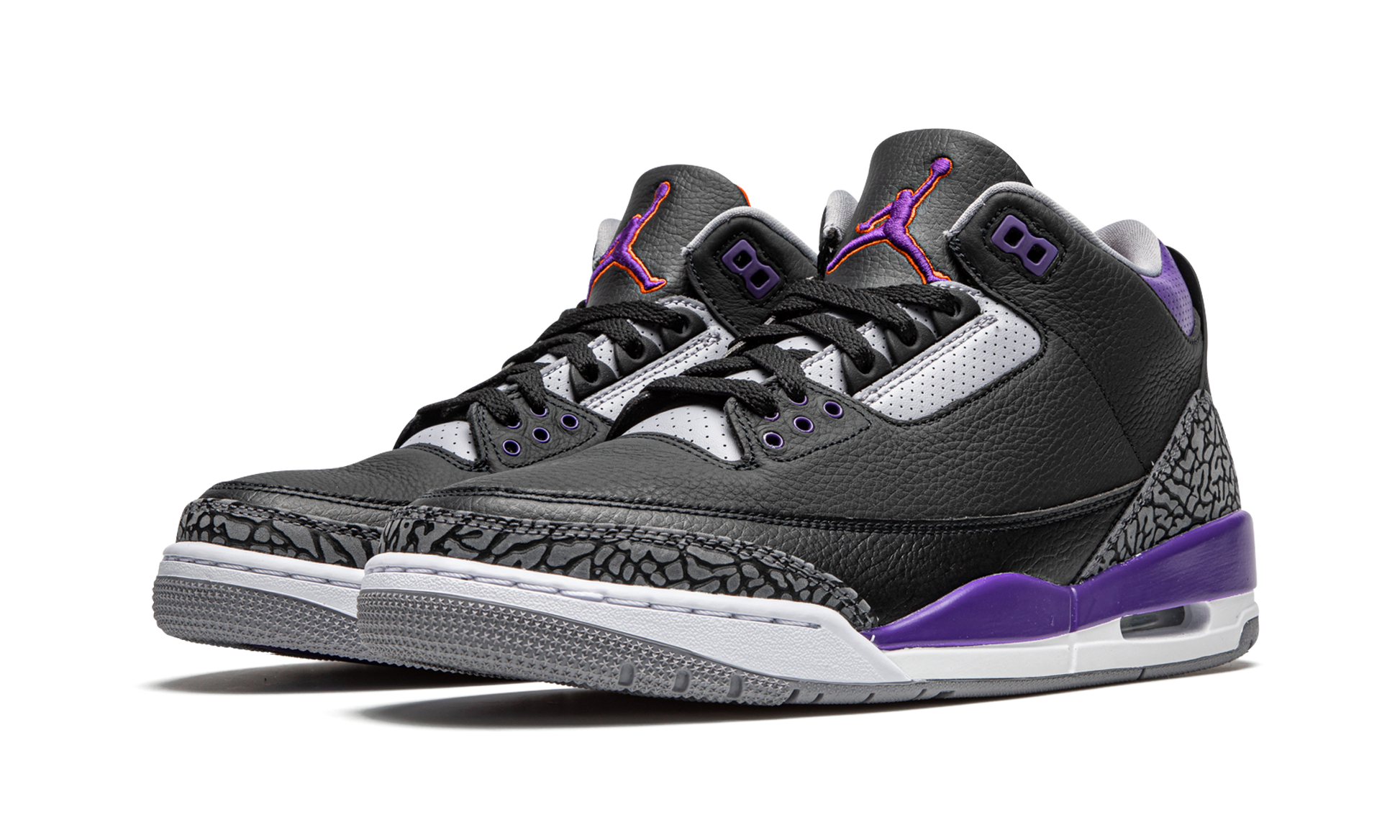 The Air Jordan 3 “Court Purple” is an unofficial nod to the Phoenix Suns as the colorway appears dressed in the team’s uniform colors. One of Jordan Brand Holiday 2020 releases, the “Court Purple” design of Michael Jordan’s third signature shoe features a black tumbled leather upper with purple leather accenting on the collar and on the plastic eyelets. The model’s classic elephant print detailing appears on the mudguard and toe cap. Elsewhere, orange borders the Court Purple embroidered Jumpman stitched onto the black leather tongue and a synthetic purple Jumpman dots the back of the shoe above the orange “AIR” branding. Release date: November 21, 2020. Court Purple