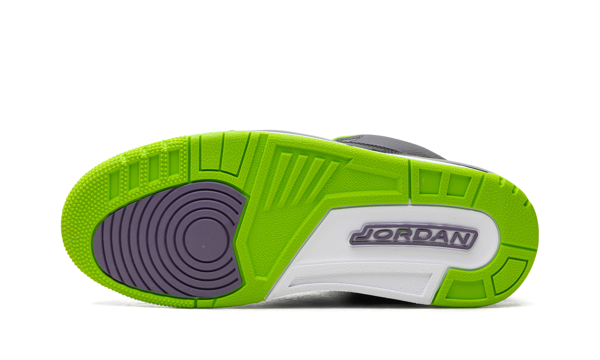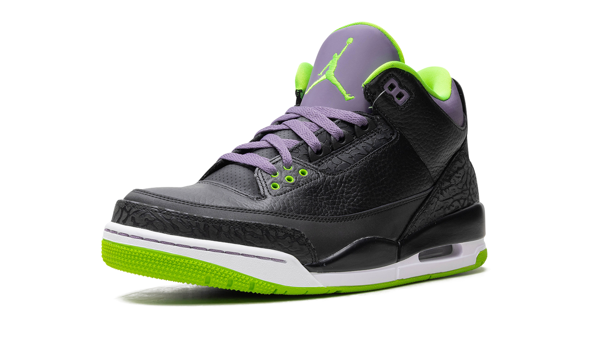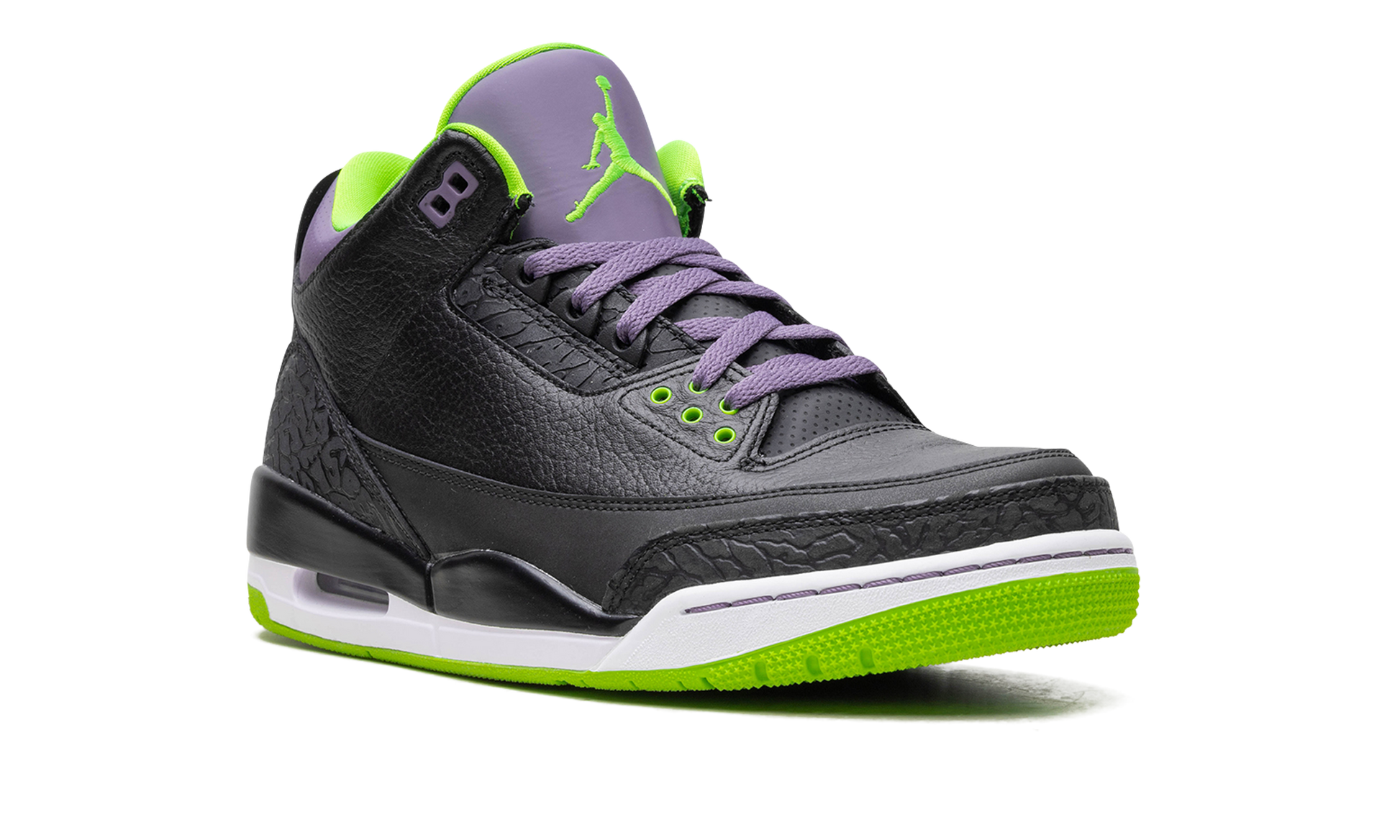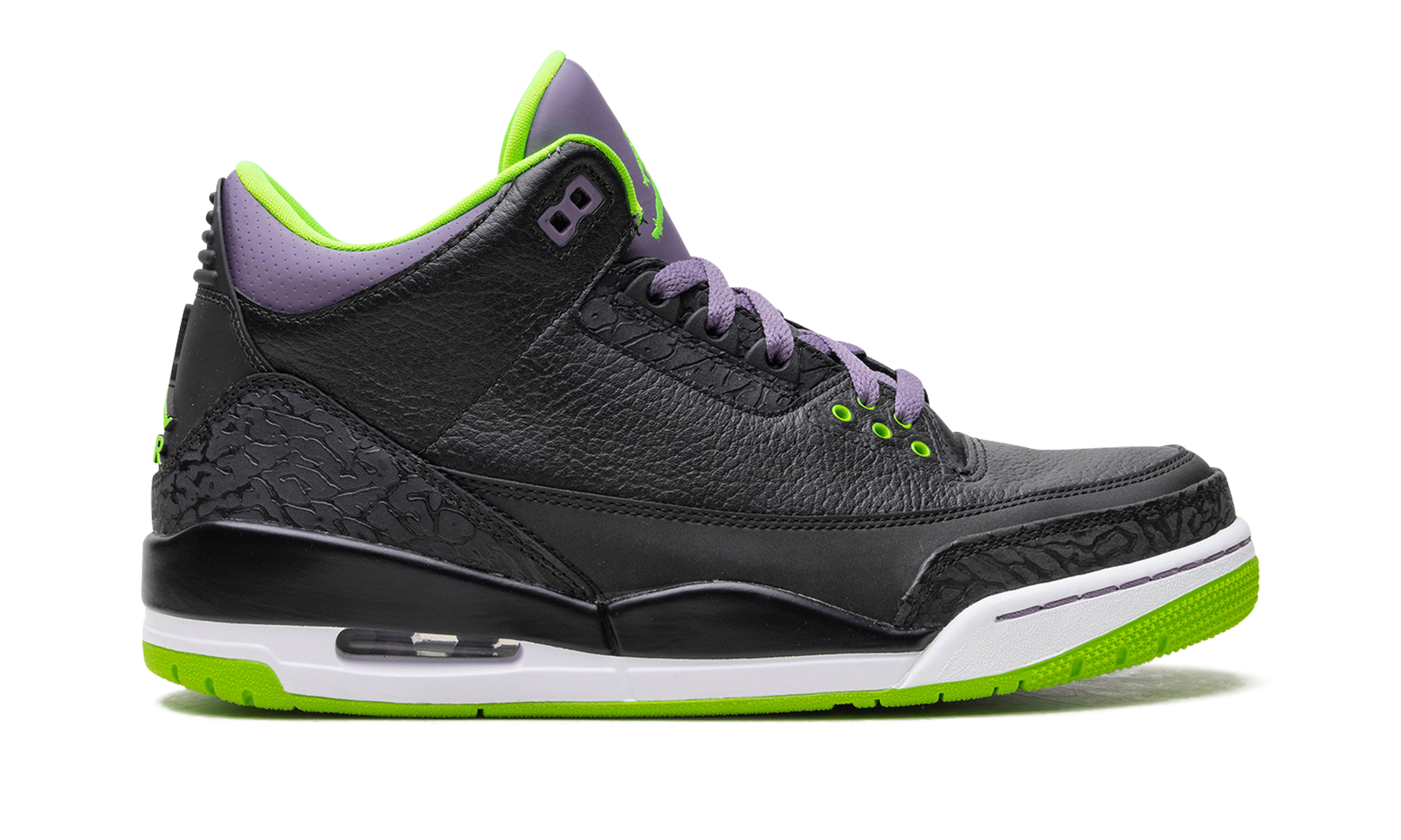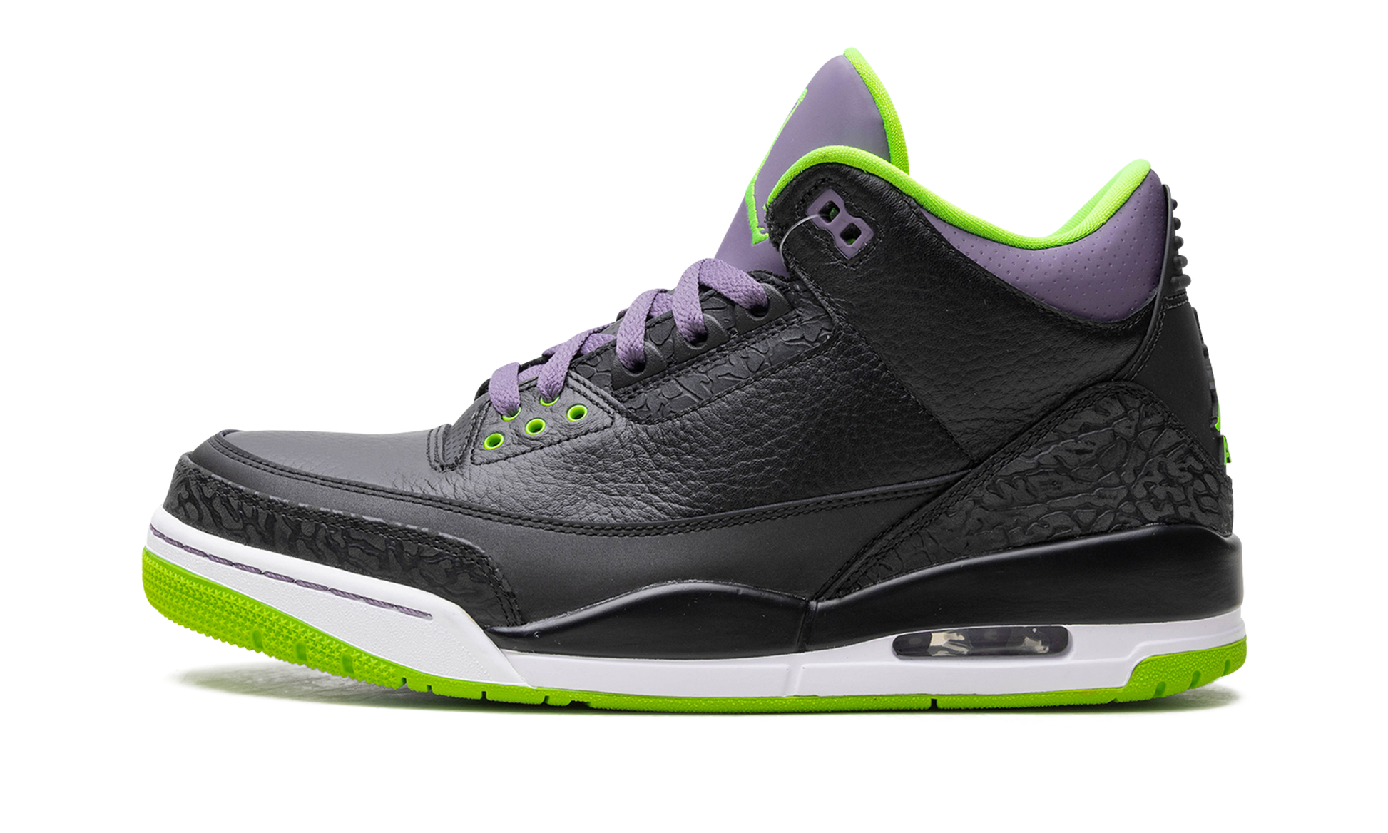 Supplied by a premier sneaker marketplace dealing with unworn, already sold out, in demand rarities. Each product is rigorously inspected by experienced experts guaranteeing authenticity. Due to its similarities in colour to the famous foe of Batman, this Air Jordan 3 in black, green, and purple quickly picked up the “Joker” nickname. Featuring a pebbled leather texture, an ankle length, a brand embossed tongue, a lace-up front fastening, a round toe and a flat rubber sole. Joker