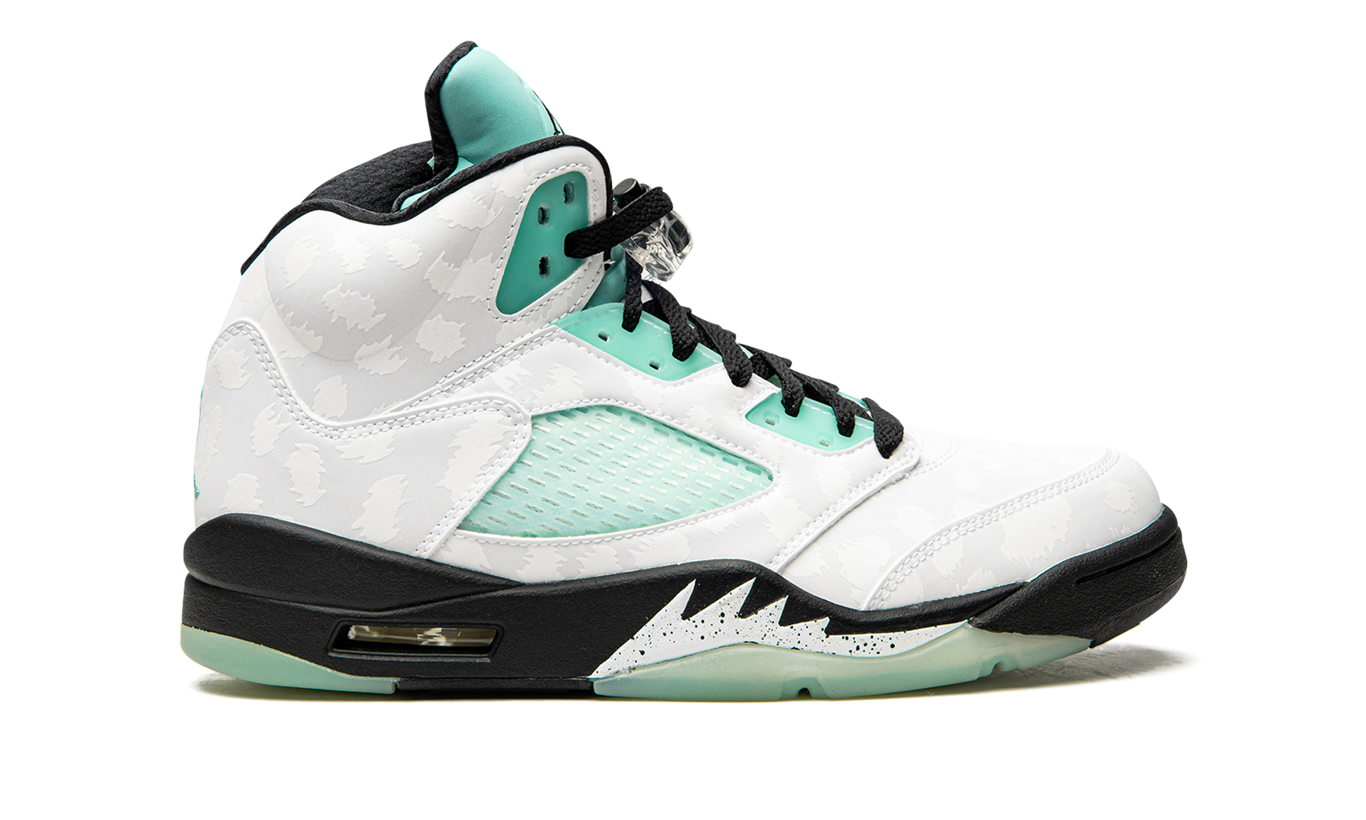 The Air Jordan 5 “Island Green” is inspired by the warm, tropical vibes of island beaches with its light green accents. Michael Jordan’s fifth signature Nike basketball shoe features a premium white leather constructed upper with glossy tonal cheetah spots printed into the design. Soothing Island Green eyelets and netting on the mid-panel and tongue contrasts the sleek upper. An embroidered light green Jumpman covers the heel with black laces and a clear lace lock adding the finishing touches to the upper. The midsole goes all black with white speckled "teeth" detailing, and the translucent rubber portions of the outsole also feature the tropical green hue. Release date: November 11, 2019. Island Green