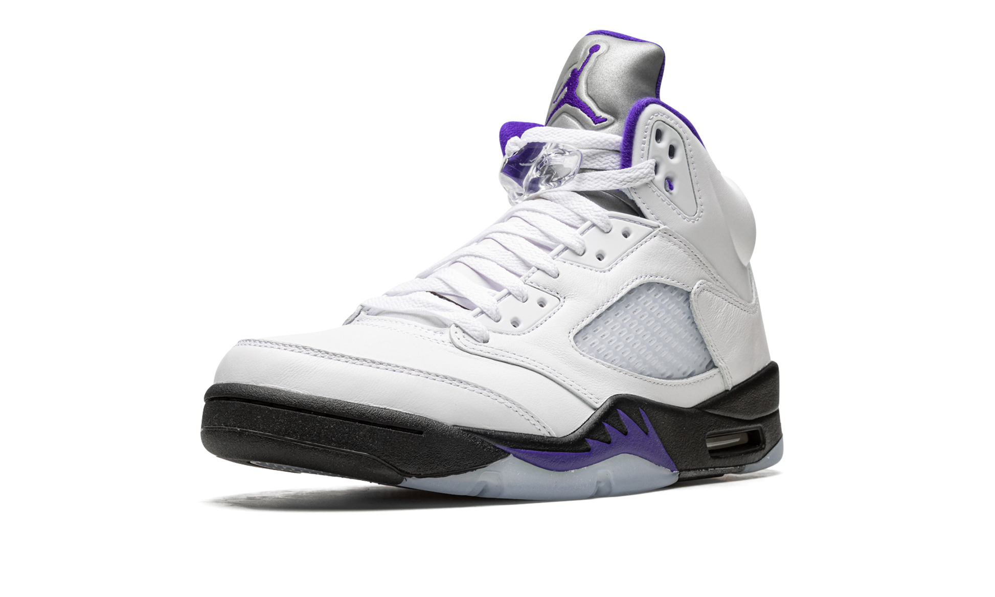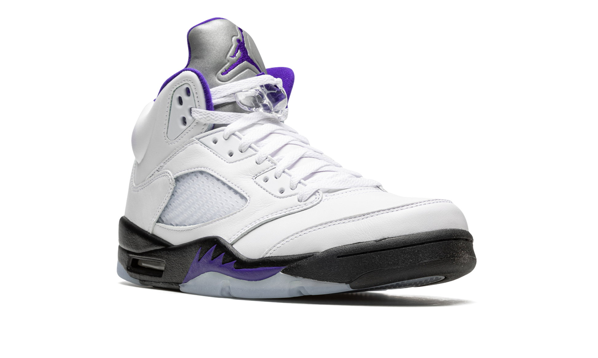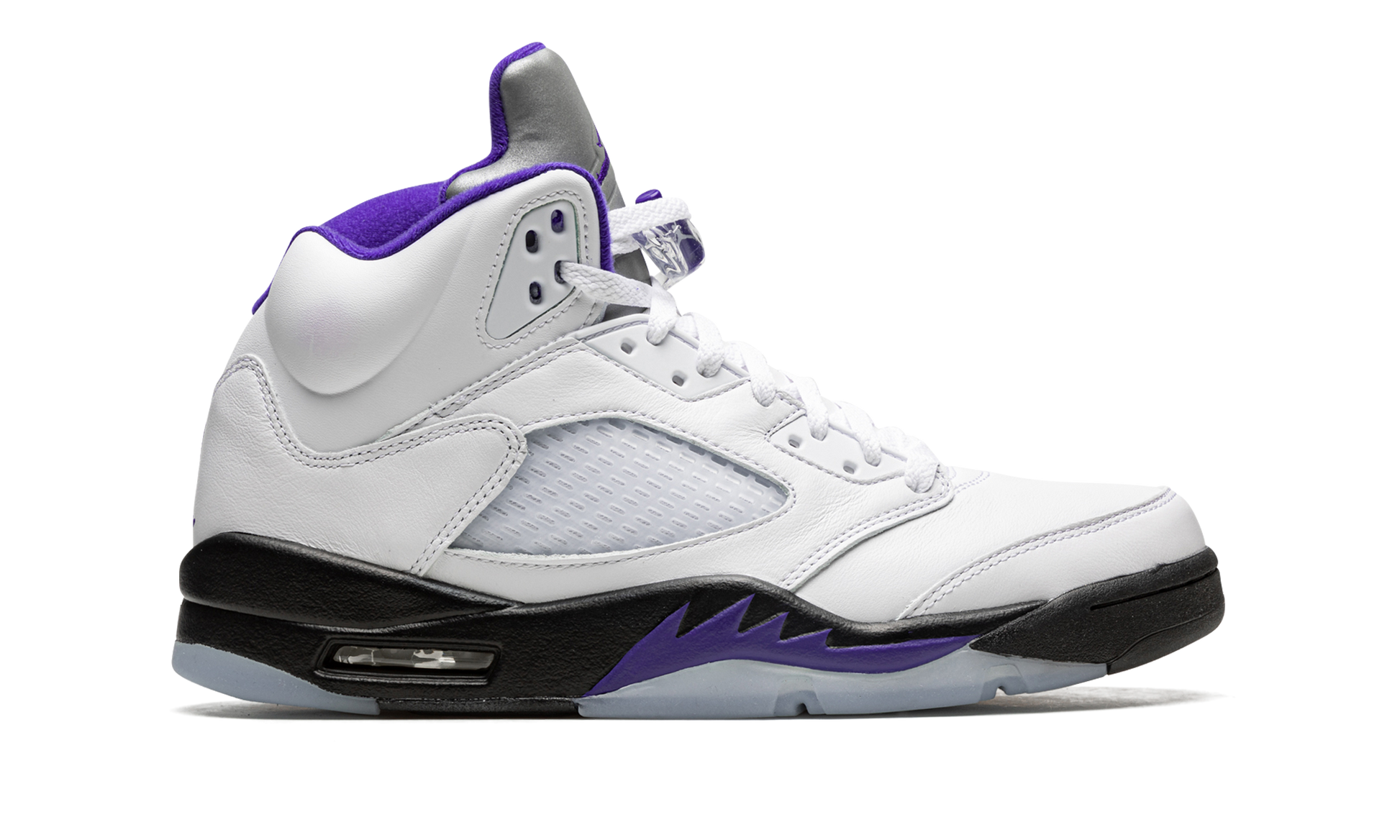 The Air Jordan 5 “Concord” is an August 2022 release of Michael Jordan’s fifth signature shoe in a colorway inspired by the beloved Air Jordan 11. The “Concord” theme was introduced on the Jordan 11 back in 1996, and is one of the most popular colorways in sneaker history. Here, on the Jordan 5, the “Concord” features the same color block as the model’s classic “Fire Red” colorway, albeit with purple accents instead of red detailing per the original version. The upper is constructed from white leather. Translucent mesh is found on the mid-panel and lower tongue. A purple or Concord-colored Jumpman is embroidered on the heel. Additional Concord accenting can be found on the Jumpman on the reflective Metallic Silver tongue, on the collar, on the underside of the tongue, and on the shark tooth detailing on the black painted midsole. Release date: August 13, 2022 Concord