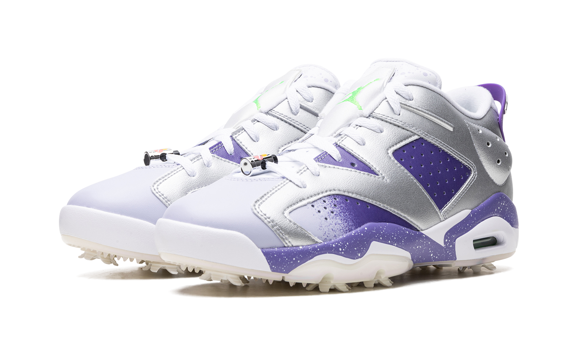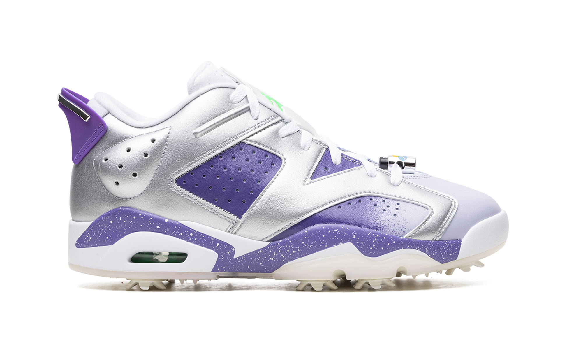 The Air Jordan 6 Low Golf "U.S. Open" is the alternate golf version of the sixth Air Jordan that celebrates the PGA Championship. The Jordan 6 Low Golf “U.S. Open” features a purple airbrush effect with Metallic Silver leather overlays throughout the design. A silver Jumpman is embroidered on the back of the shoe while a neon green Jumpman is embroidered on the tongue overlay. The mid-panel is painted purple with white speckle detailing. Underfoot, nubs on the outsole provide traction on a golf course. Release date: June 16, 2023 U.S. Open