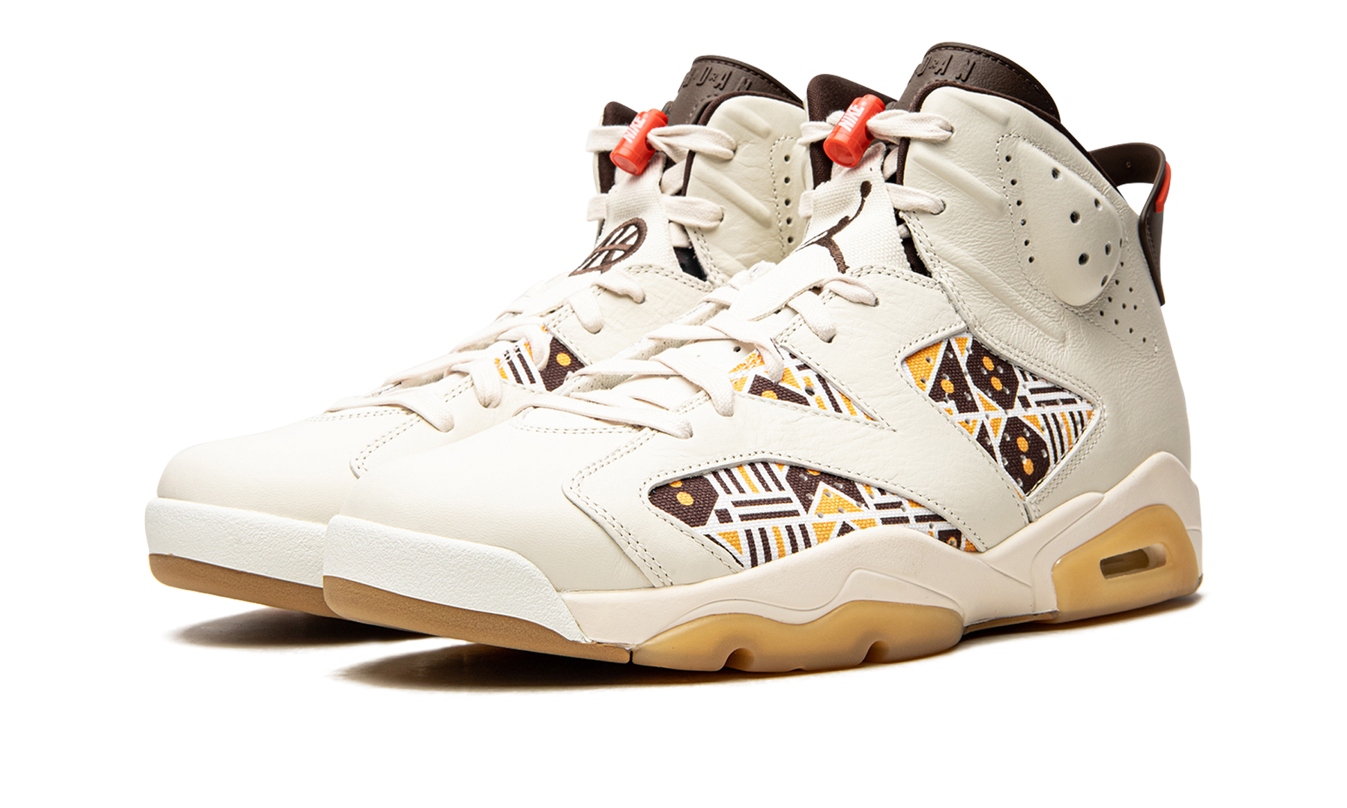 The Air Jordan 6 “Quai 54” is one of two colorways released by Jordan Brand in 2020 that coincides with the annual streetball tournament in Paris, France. Both colorways of Michael Jordan’s beloved sixth signature shoe display a Sail leather base with patterned textile underlaid panels on either side. This version features an orange and maroon multidirectional motif within the aforementioned design found on the mid-panel. Brown embroidered Jumpman branding can be found on the cream colored nylon overlay on the tongue. The red lace toggle features a white Jumpman logo and co-branded “Nike Air” and “Quai 54” embroidery graces the left and right heel, respectively. Release date: August 8, 2020. Quai 54