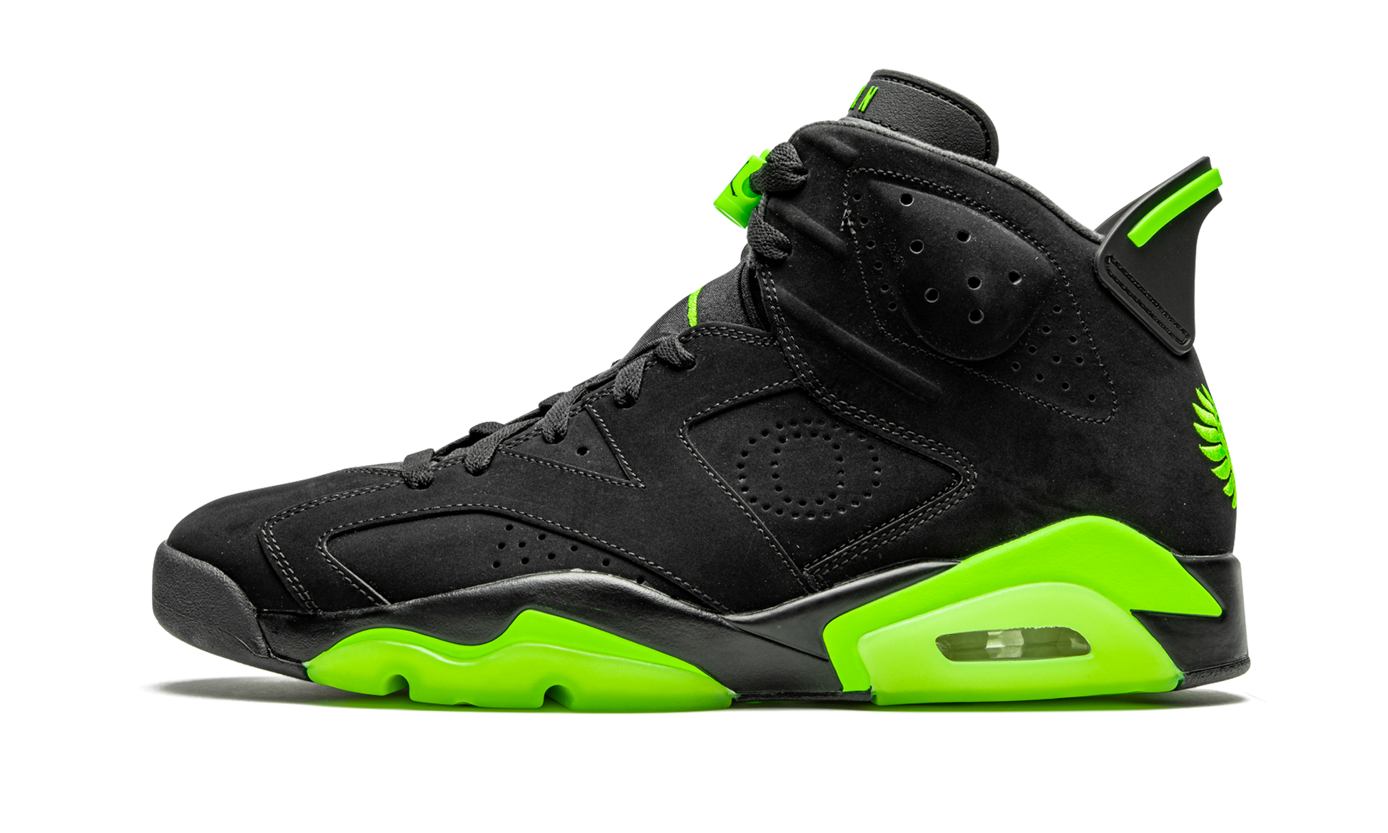 The Air Jordan 6 “Oregon Ducks PE” is a highly desirable, limited edition colorway given to student athletes on the Oregon Ducks sports teams. Unreleased to the general public, this Jordan 6 “Oregon Ducks PE” is one of several imaginative Air Jordans created exclusively for the Oregon Ducks. The upper features a black nubuck construction. Tonal overlays can be found on the forefoot, mid-panel, and heel. Contrasting neon green accents dot the Jumpman on the black nylon tongue, the lace lock, spoiler, and “Air Jordan” branding on the tongue. Additionally, specially perforated “O” logos can be found on either side and the Ducks’ “Wings” logo is embroidered on the heel.